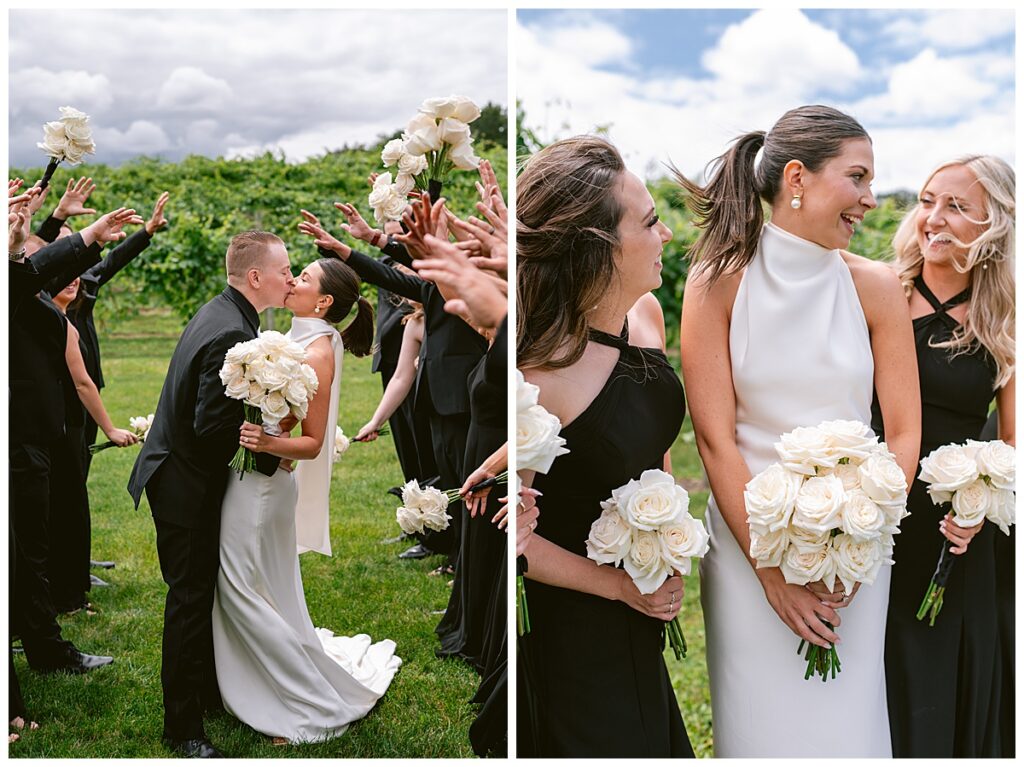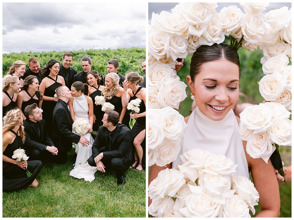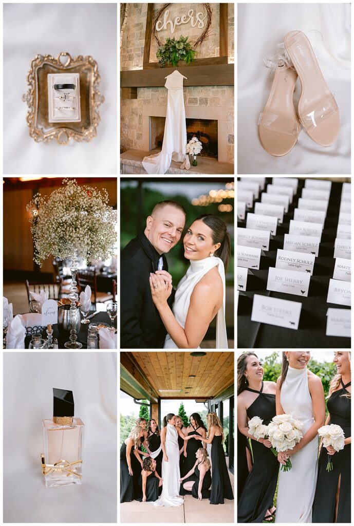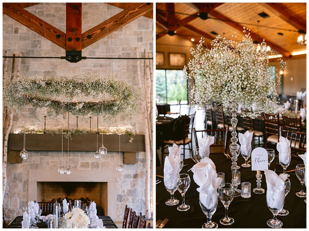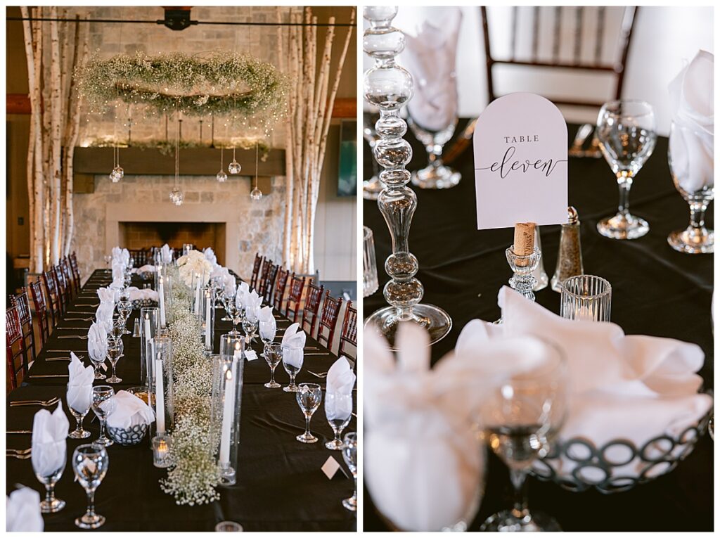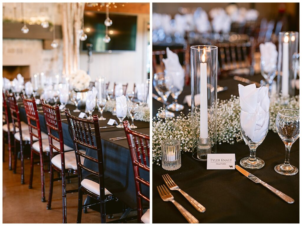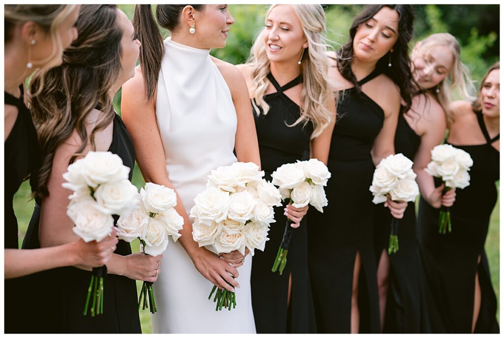 The wedding day was a classic affair adorned in blacks and whites. Katie’s bridesmaids looked timeless in their elegant black dresses from Azazie, each carrying a bouquet of white roses arranged by Laurie LeClair from Flore Inspired. The ceremony took place under an altar beautifully decorated with baby’s breath, which also adorned the table arrangements in big, stunning bouquets.