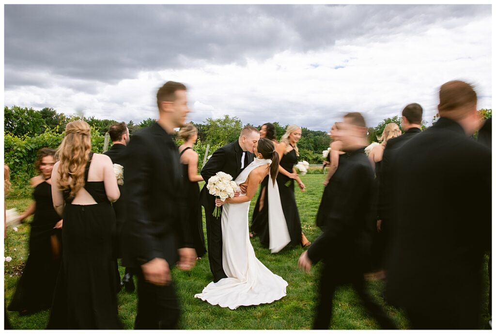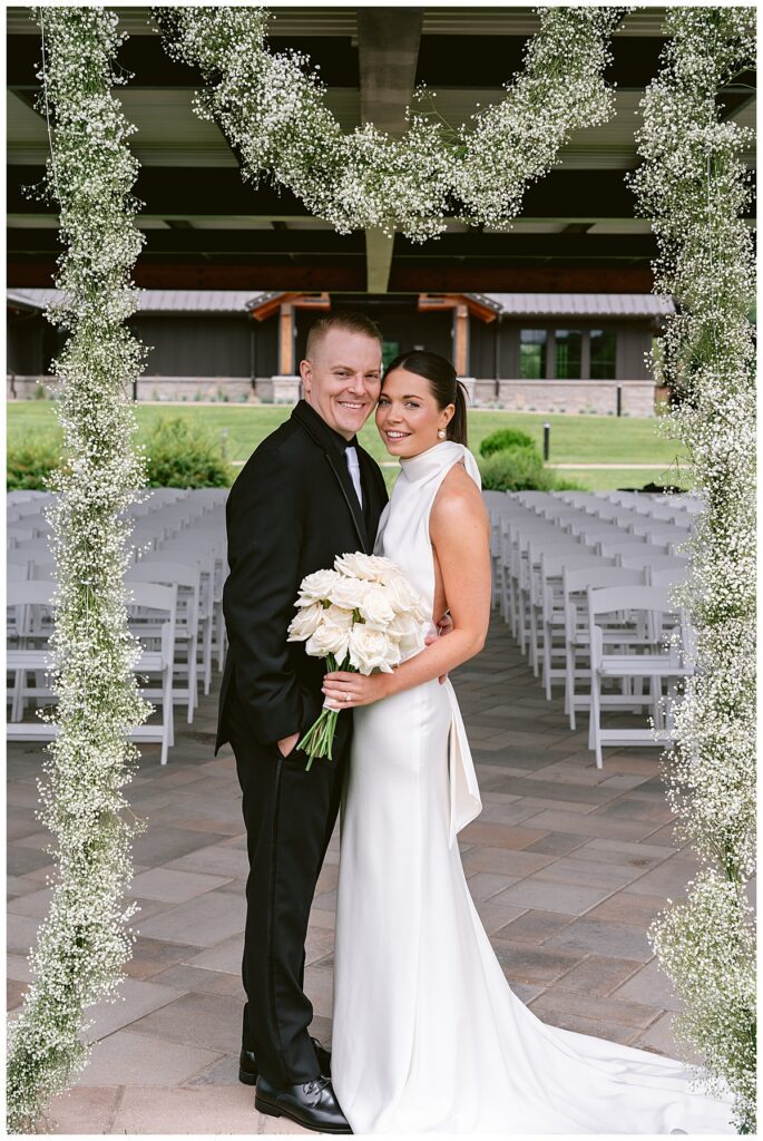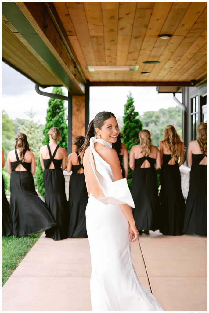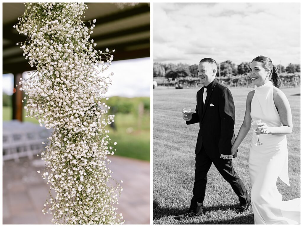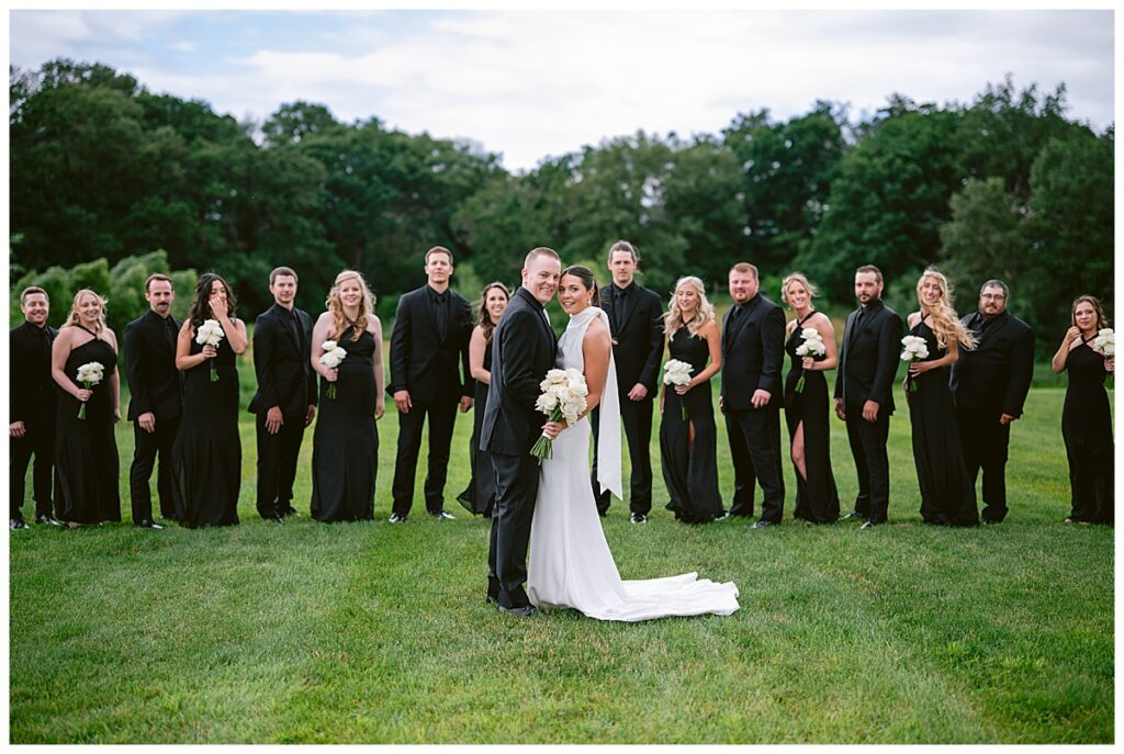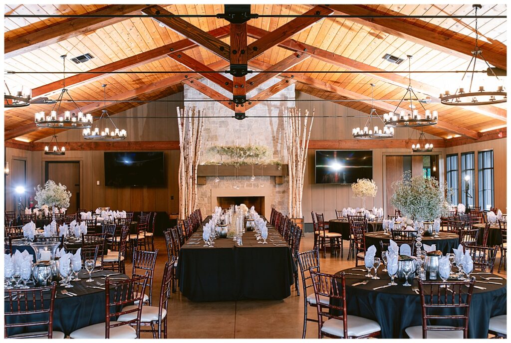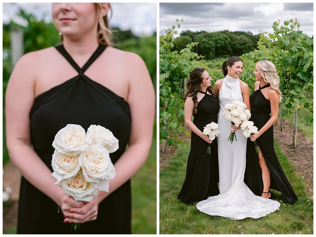 The wedding day was a classic affair adorned in blacks and whites. Katie’s bridesmaids looked timeless in their elegant black dresses from Azazie, each carrying a bouquet of white roses arranged by Laurie LeClair from Flore Inspired. The ceremony took place under an altar beautifully decorated with baby’s breath, which also adorned the table arrangements in big, stunning bouquets.