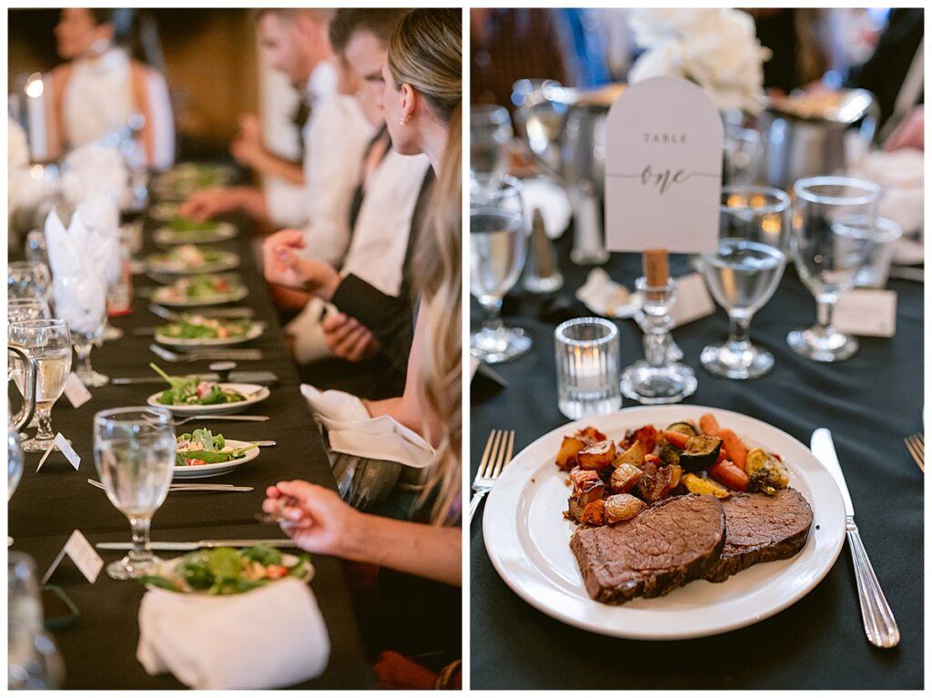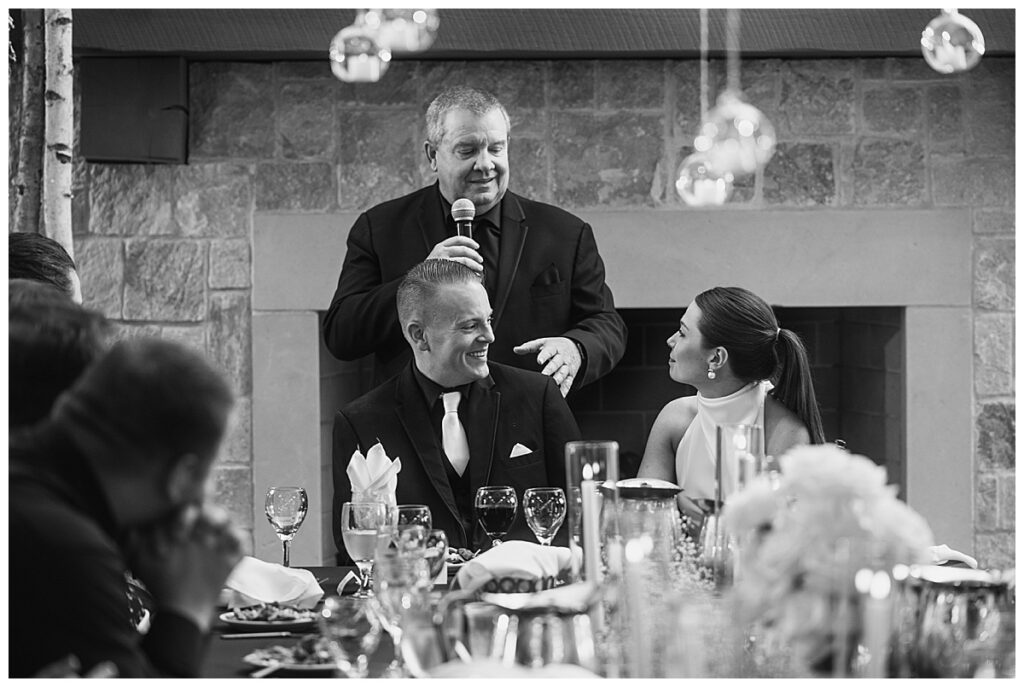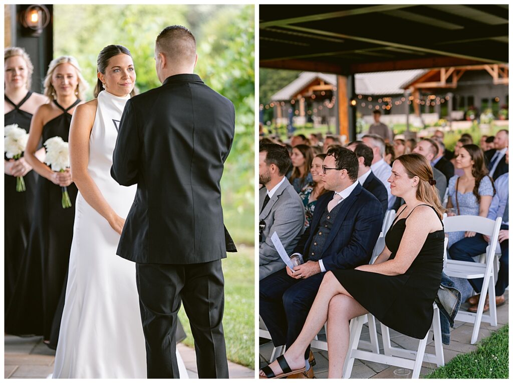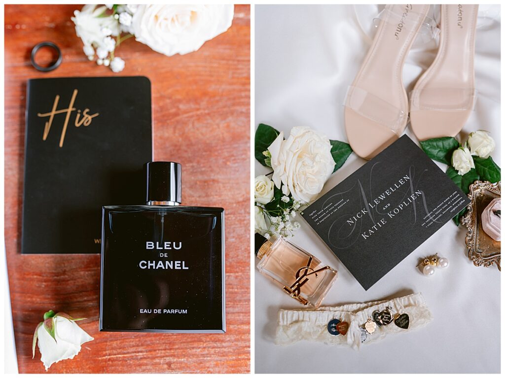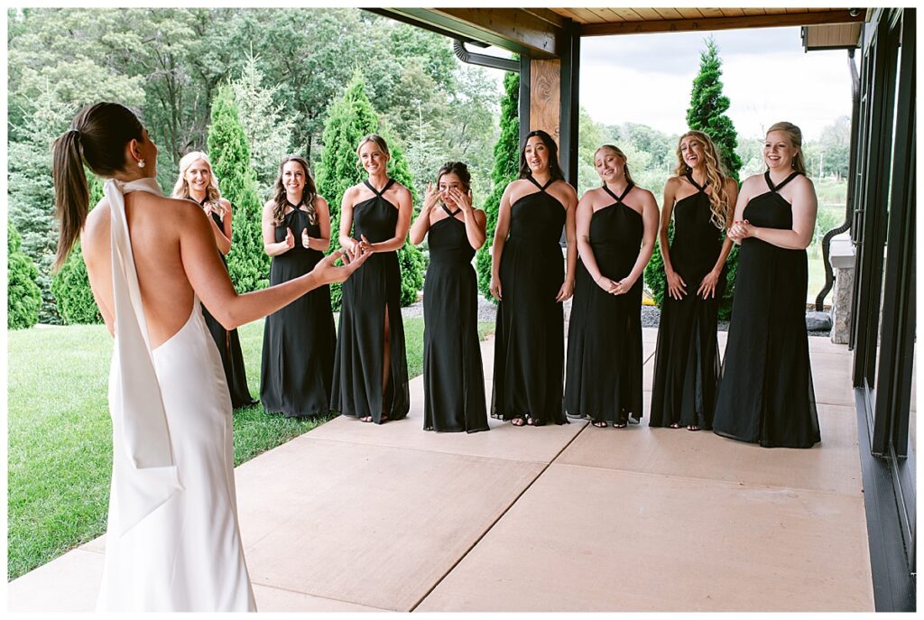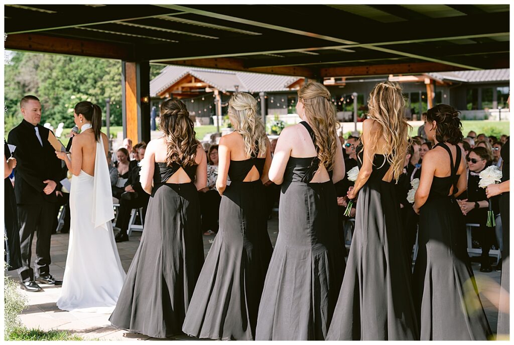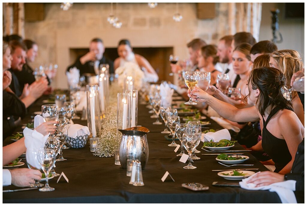 The wedding day was a classic affair adorned in blacks and whites. Katie’s bridesmaids looked timeless in their elegant black dresses from Azazie, each carrying a bouquet of white roses arranged by Laurie LeClair from Flore Inspired. The ceremony took place under an altar beautifully decorated with baby’s breath, which also adorned the table arrangements in big, stunning bouquets.