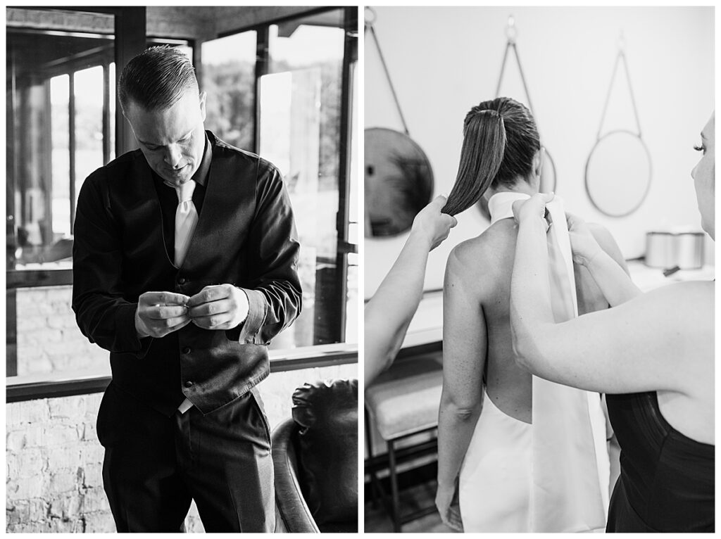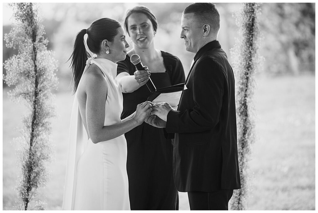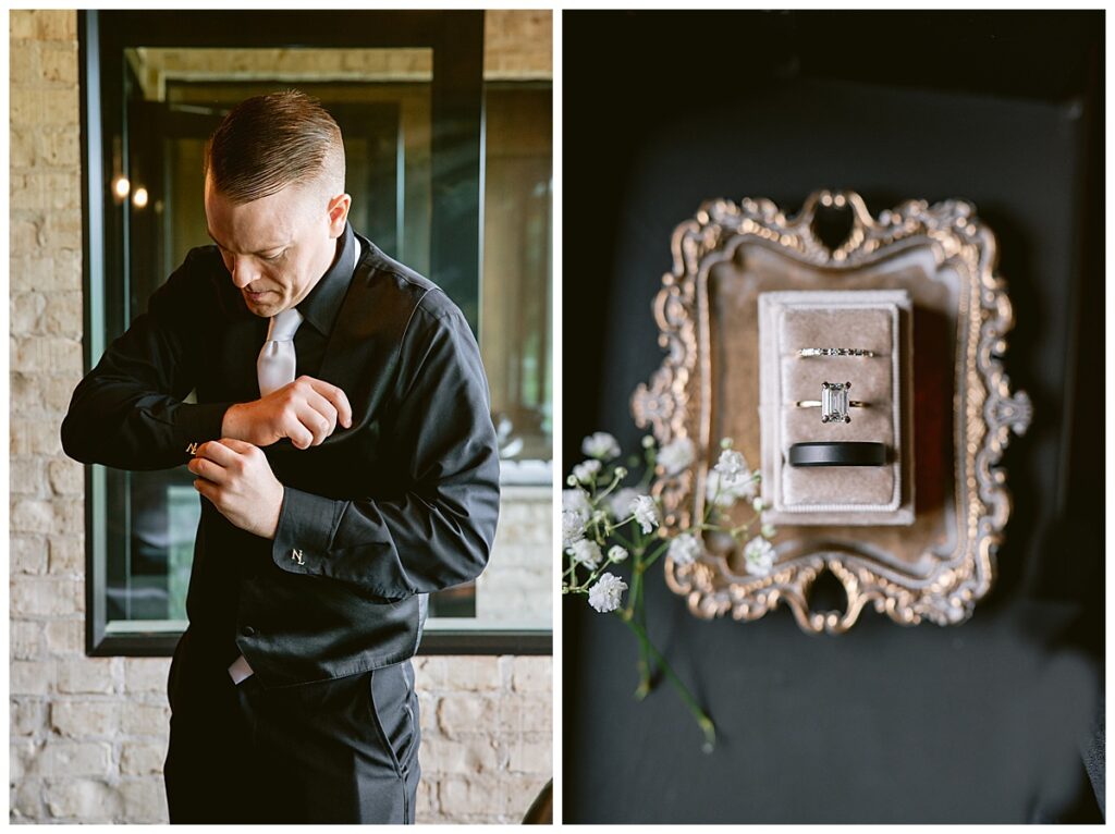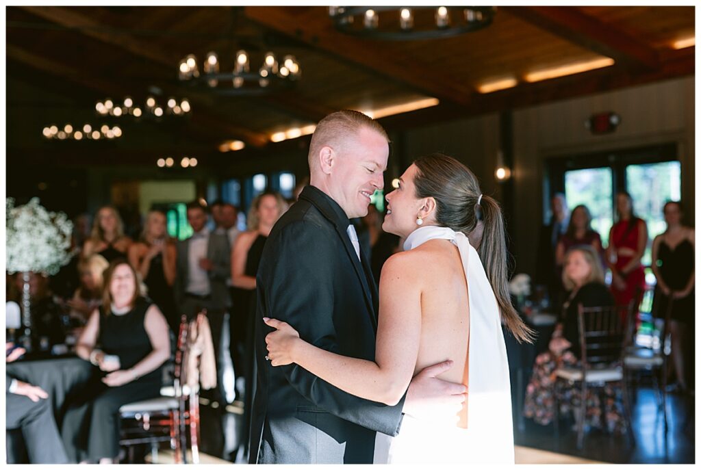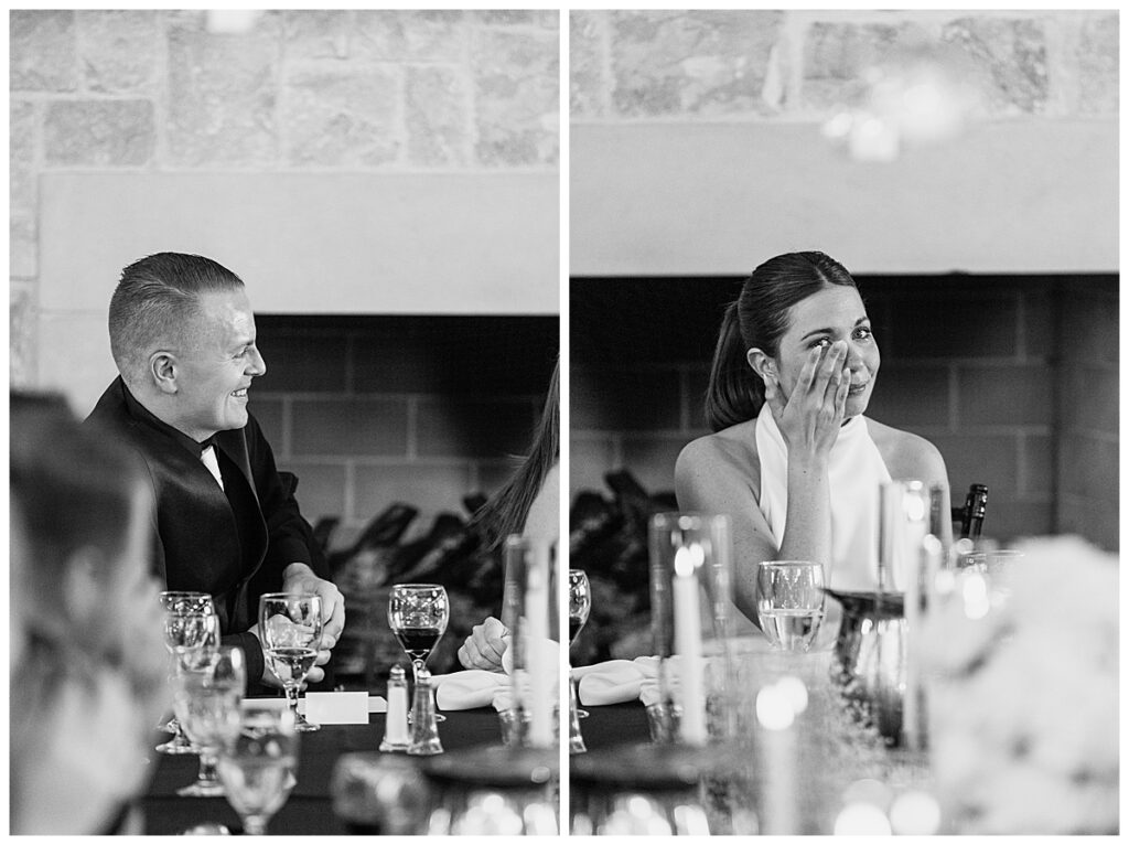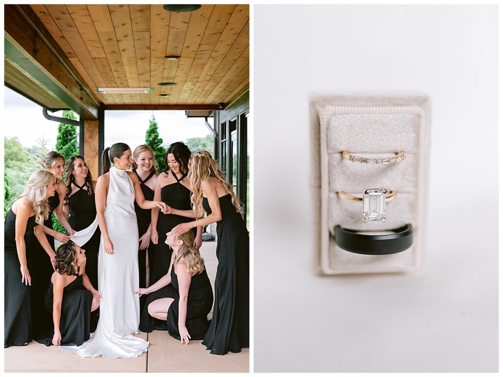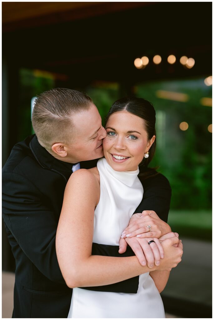 The wedding day was a classic affair adorned in blacks and whites. Katie’s bridesmaids looked timeless in their elegant black dresses from Azazie, each carrying a bouquet of white roses arranged by Laurie LeClair from Flore Inspired. The ceremony took place under an altar beautifully decorated with baby’s breath, which also adorned the table arrangements in big, stunning bouquets.
