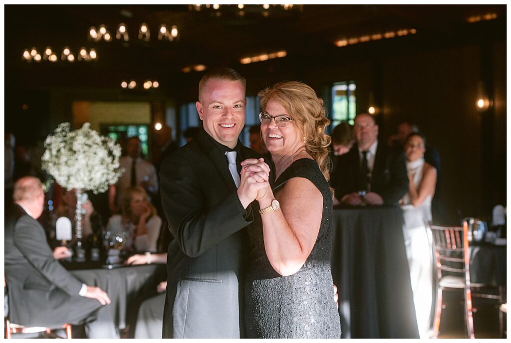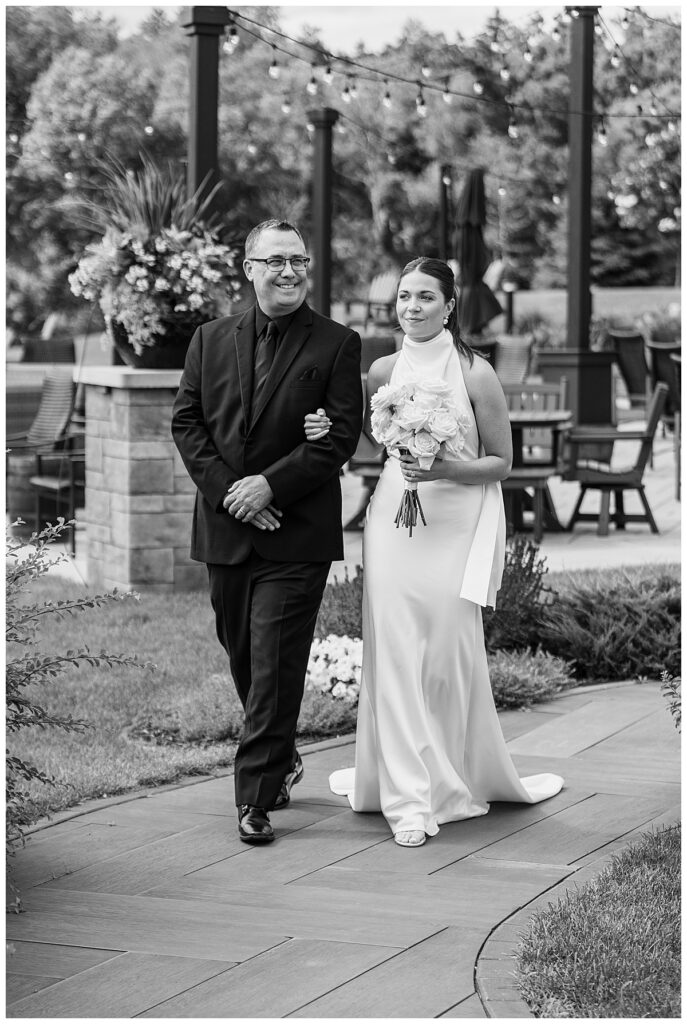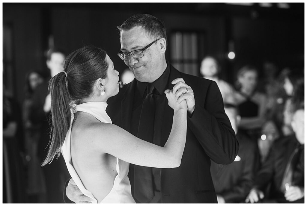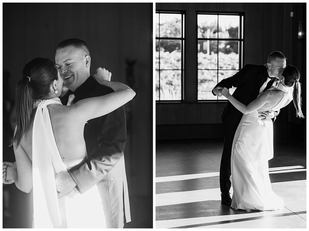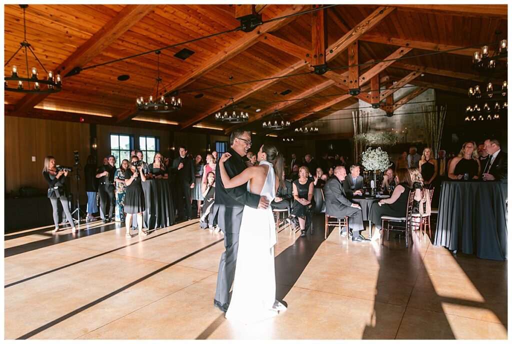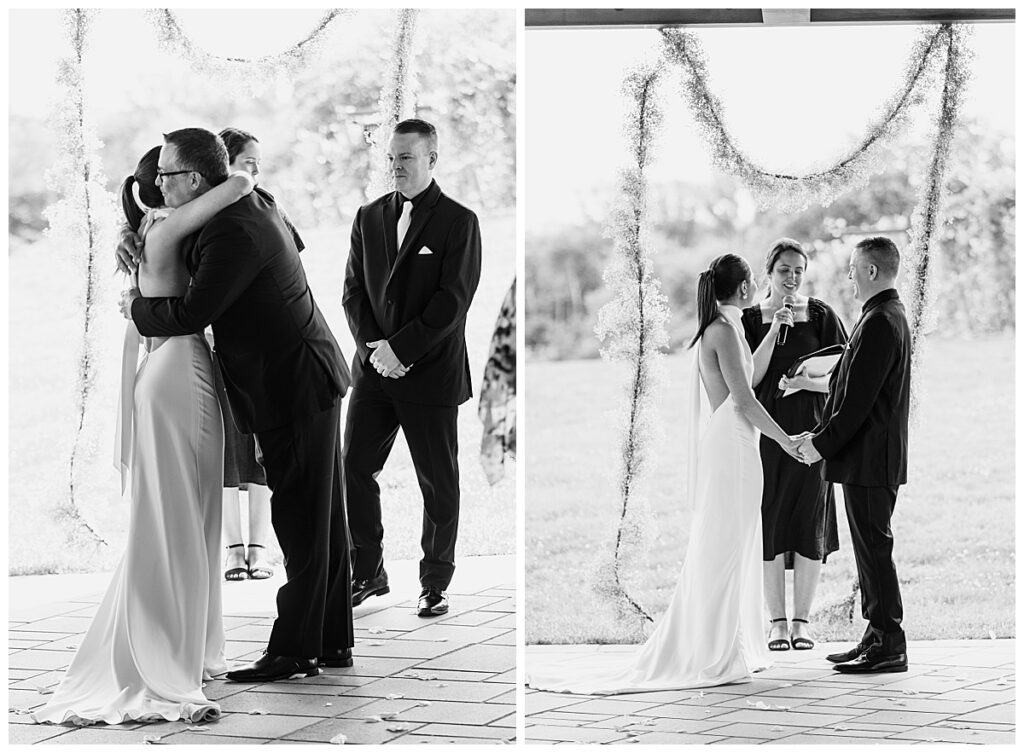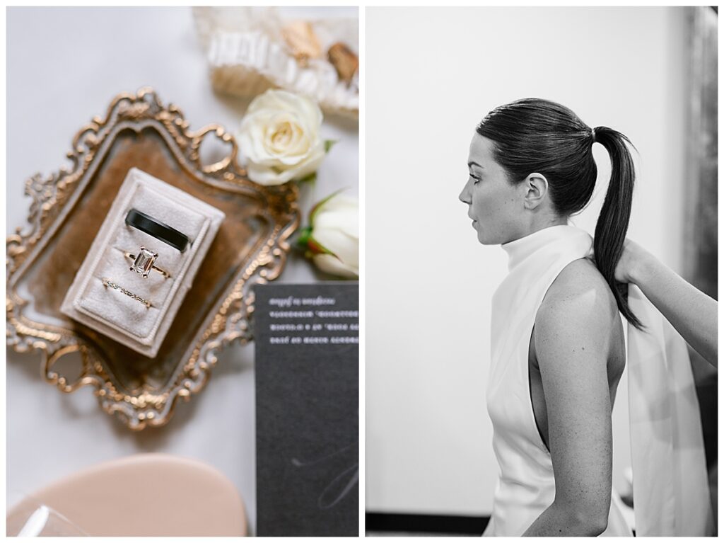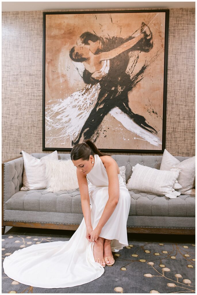 The wedding day was a classic affair adorned in blacks and whites. Katie’s bridesmaids looked timeless in their elegant black dresses from Azazie, each carrying a bouquet of white roses arranged by Laurie LeClair from Flore Inspired. The ceremony took place under an altar beautifully decorated with baby’s breath, which also adorned the table arrangements in big, stunning bouquets.