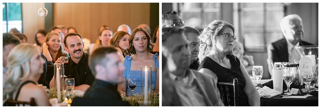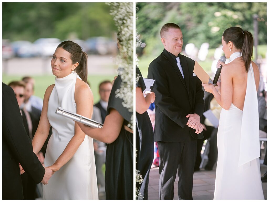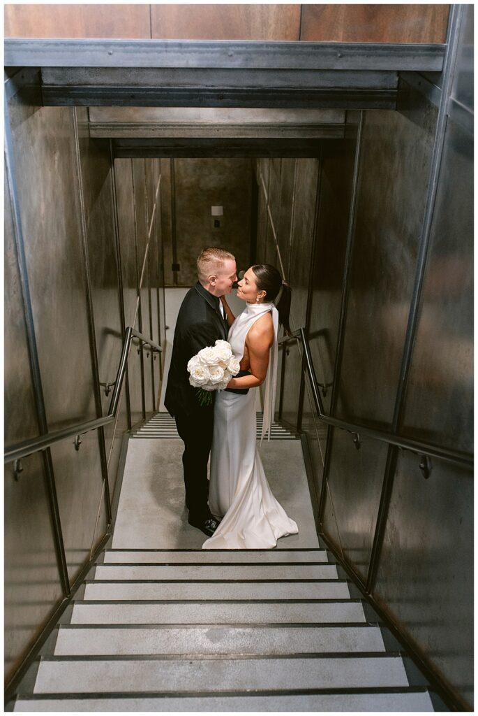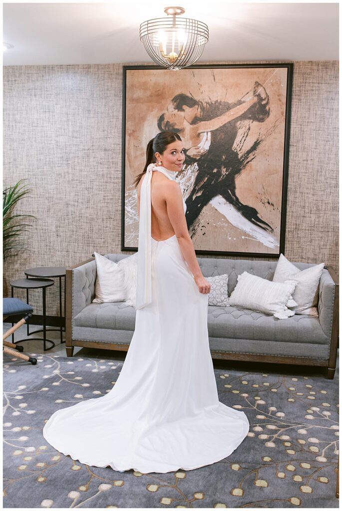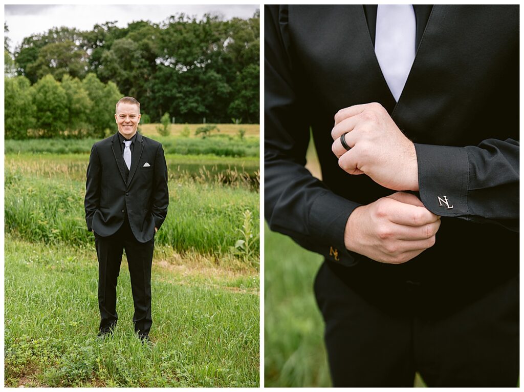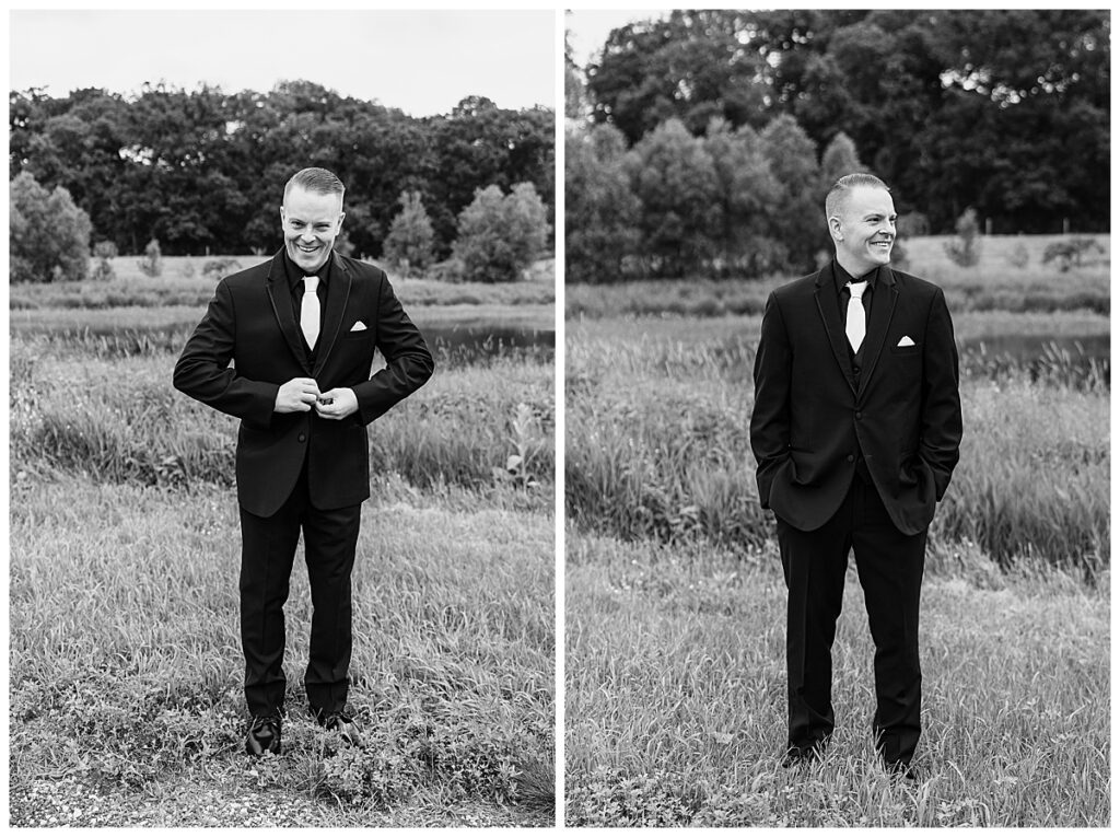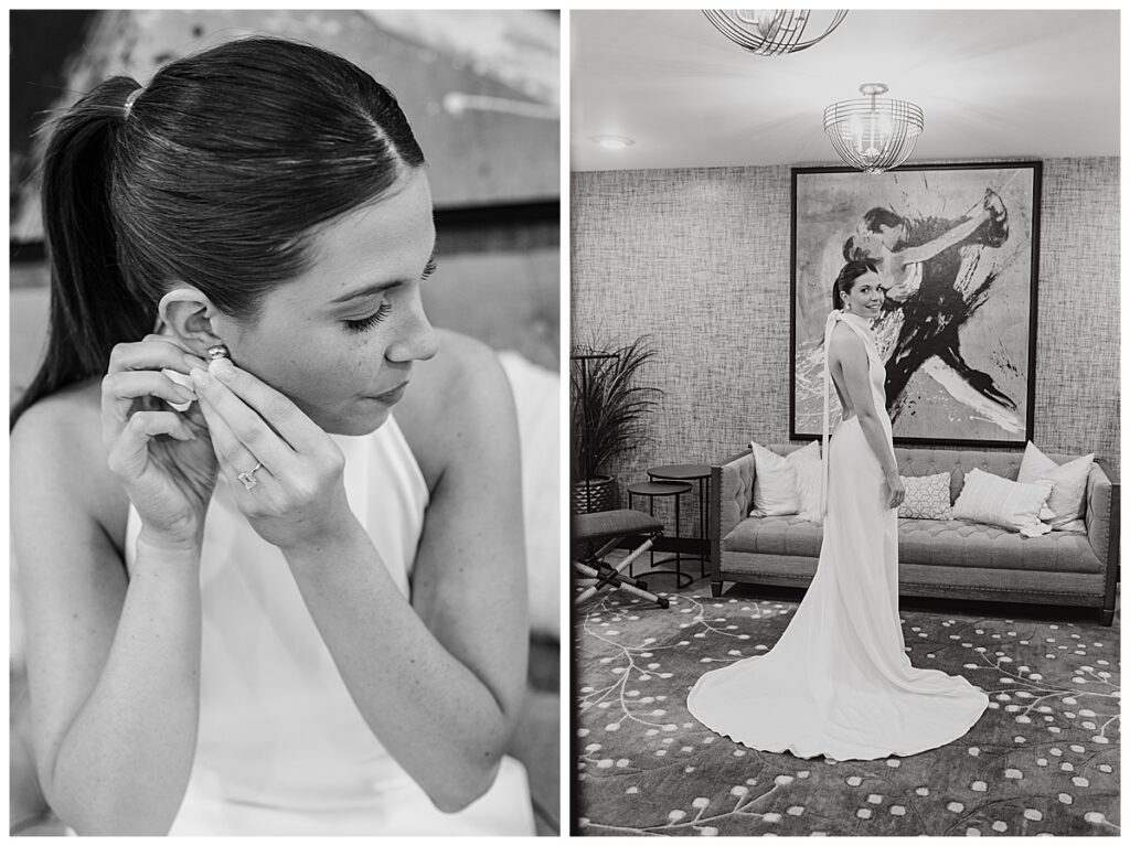 The wedding day was a classic affair adorned in blacks and whites. Katie’s bridesmaids looked timeless in their elegant black dresses from Azazie, each carrying a bouquet of white roses arranged by Laurie LeClair from Flore Inspired. The ceremony took place under an altar beautifully decorated with baby’s breath, which also adorned the table arrangements in big, stunning bouquets.