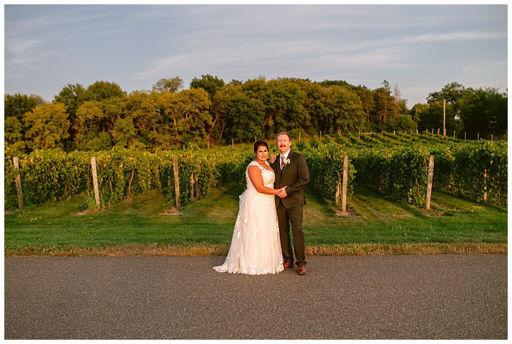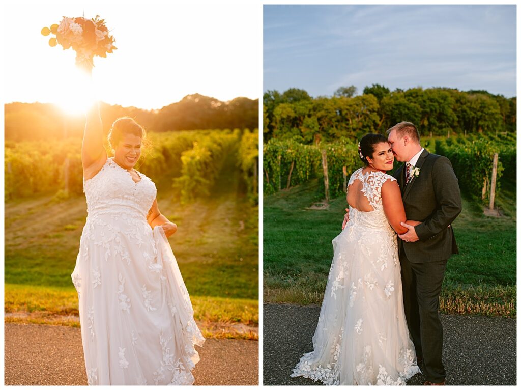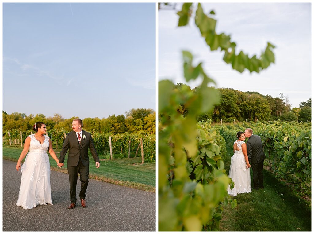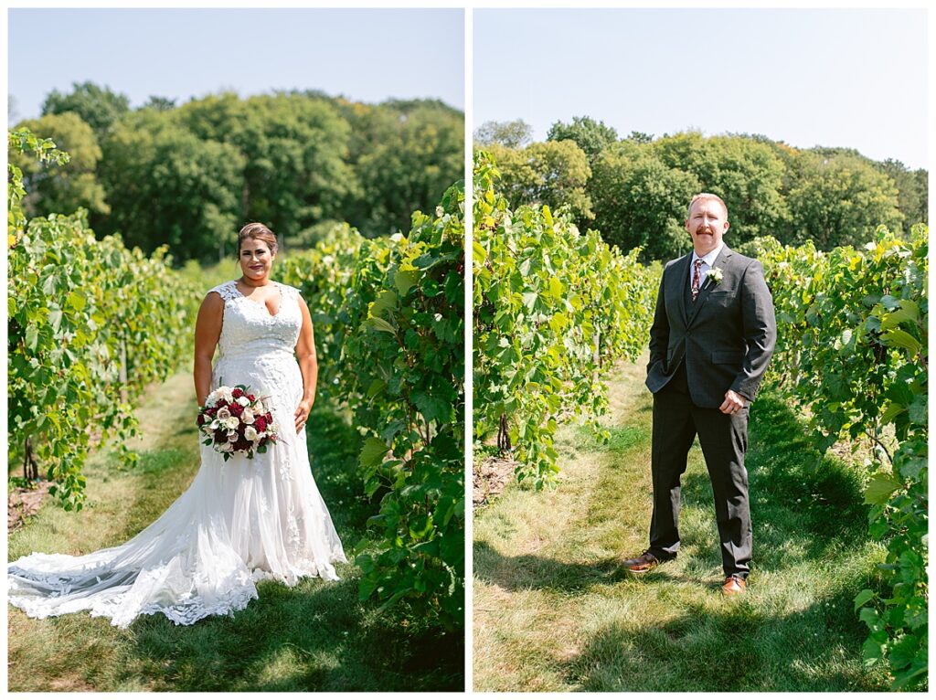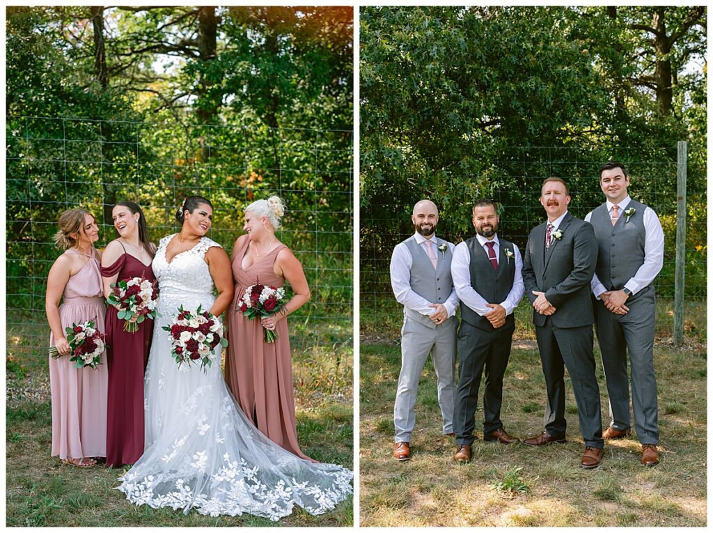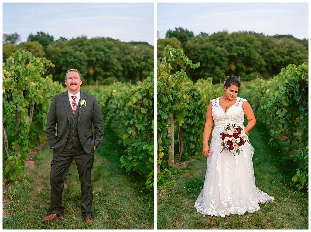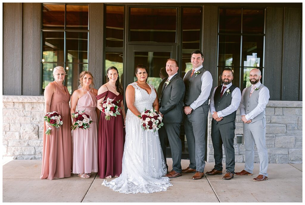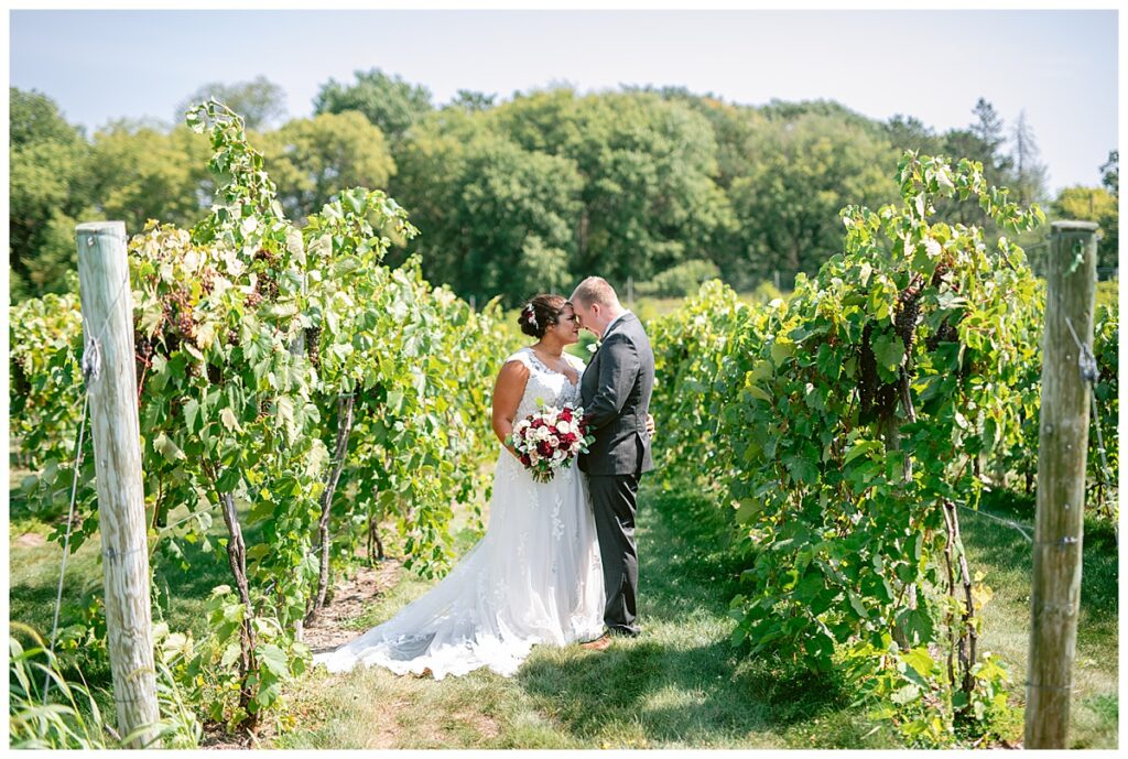 Their beautiful September day begin with hair and make up done by the talented team of Jamie Champion and continued as Justine slipped into her beautiful gown purchased from EDEL bridal boutique in Maryland where Justine grew up. The bridesmaids all wore a variety of mauve and burgundy dresses purchased from Birdy Gray which were paired with beautiful bouquets of dahlias and white roses created by Forever in Bloom. Their simple invitations from The Knot were the perfect touch to getting guests to the beautiful 7 Vines Vineyard in Dellwood, Minnesota where the ceremony and reception both took place.