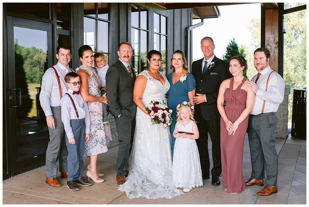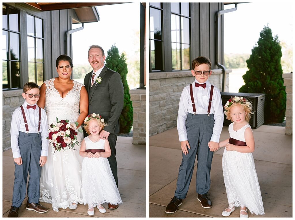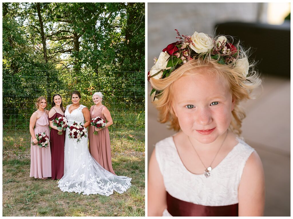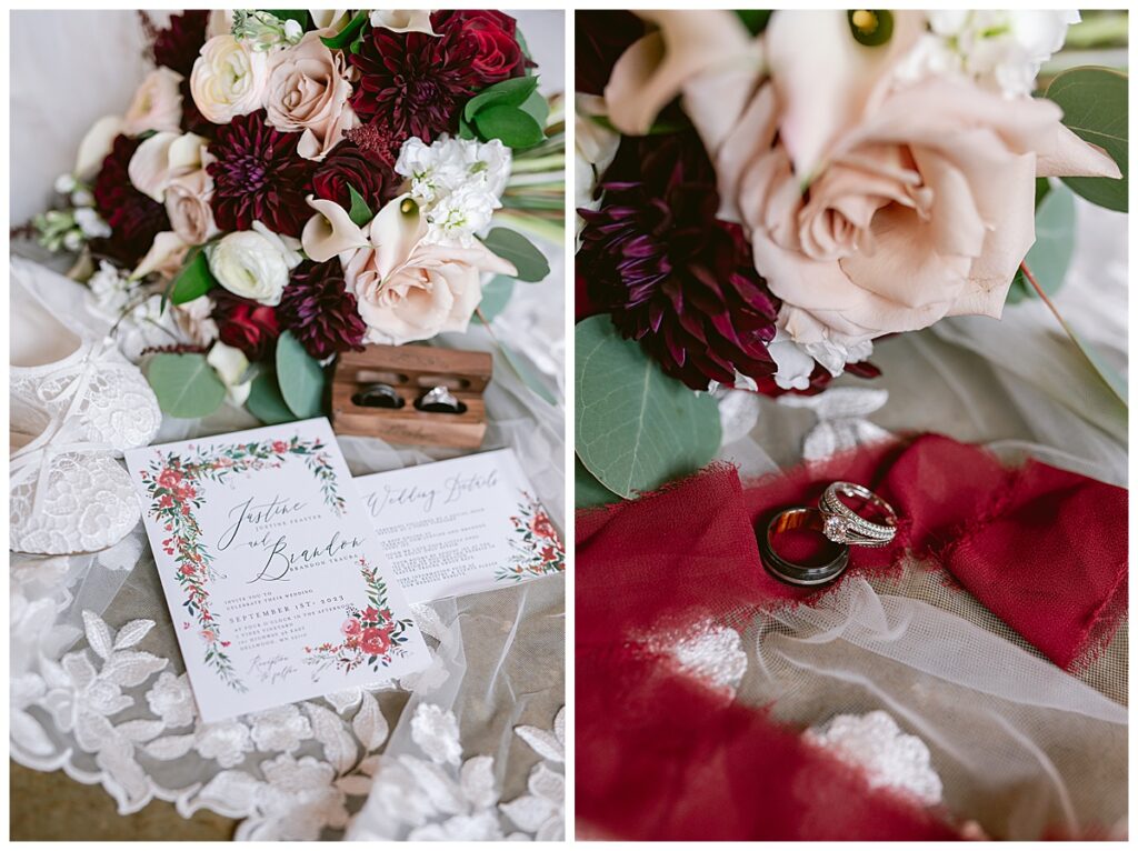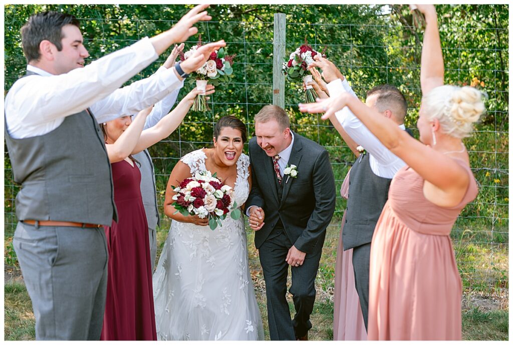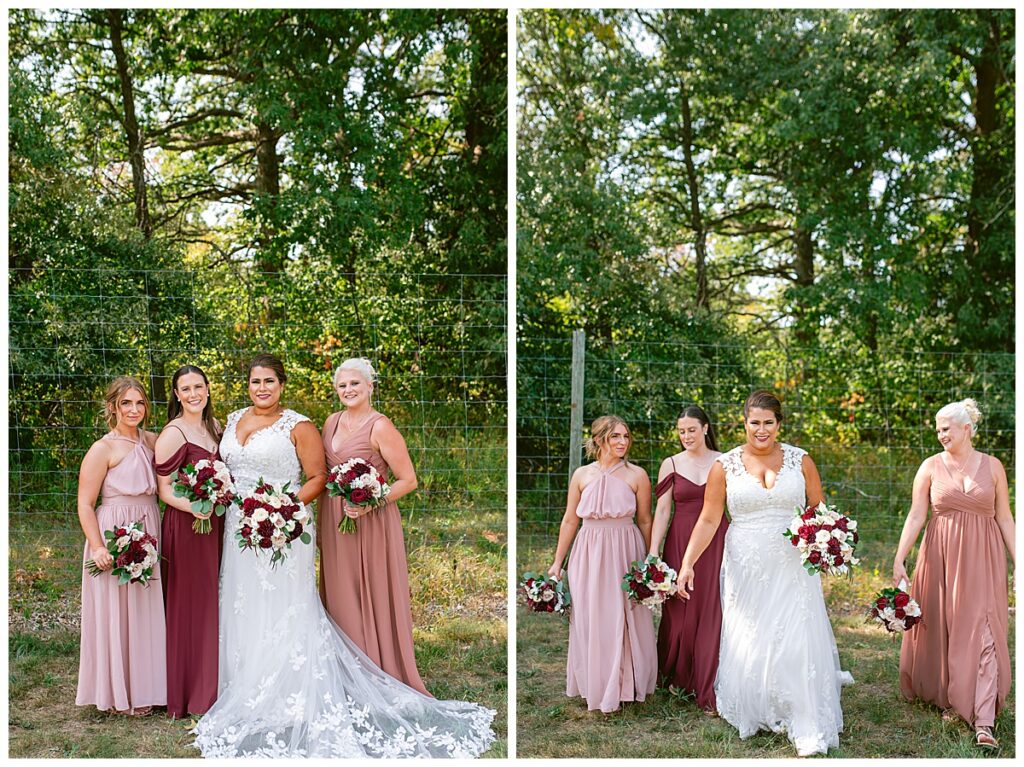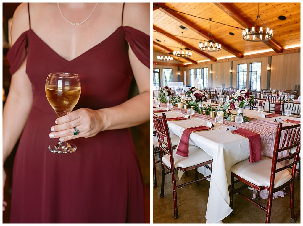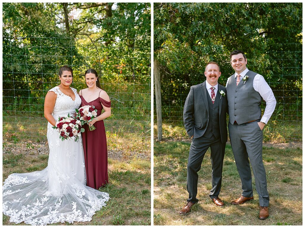 Their beautiful September day begin with hair and make up done by the talented team of Jamie Champion and continued as Justine slipped into her beautiful gown purchased from EDEL bridal boutique in Maryland where Justine grew up. The bridesmaids all wore a variety of mauve and burgundy dresses purchased from Birdy Gray which were paired with beautiful bouquets of dahlias and white roses created by Forever in Bloom. Their simple invitations from The Knot were the perfect touch to getting guests to the beautiful 7 Vines Vineyard in Dellwood, Minnesota where the ceremony and reception both took place.