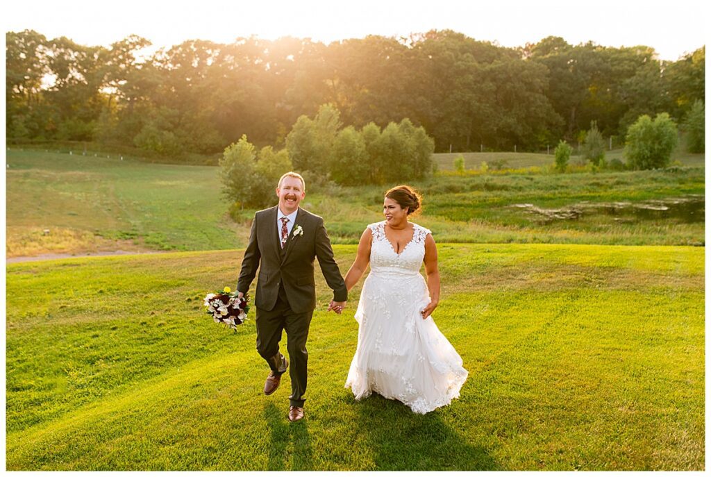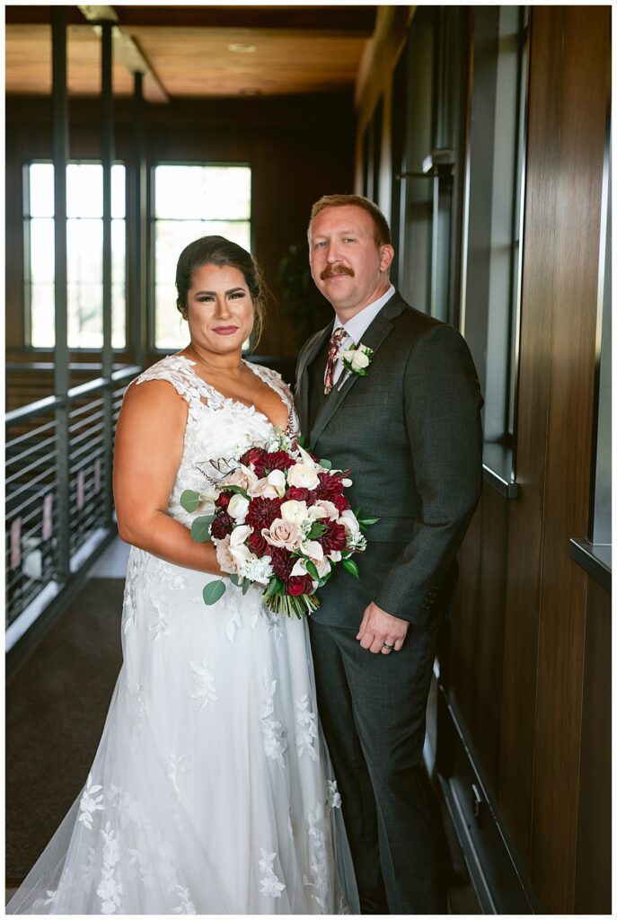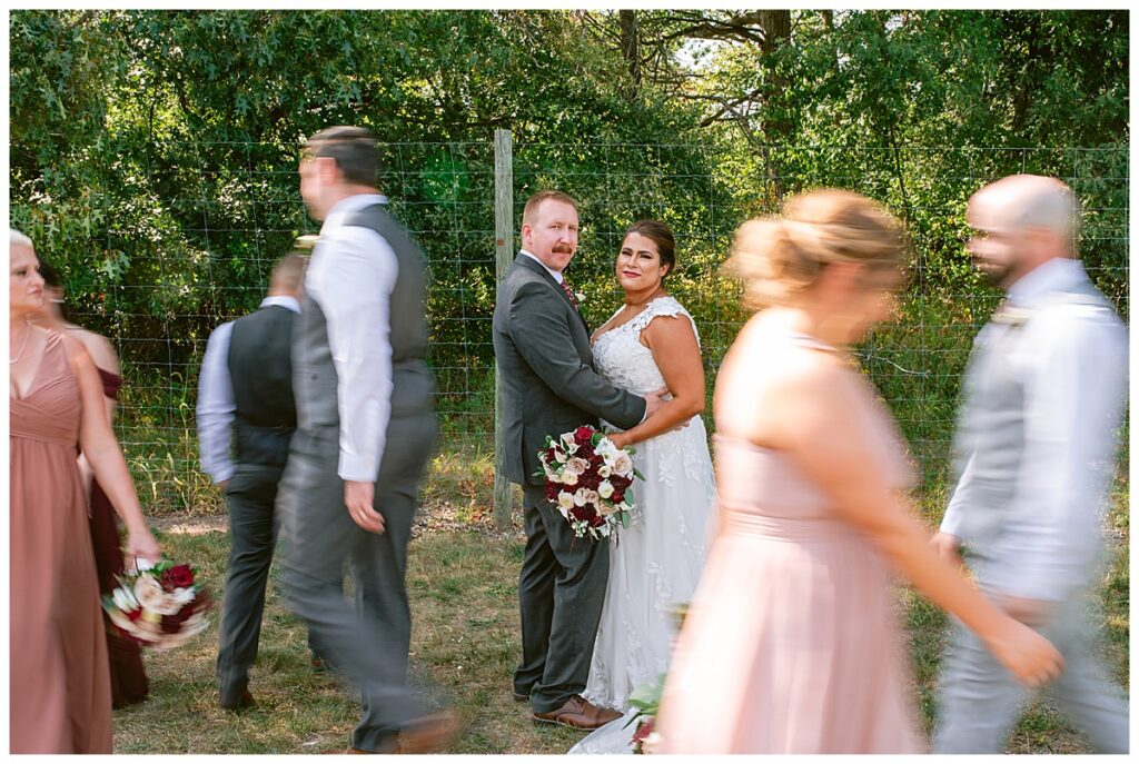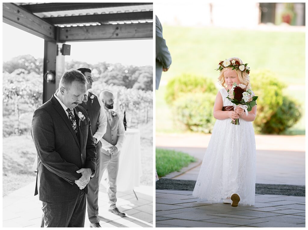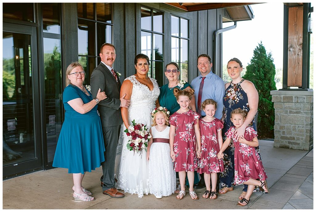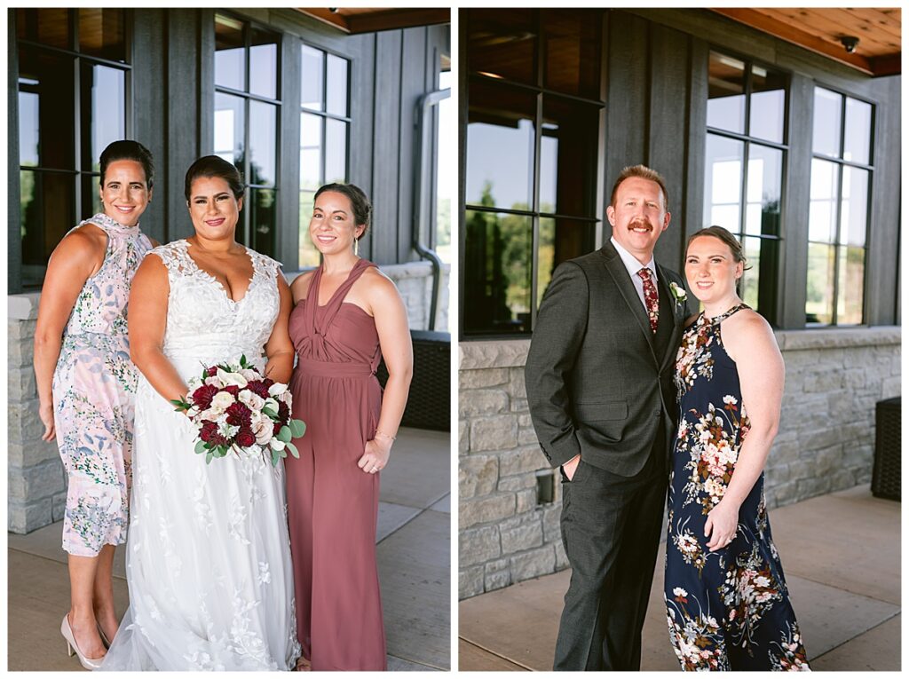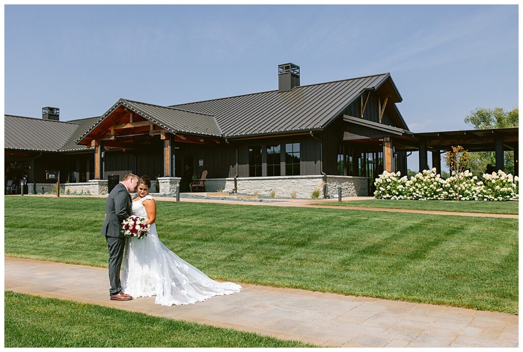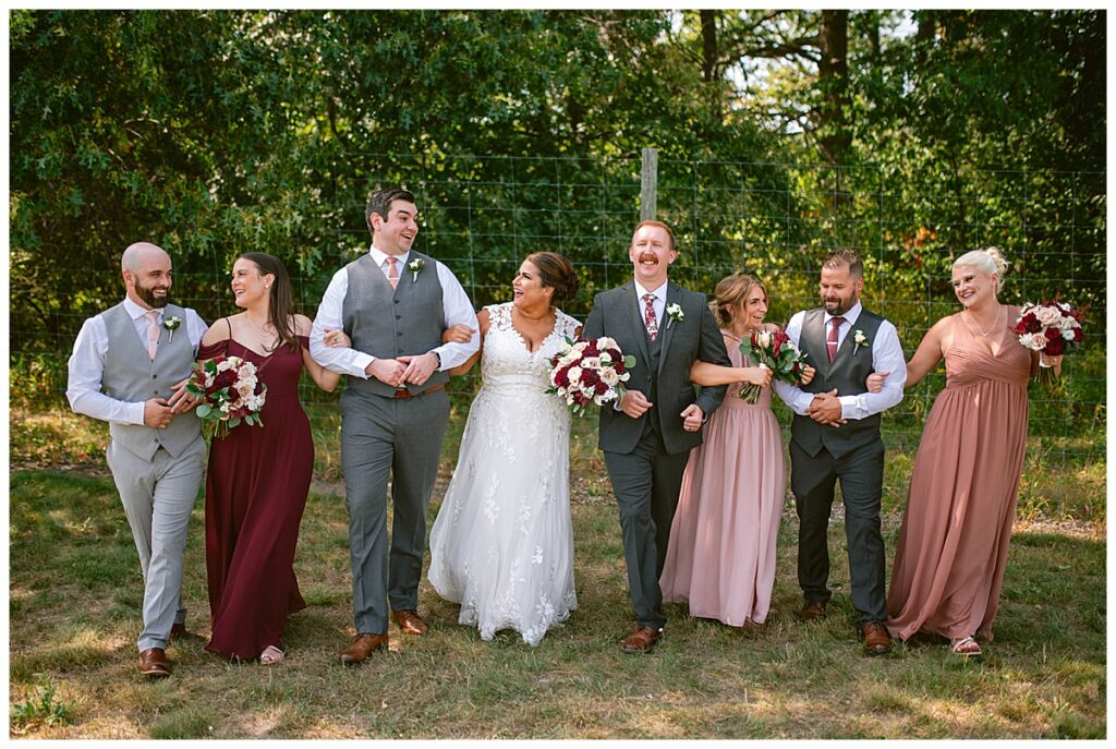 Their beautiful September day begin with hair and make up done by the talented team of Jamie Champion and continued as Justine slipped into her beautiful gown purchased from EDEL bridal boutique in Maryland where Justine grew up. The bridesmaids all wore a variety of mauve and burgundy dresses purchased from Birdy Gray which were paired with beautiful bouquets of dahlias and white roses created by Forever in Bloom. Their simple invitations from The Knot were the perfect touch to getting guests to the beautiful 7 Vines Vineyard in Dellwood, Minnesota where the ceremony and reception both took place.
