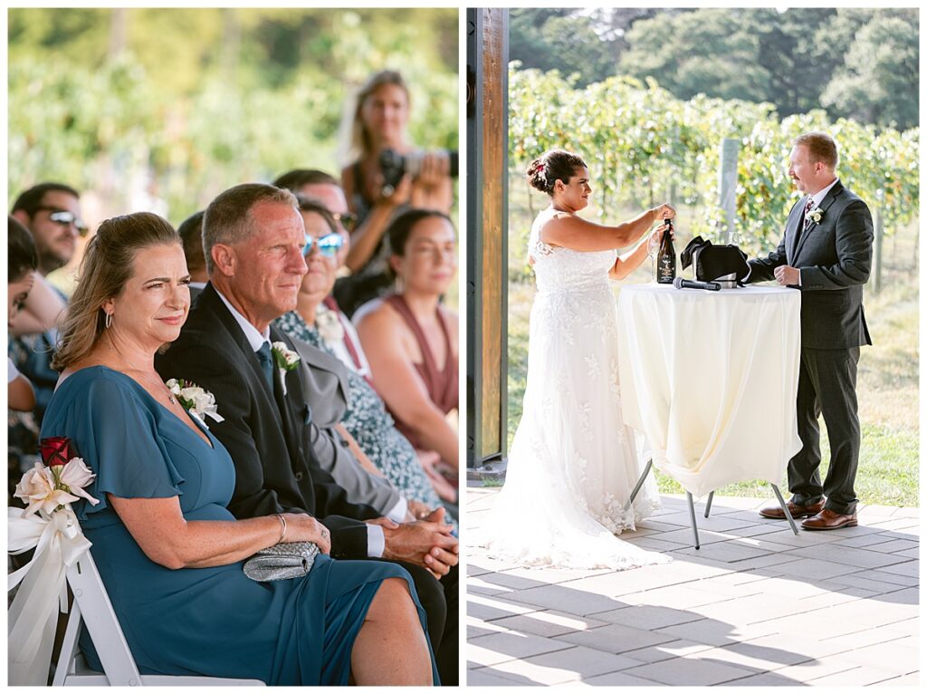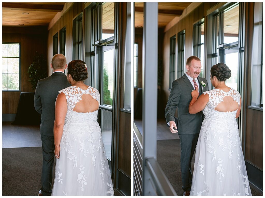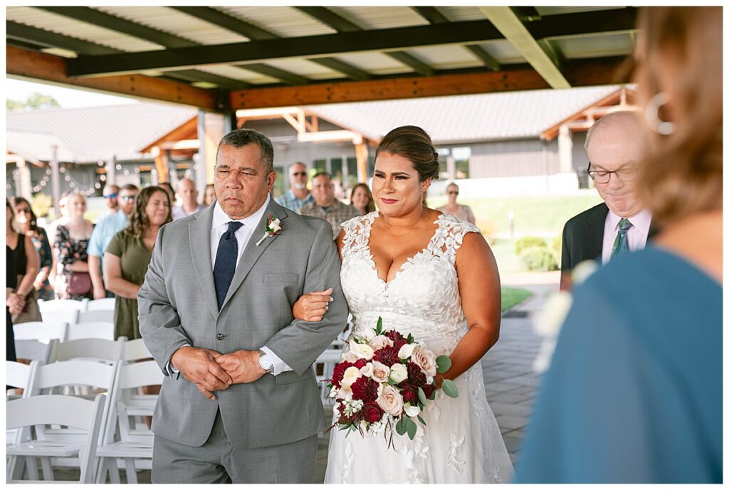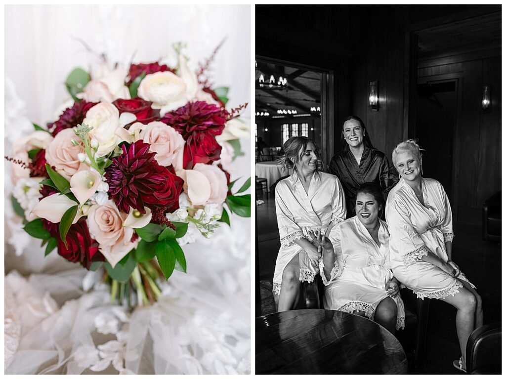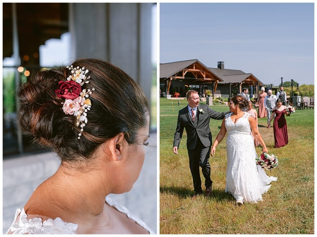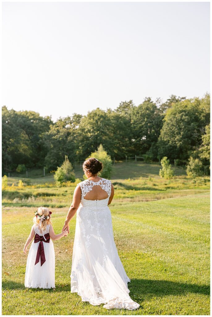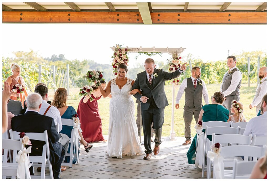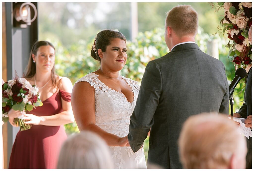 Their beautiful September day begin with hair and make up done by the talented team of Jamie Champion and continued as Justine slipped into her beautiful gown purchased from EDEL bridal boutique in Maryland where Justine grew up. The bridesmaids all wore a variety of mauve and burgundy dresses purchased from Birdy Gray which were paired with beautiful bouquets of dahlias and white roses created by Forever in Bloom. Their simple invitations from The Knot were the perfect touch to getting guests to the beautiful 7 Vines Vineyard in Dellwood, Minnesota where the ceremony and reception both took place.