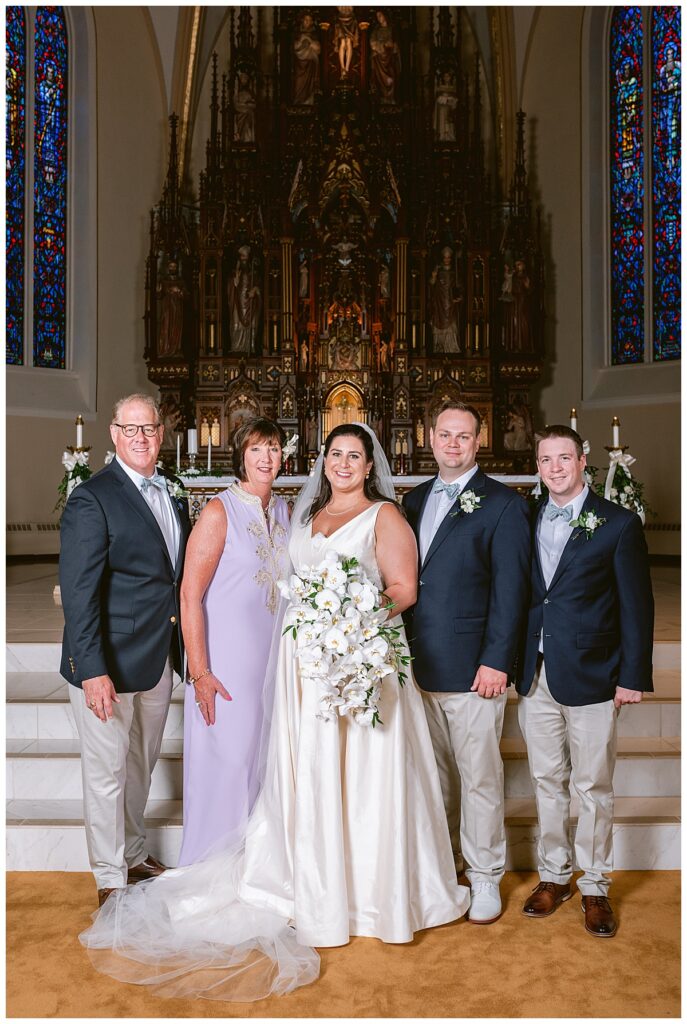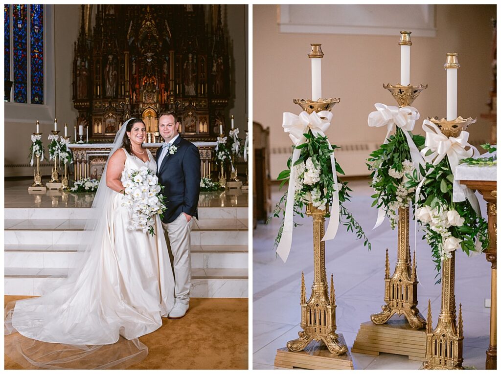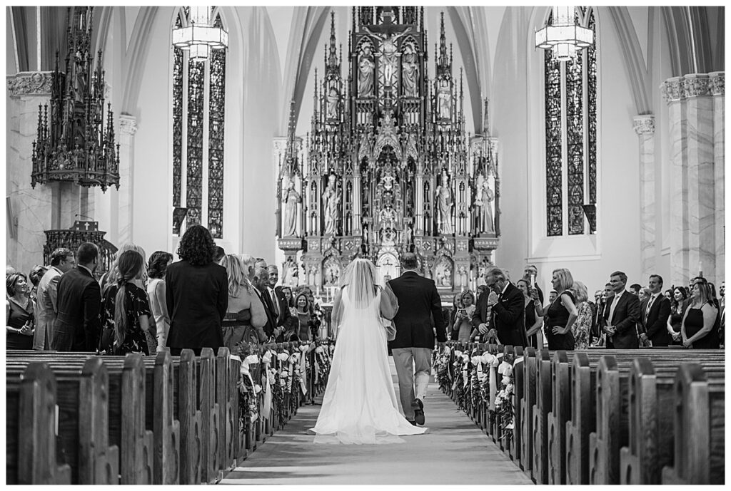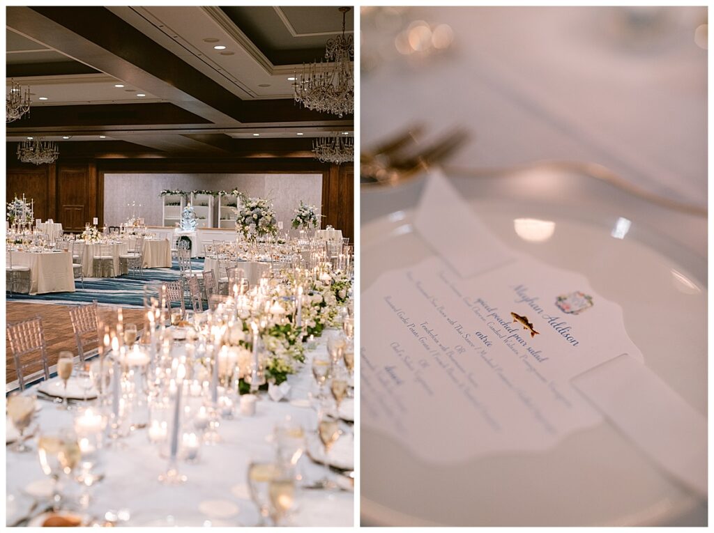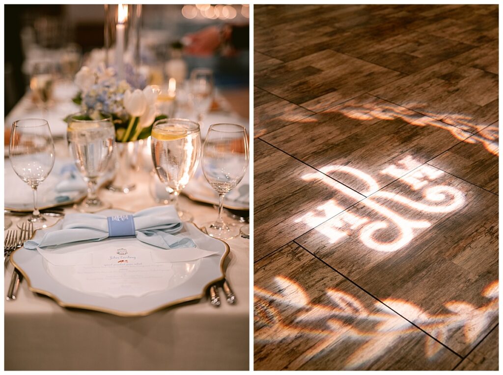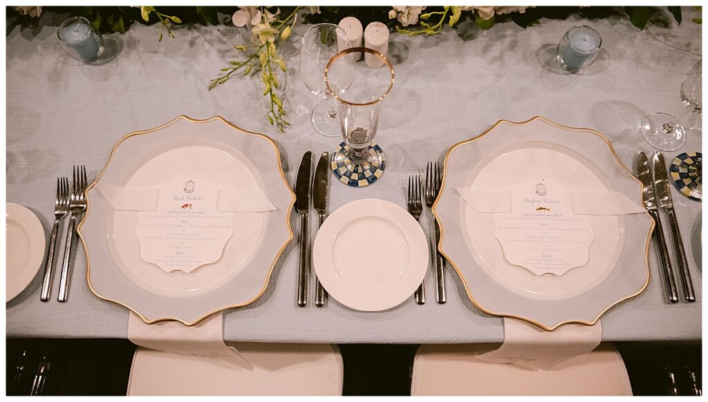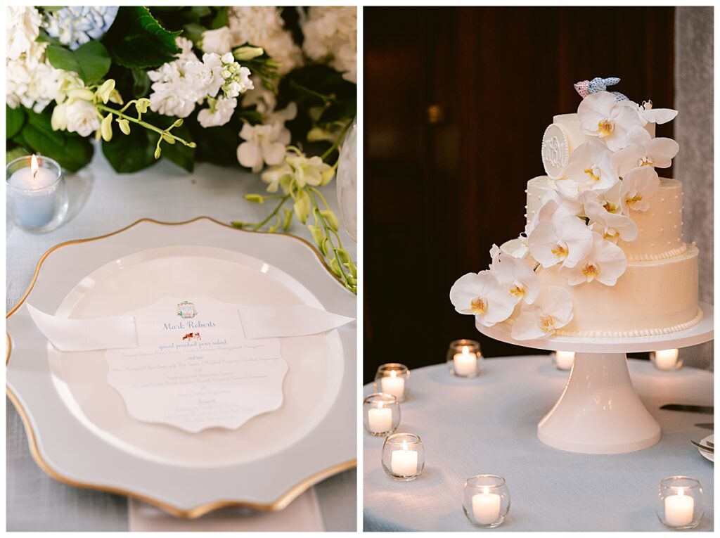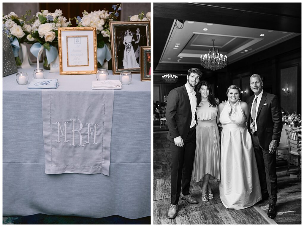 Mark and his groomsmen got ready in their Brooks Brothers attire and monogramed sleeves while toasting Bourbon and shooting pool. Not one detail was overlooked as Meghan’s mother, Mary, planned an incredible day. Meghan and Marks’ monogram was displayed throughout the wedding day in everything from the ribbons on the bridesmaids flowers to the cake to the floor logo to each napkin the guests received at their place setting. Their beautiful wedding invitations designed by Kate Murphy, displayed a beautiful American Club in watercolor. Meghan and her father were escorted to the church ins a white classic Cadillac driven by Lee of Lee’s Classic Cars.