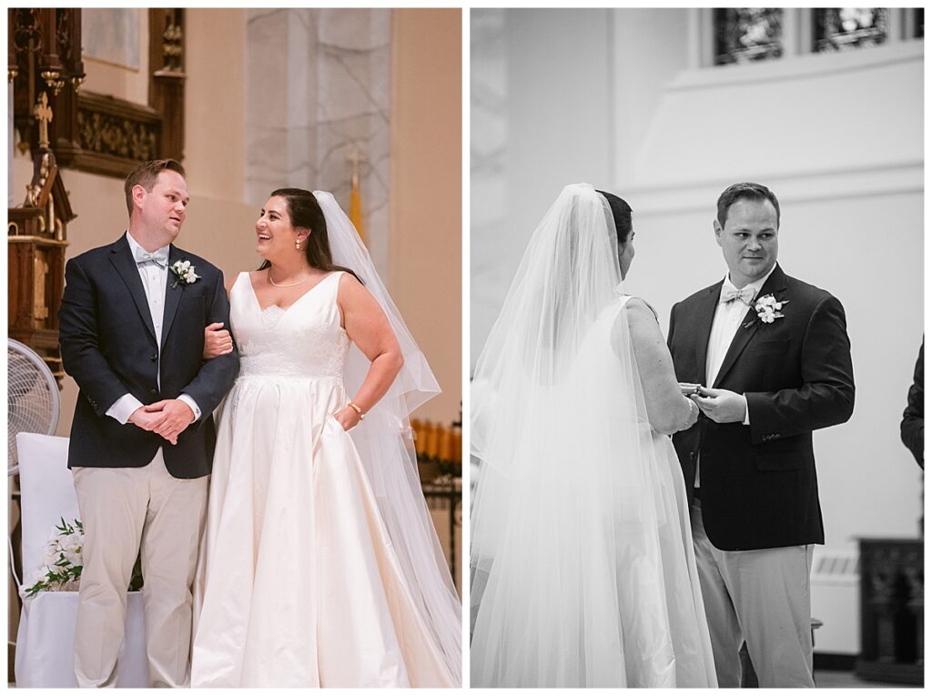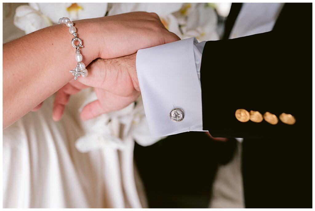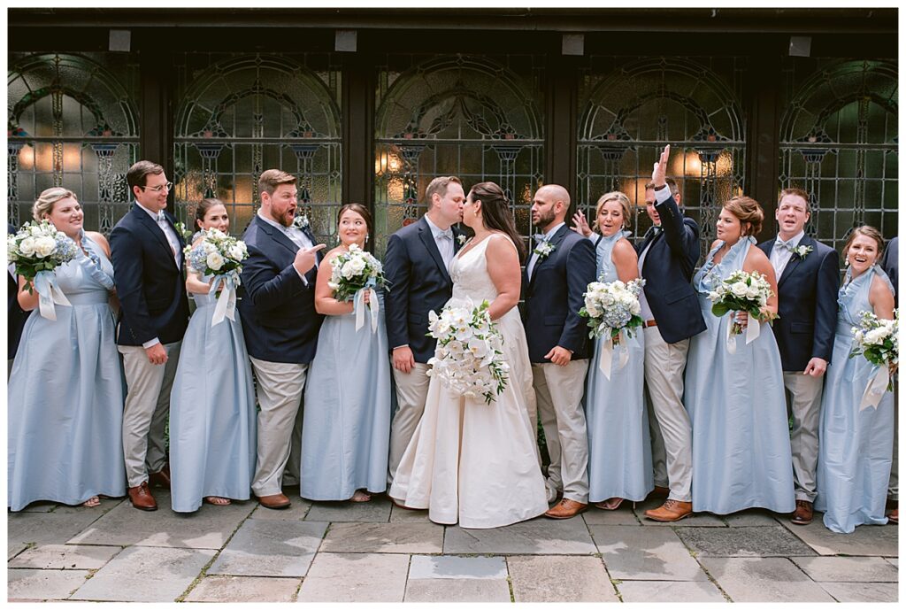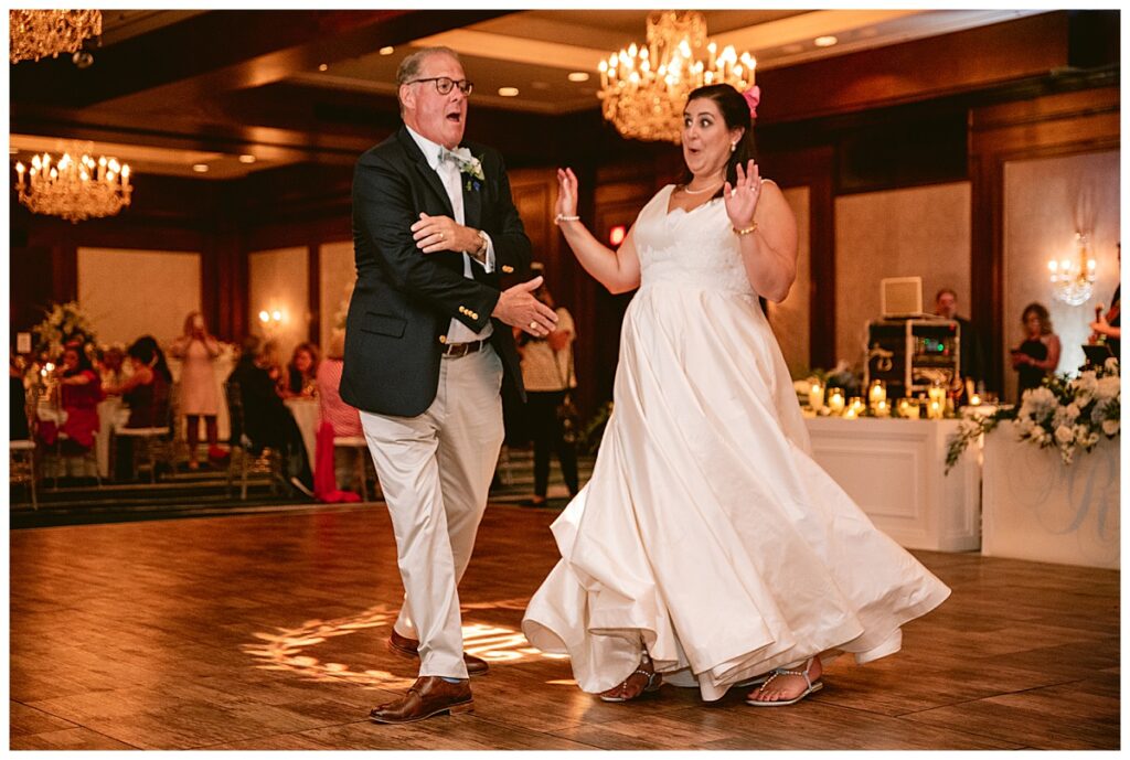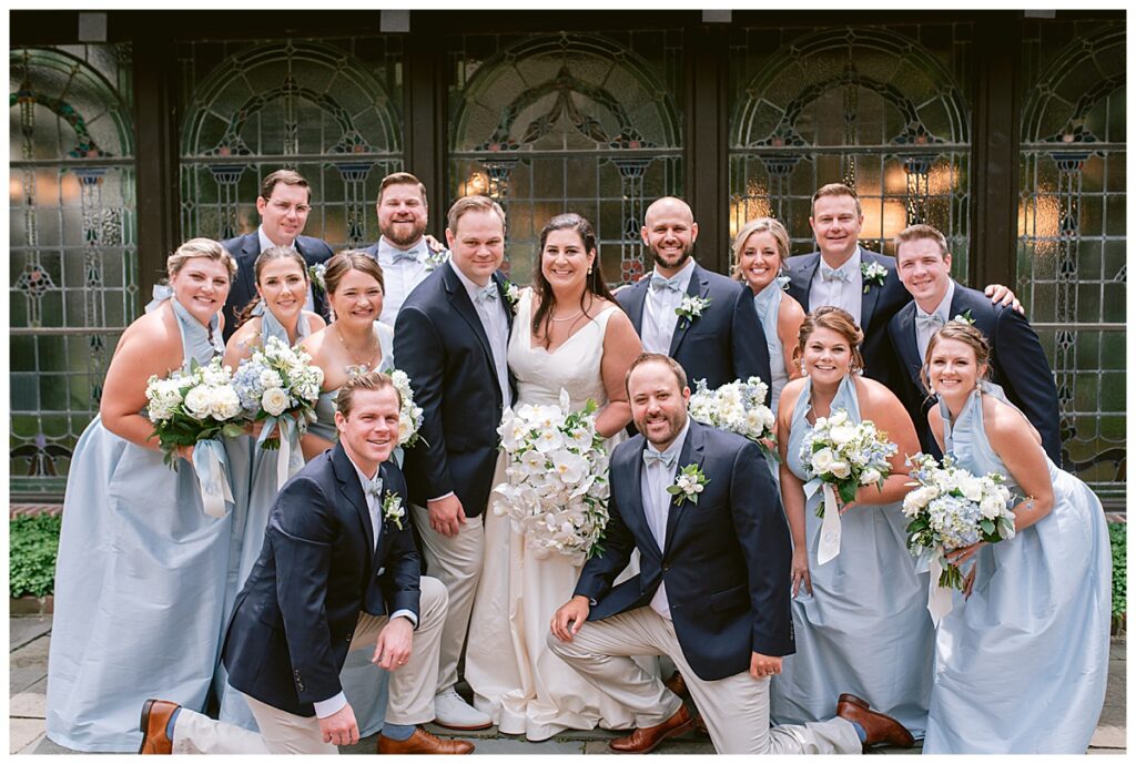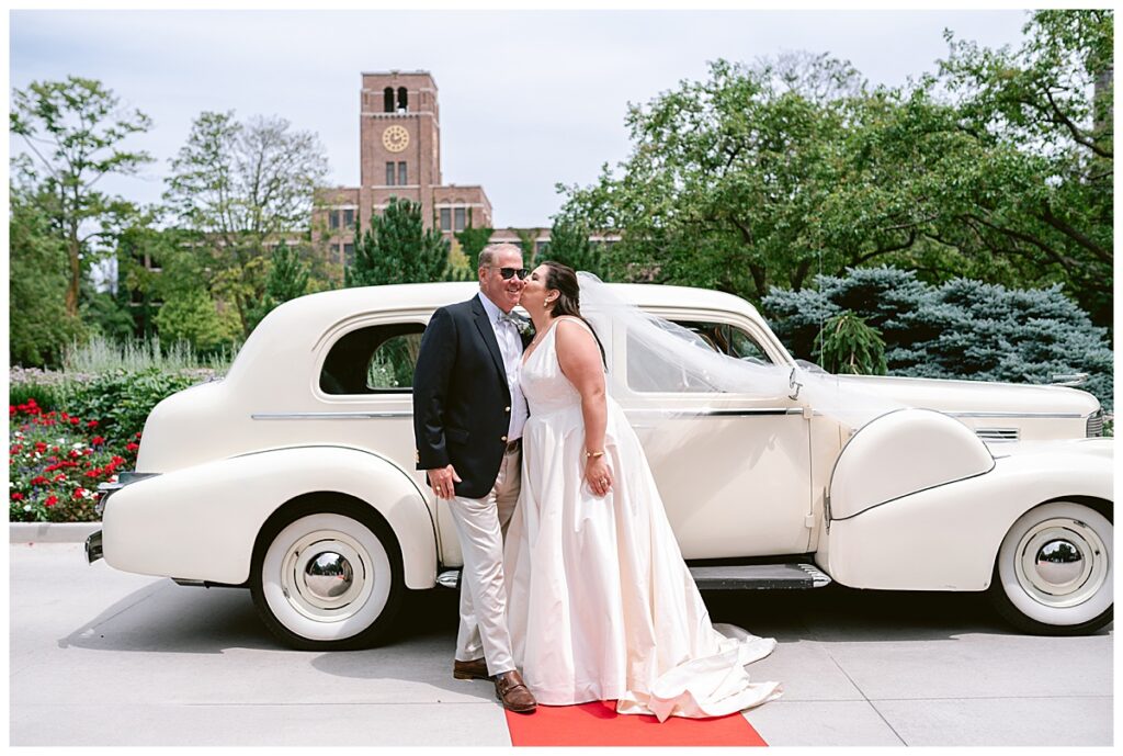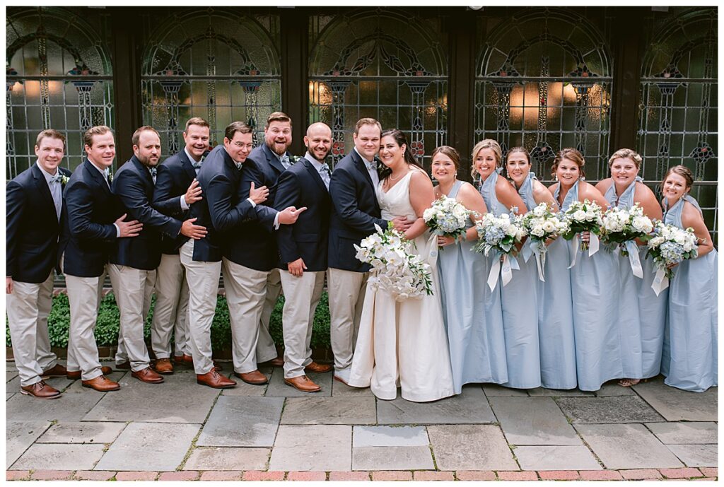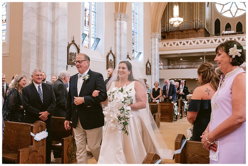 Mark and his groomsmen got ready in their Brooks Brothers attire and monogramed sleeves while toasting Bourbon and shooting pool. Not one detail was overlooked as Meghan’s mother, Mary, planned an incredible day. Meghan and Marks’ monogram was displayed throughout the wedding day in everything from the ribbons on the bridesmaids flowers to the cake to the floor logo to each napkin the guests received at their place setting. Their beautiful wedding invitations designed by Kate Murphy, displayed a beautiful American Club in watercolor. Meghan and her father were escorted to the church ins a white classic Cadillac driven by Lee of Lee’s Classic Cars.