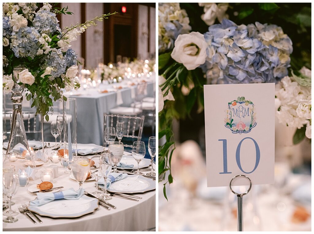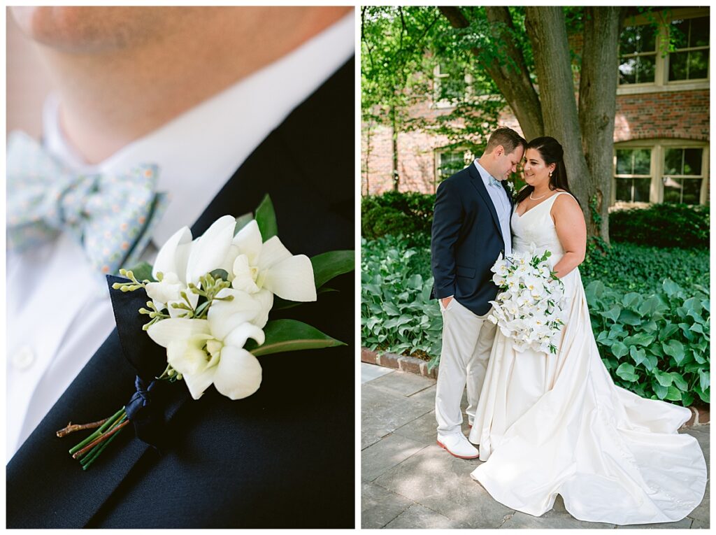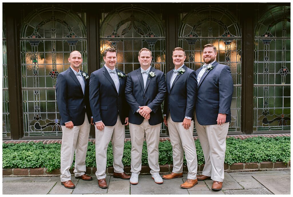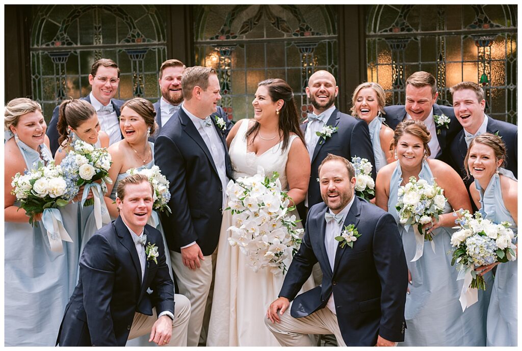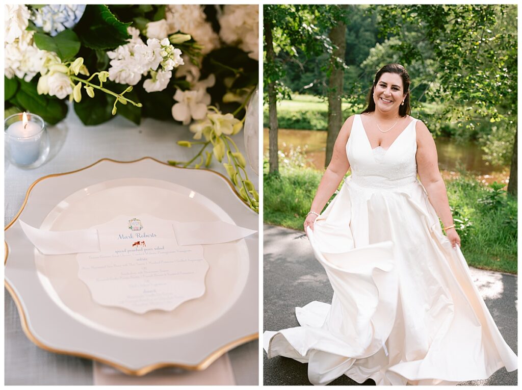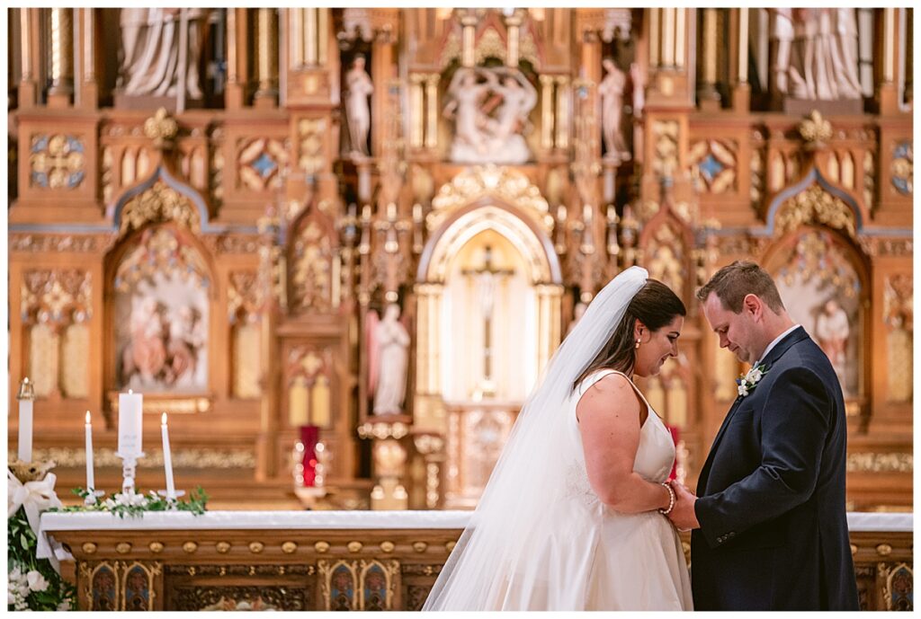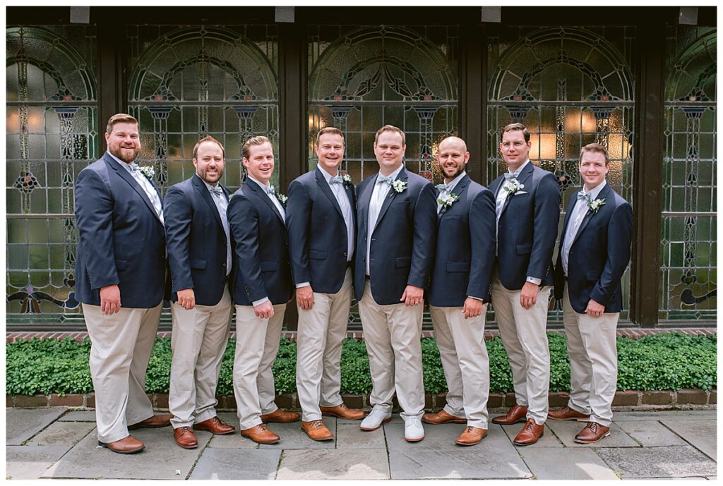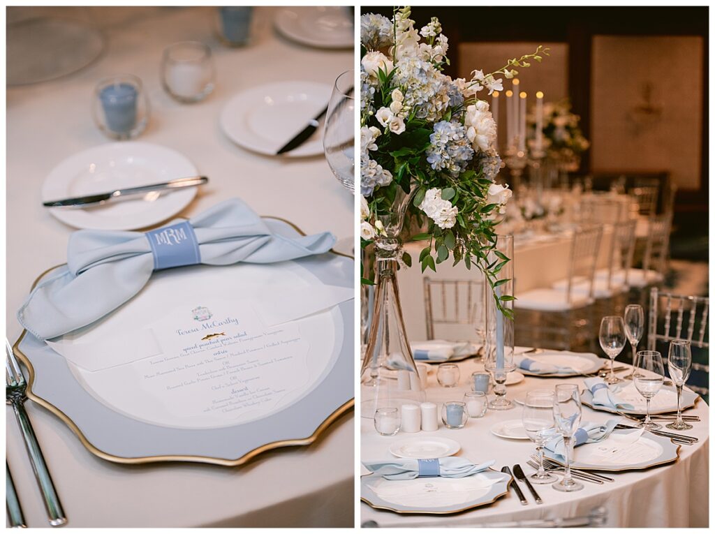 Mark and his groomsmen got ready in their Brooks Brothers attire and monogramed sleeves while toasting Bourbon and shooting pool. Not one detail was overlooked as Meghan’s mother, Mary, planned an incredible day. Meghan and Marks’ monogram was displayed throughout the wedding day in everything from the ribbons on the bridesmaids flowers to the cake to the floor logo to each napkin the guests received at their place setting. Their beautiful wedding invitations designed by Kate Murphy, displayed a beautiful American Club in watercolor. Meghan and her father were escorted to the church ins a white classic Cadillac driven by Lee of Lee’s Classic Cars.