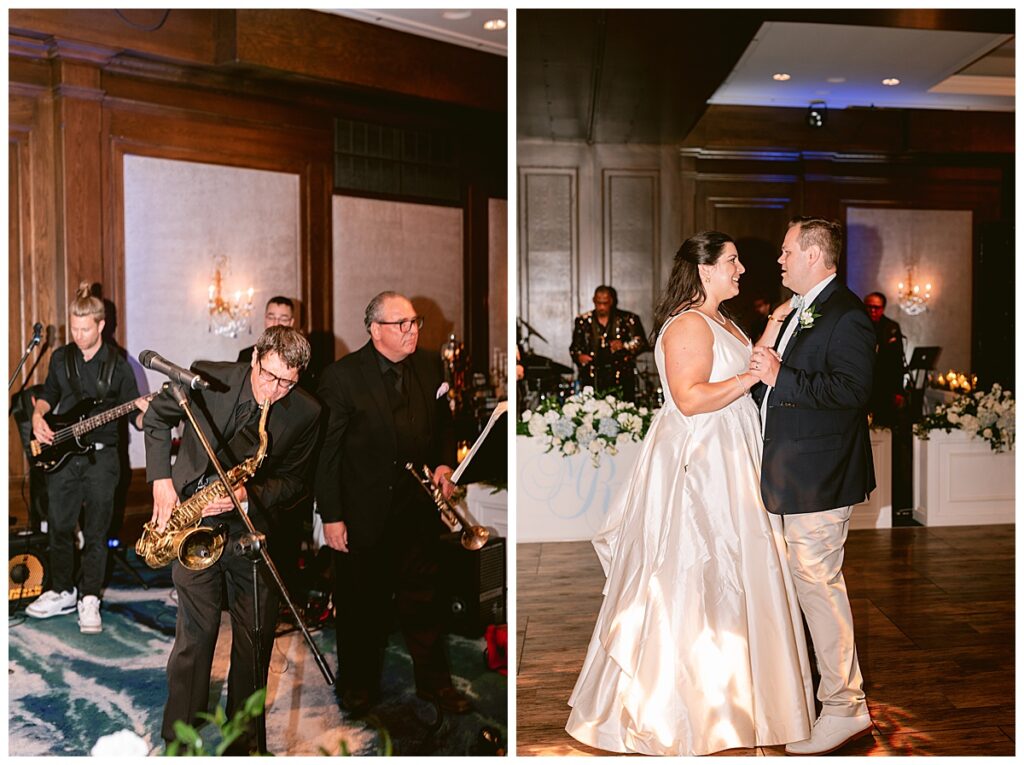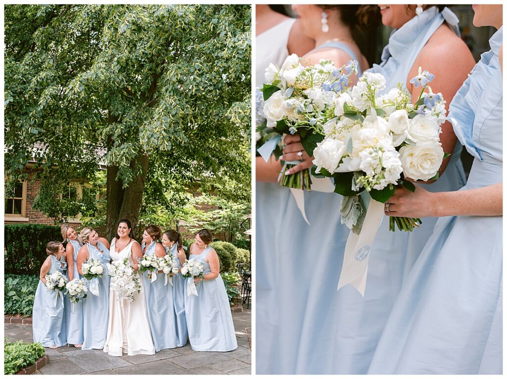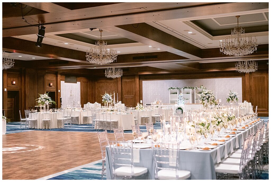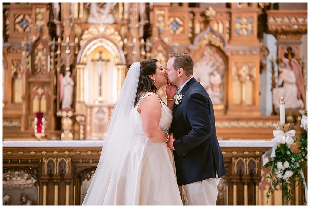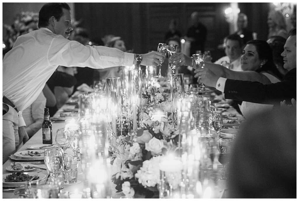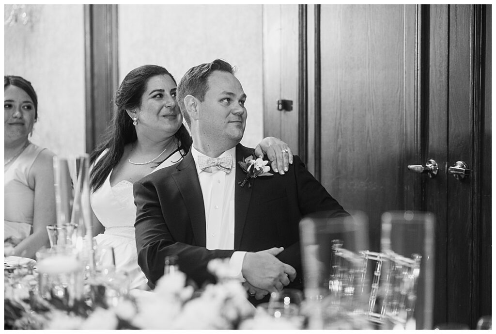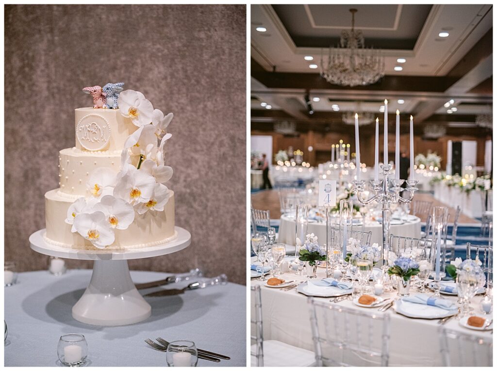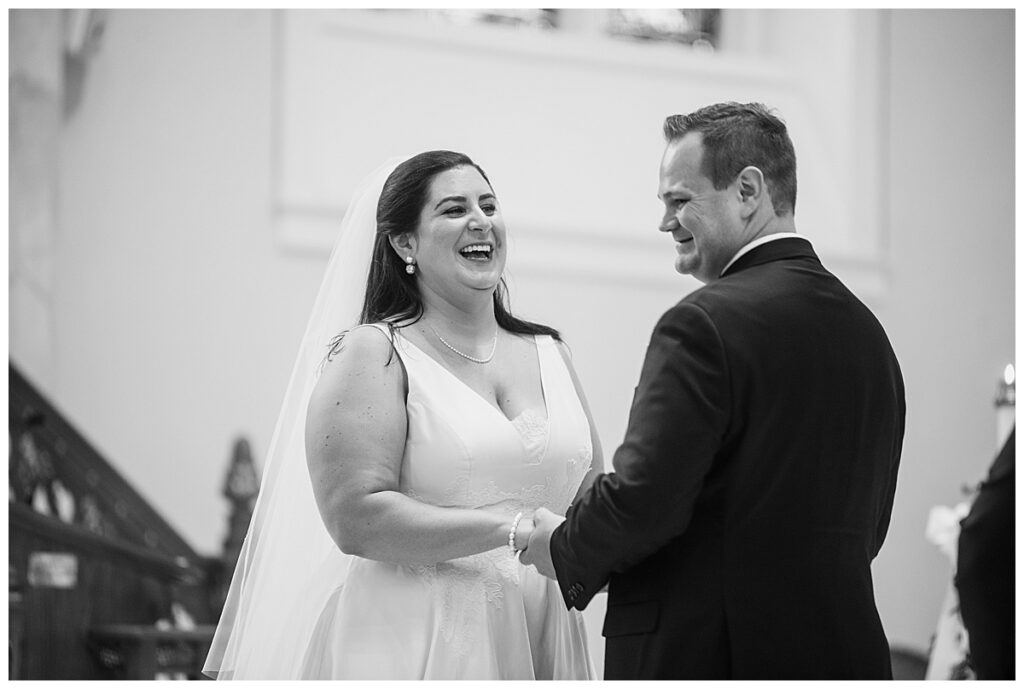 Mark and his groomsmen got ready in their Brooks Brothers attire and monogramed sleeves while toasting Bourbon and shooting pool. Not one detail was overlooked as Meghan’s mother, Mary, planned an incredible day. Meghan and Marks’ monogram was displayed throughout the wedding day in everything from the ribbons on the bridesmaids flowers to the cake to the floor logo to each napkin the guests received at their place setting. Their beautiful wedding invitations designed by Kate Murphy, displayed a beautiful American Club in watercolor. Meghan and her father were escorted to the church ins a white classic Cadillac driven by Lee of Lee’s Classic Cars.