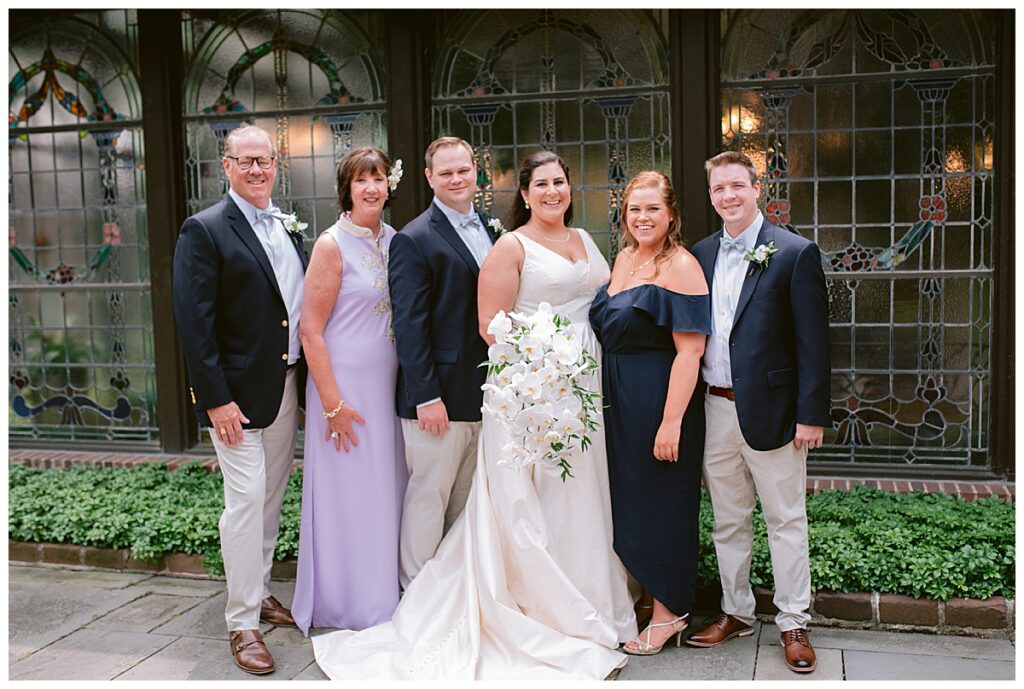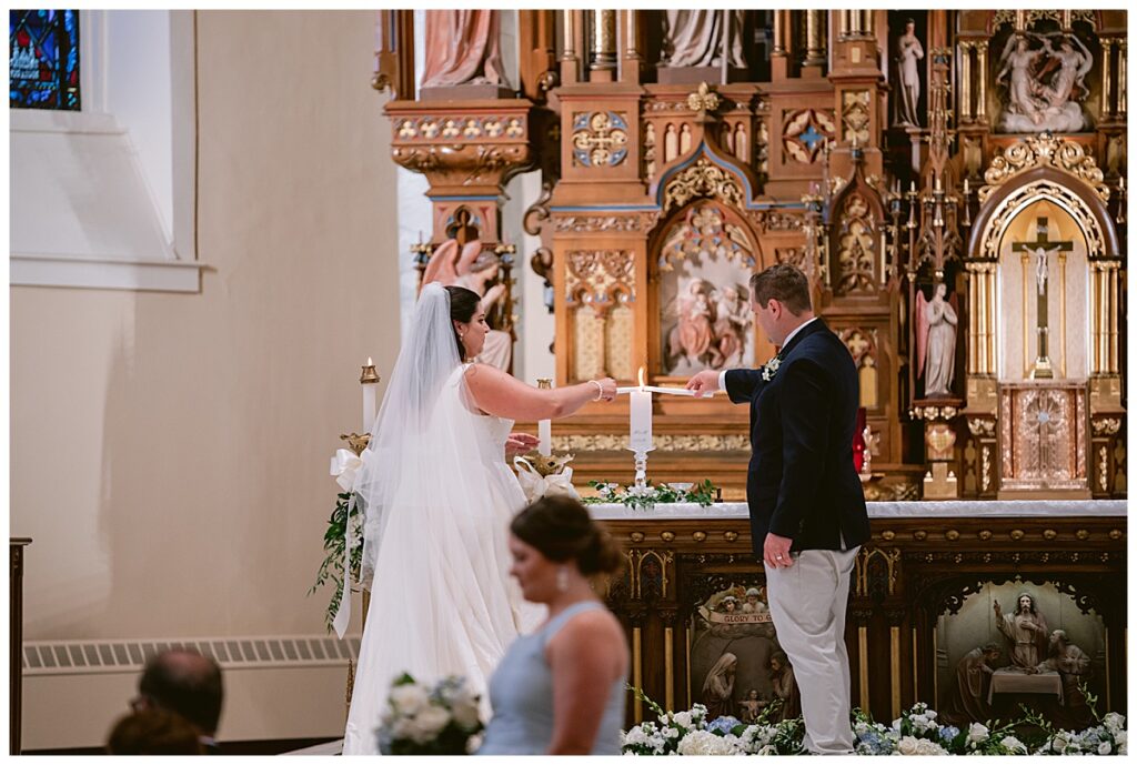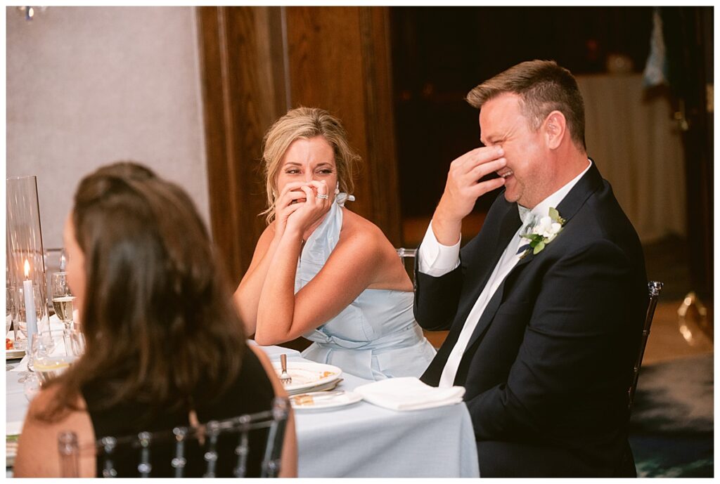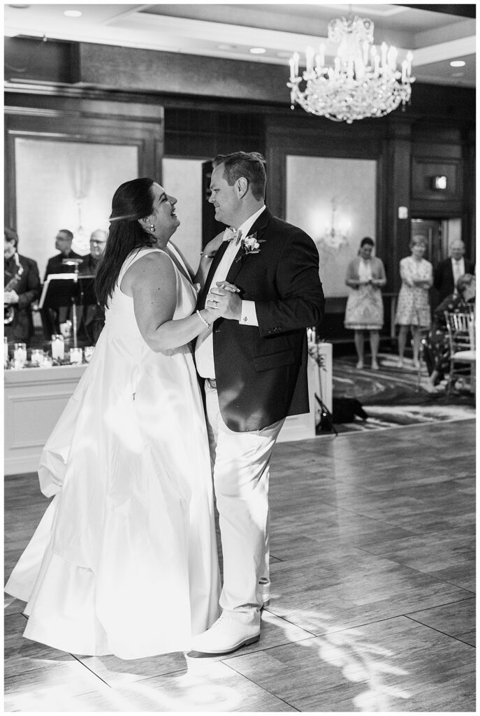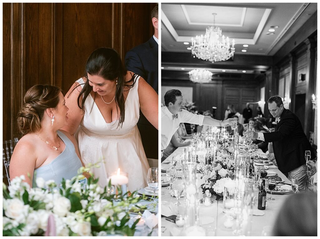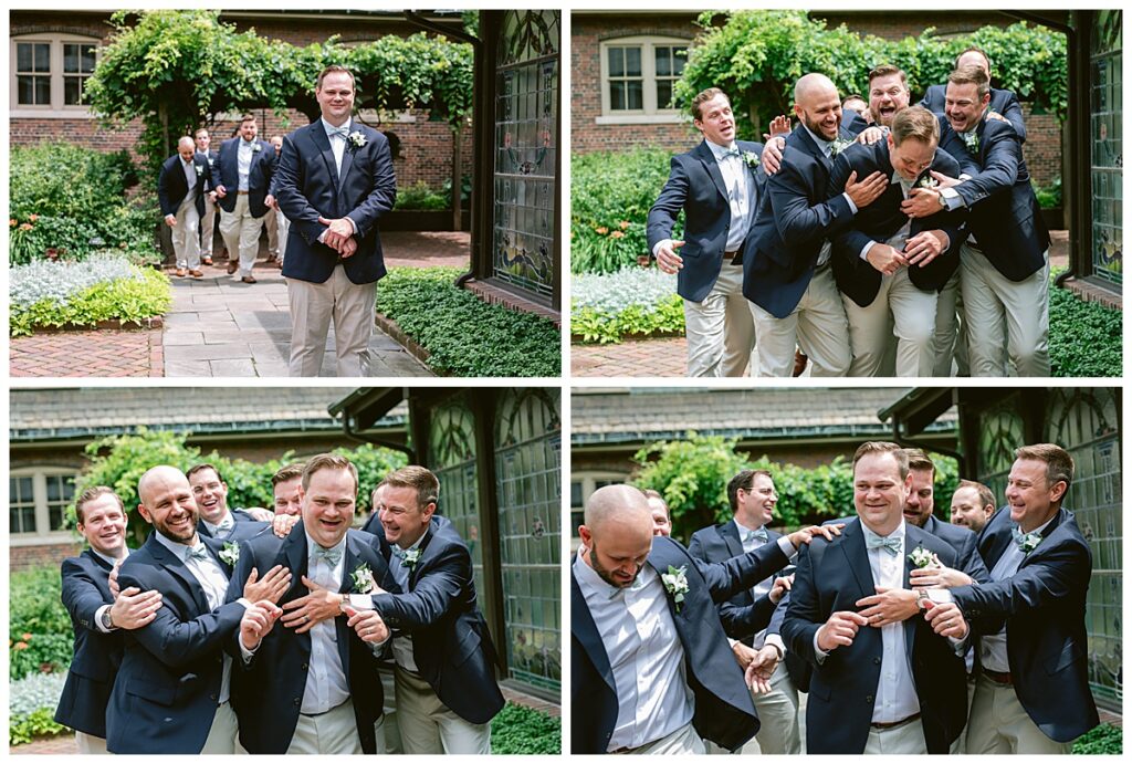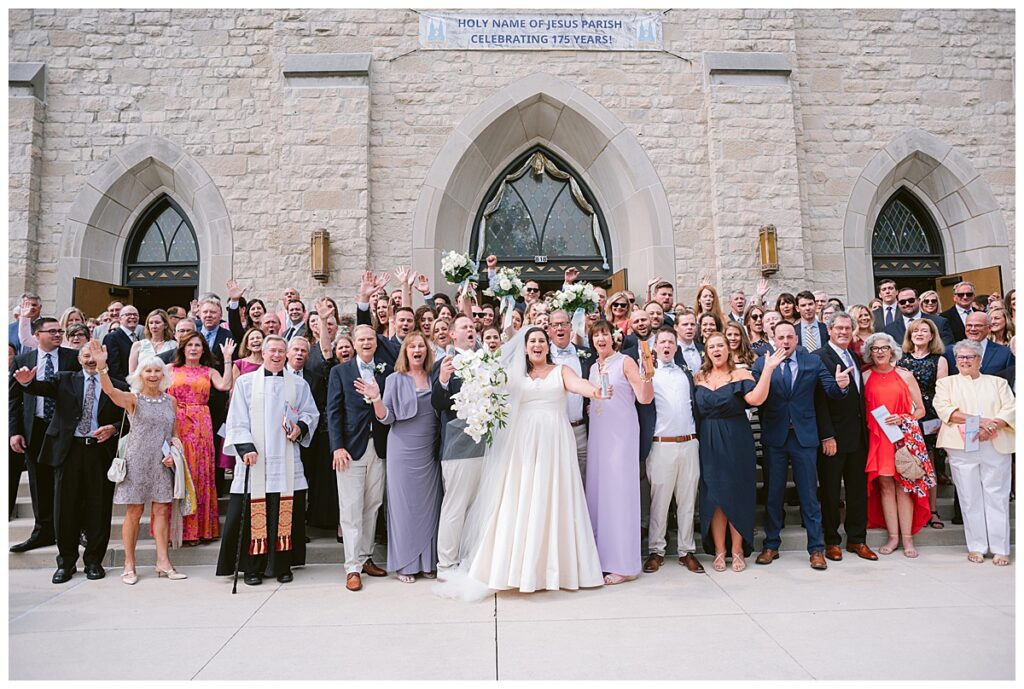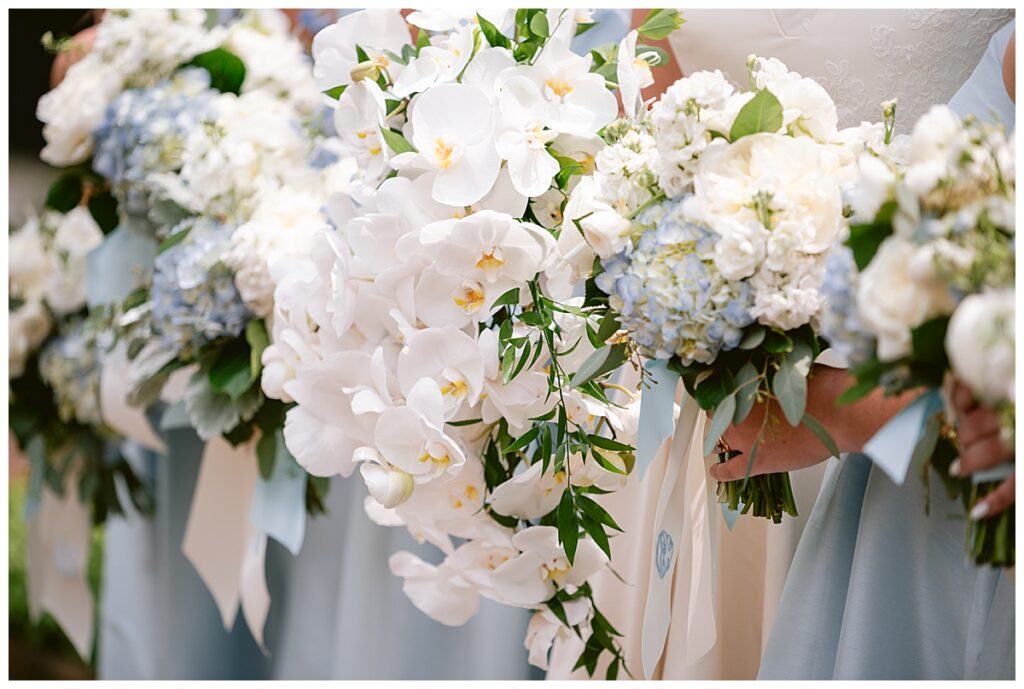 Mark and his groomsmen got ready in their Brooks Brothers attire and monogramed sleeves while toasting Bourbon and shooting pool. Not one detail was overlooked as Meghan’s mother, Mary, planned an incredible day. Meghan and Marks’ monogram was displayed throughout the wedding day in everything from the ribbons on the bridesmaids flowers to the cake to the floor logo to each napkin the guests received at their place setting. Their beautiful wedding invitations designed by Kate Murphy, displayed a beautiful American Club in watercolor. Meghan and her father were escorted to the church ins a white classic Cadillac driven by Lee of Lee’s Classic Cars.
