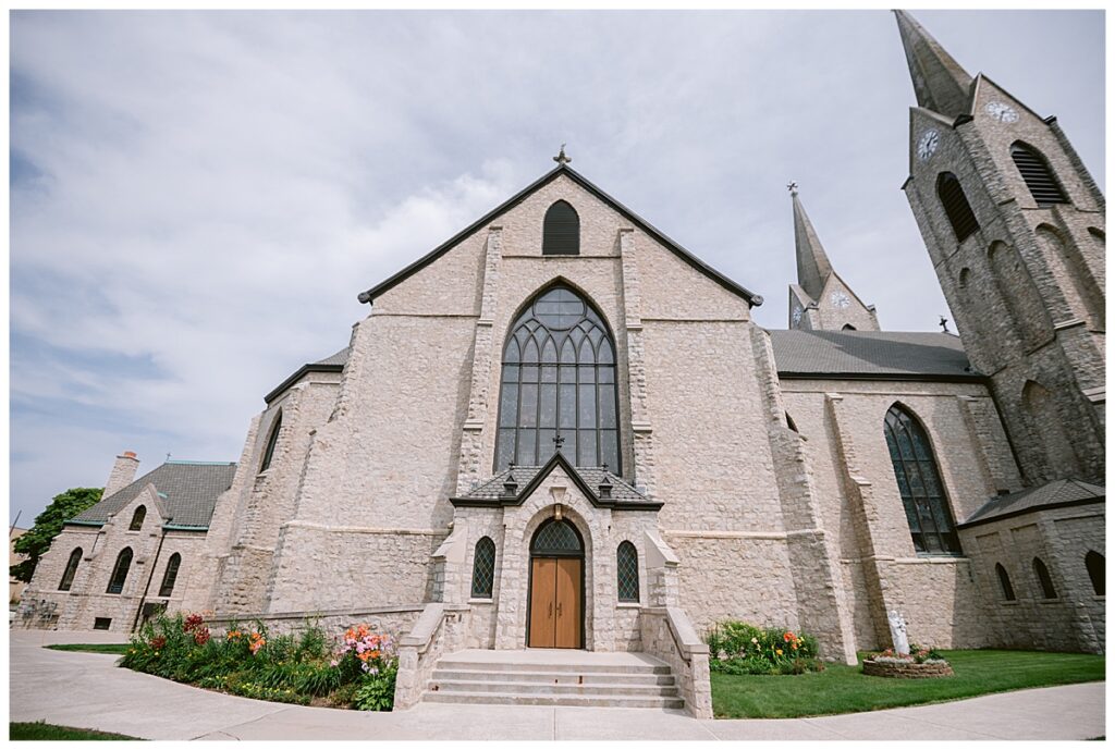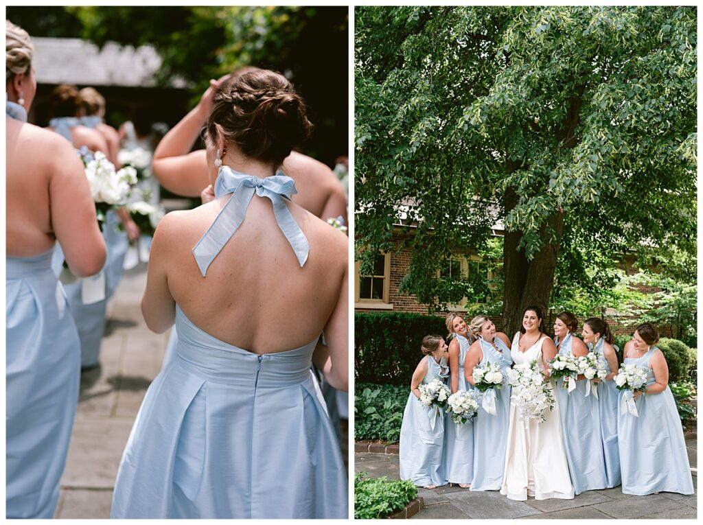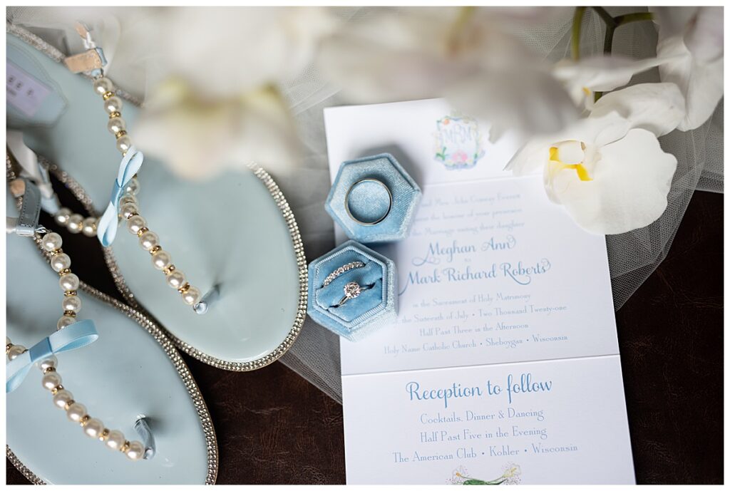 Their July wedding day was a beautiful one. Mark and Megan got ready at The American Club. With its spectacular views and stunning landscape, there was not a bad place for photos. The Kohler Spa did Meghan and her bridesmaids hair and make up. Meghan wore a beautiful satin Romona Kevaza gown purchased from Annika Bridal Boutique while her bridesmaids wore stunning baby blue Lula Kate gowns from Bella Bridesmaids.