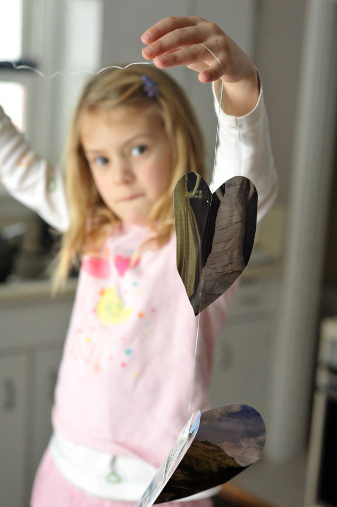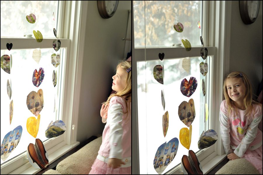 My girls woke me up yesterday dressed in pink and hearts, all ready to celebrate Valentine’s day. Little do they know, we have about 2 weeks and Elise’s birthday to go until that special day arrives! Never the less they really wanted to make Valentine crafts, and last night I just so happened on a new blog and found this great craft that she had done. To see her site and beautiful art see HERE. So all that to say, this is not my idea, but one that we were able to use and decorate our house with this morning!
