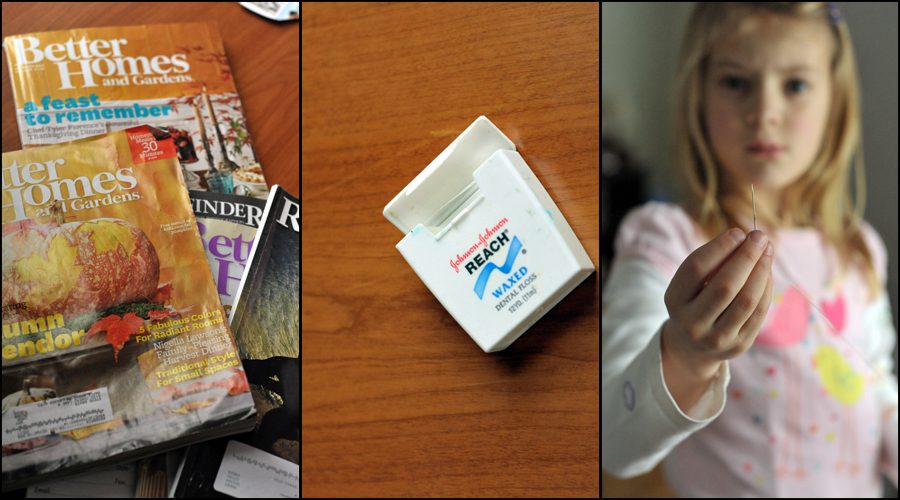 To start off you will need floss, a sewing needle and a stack of old magazines or catalogs.