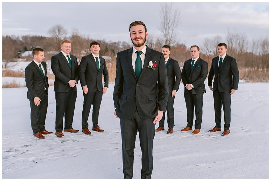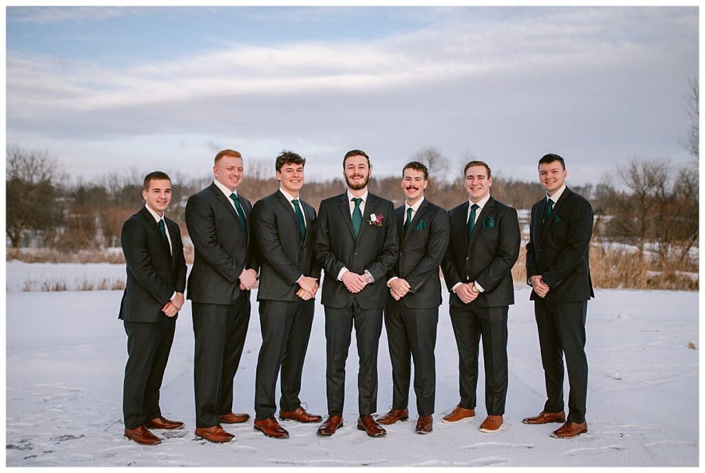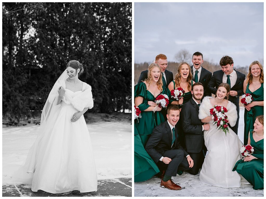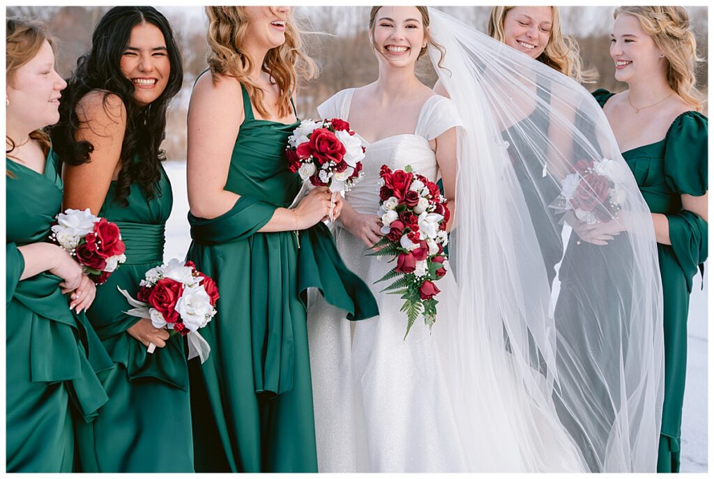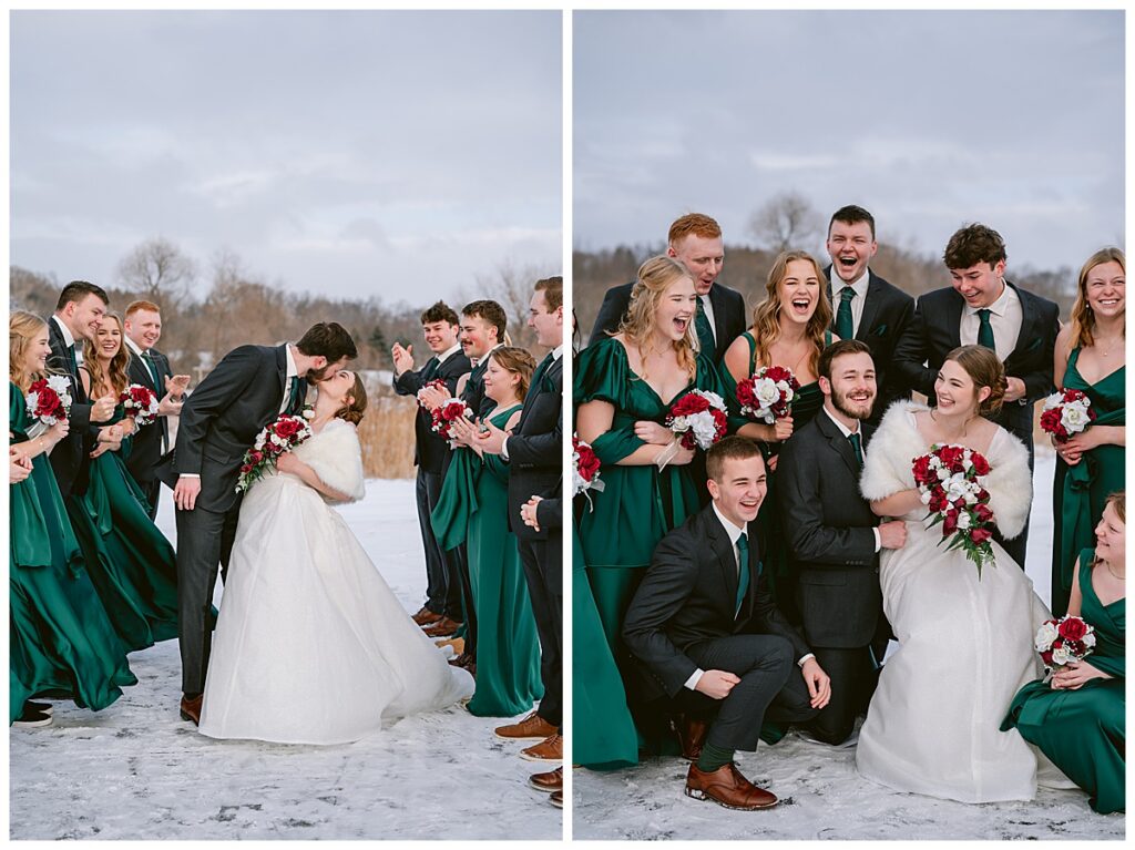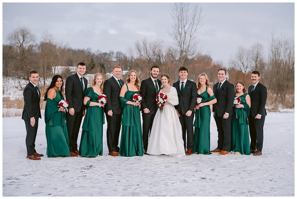 Despite the cold, Grace and Cole and their amazing wedding party embraced the winter weather for portraits, and it was absolutely worth it. The snow paired beautifully with the green Azazie bridesmaid dresses, which popped against the white landscape and added a rich, elegant contrast.