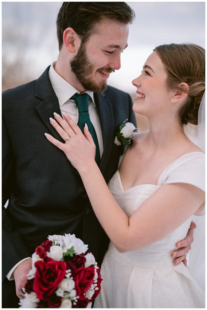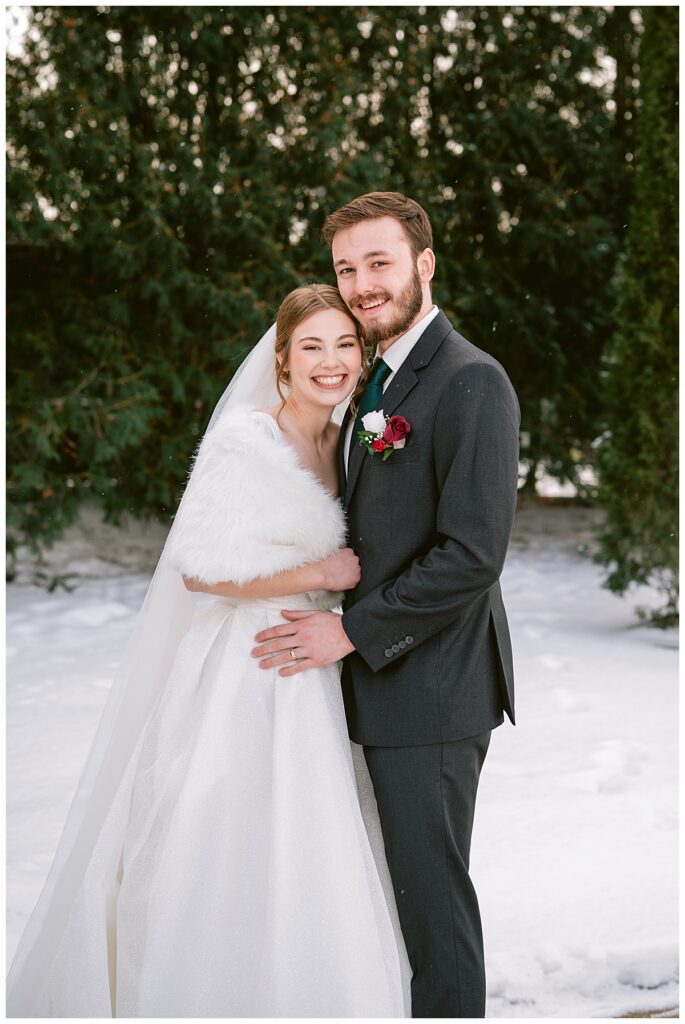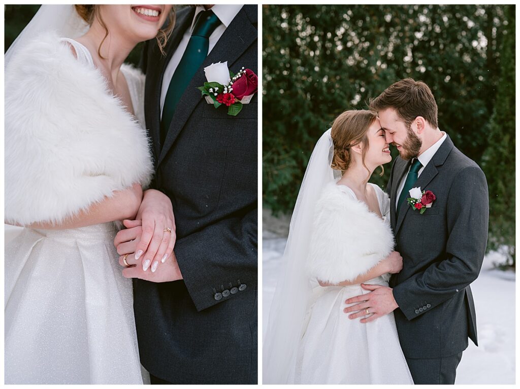 Grace wore a Mori Lee bridal gown that was absolutely perfect for a winter wedding. With a fur shawl draped over her shoulders, she looked both stunning and cozy. Cole complemented her look flawlessly in a dark gray suit coat, creating a timeless winter palette that photographed beautifully.
