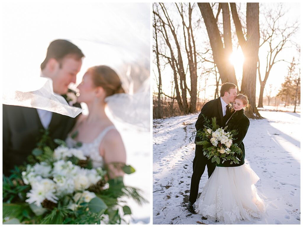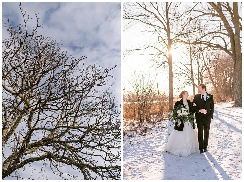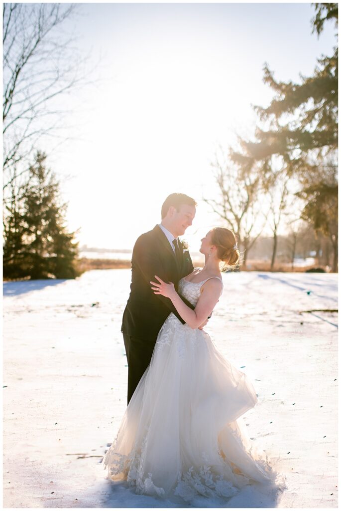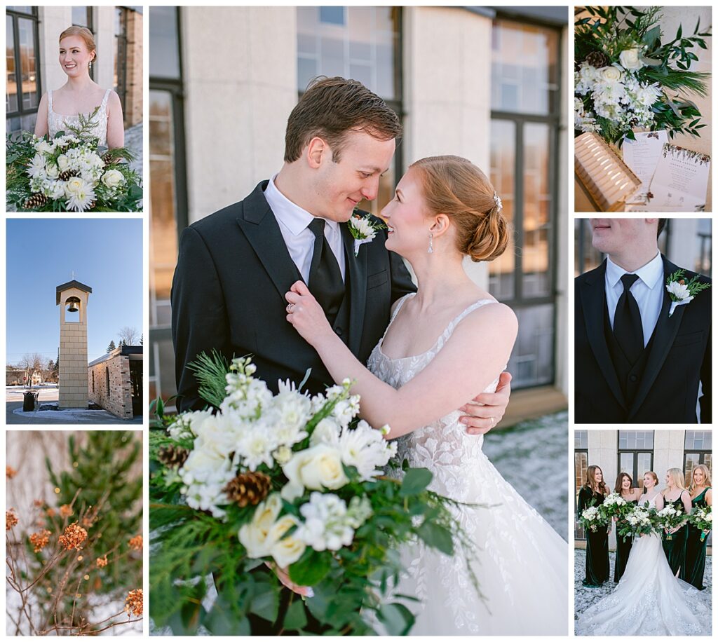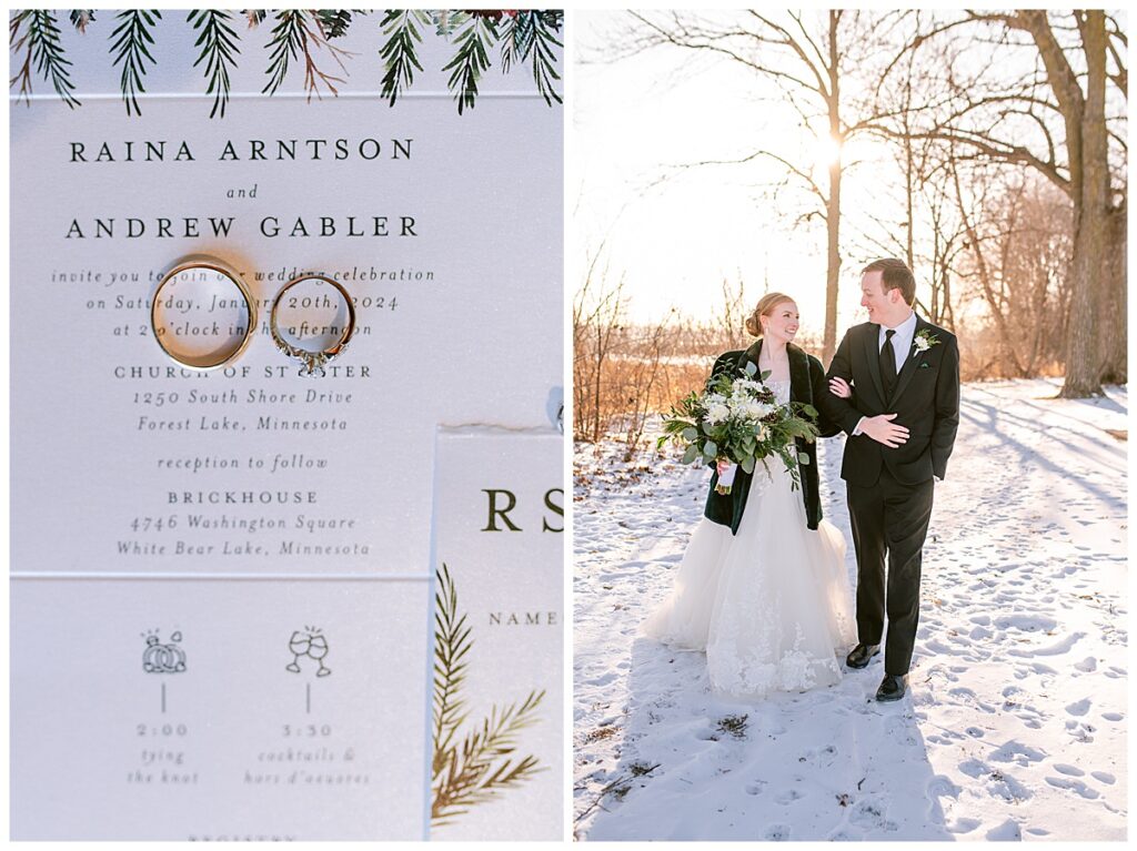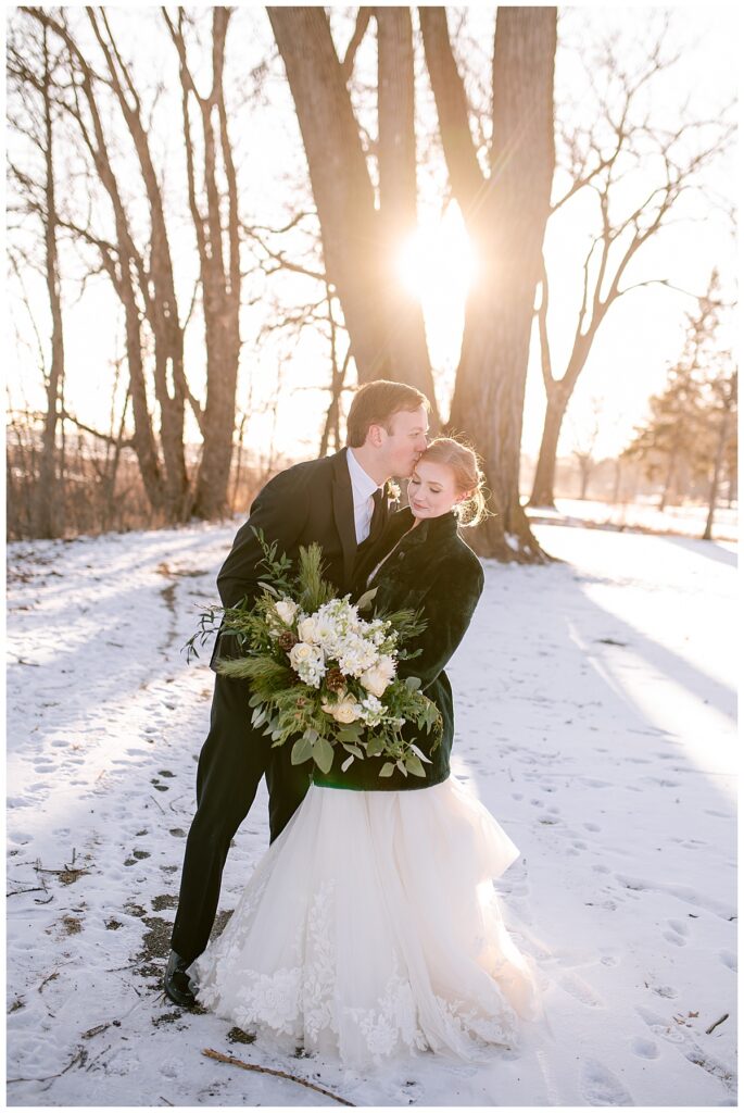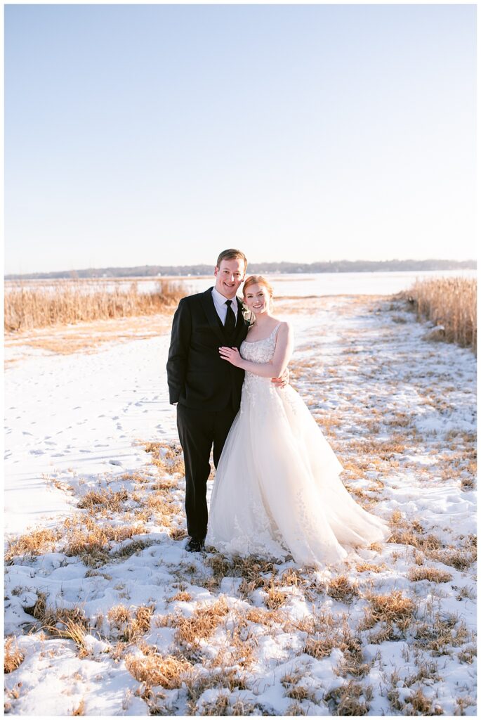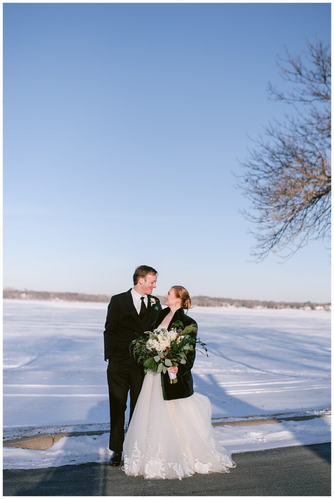 Following the ceremony, Raina and Andy braved the winter chill for some breathtaking photos. Against the snow-covered landscape of White Bear Lake, the emerald green coat that Raina wore (which was her grandmother’s) was perfectly paired with pops of green and pinecones in the beautiful bouquet created by Michele of Custom Floral Design. The couple wandered around Matoska Park where the sun shone brightly and cast a golden glow over the icy landscape. As Raina and Andy embraced in the brisk and cold air, timeless photographs that reflected the essence of their love were created.