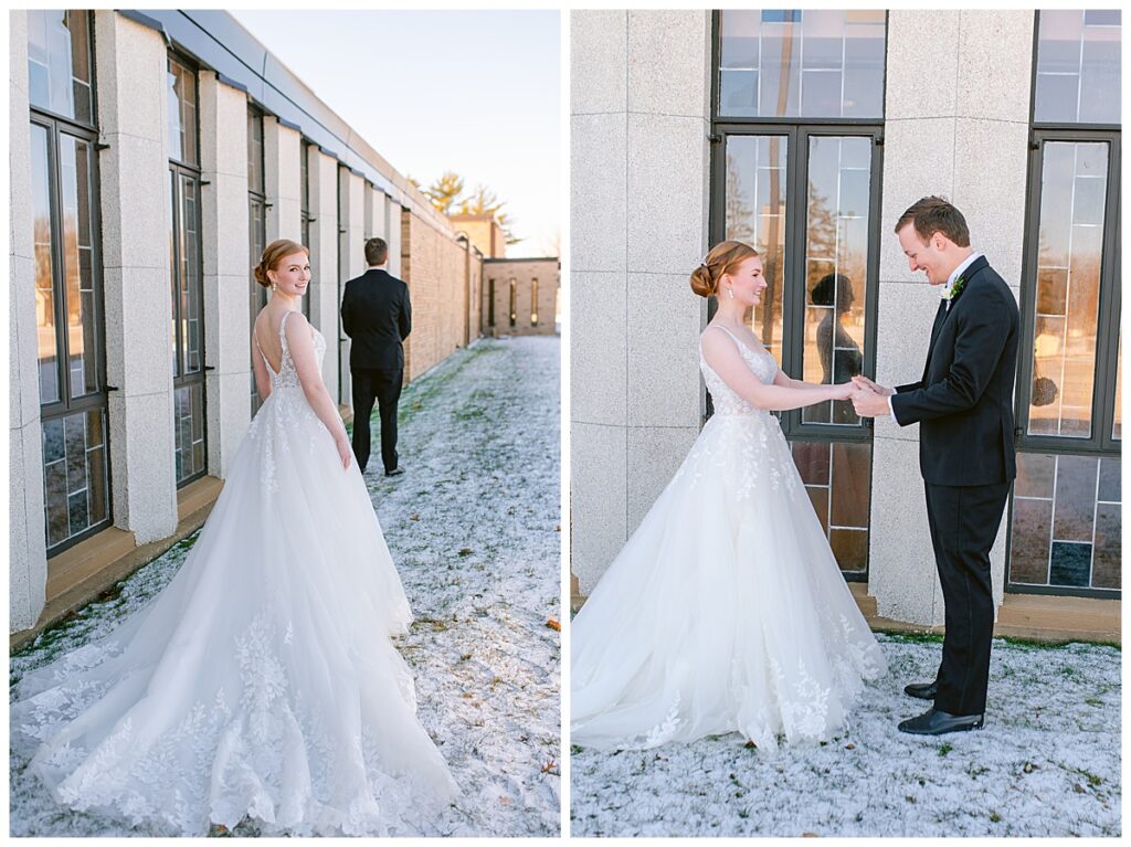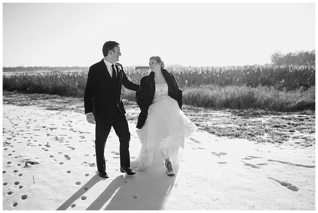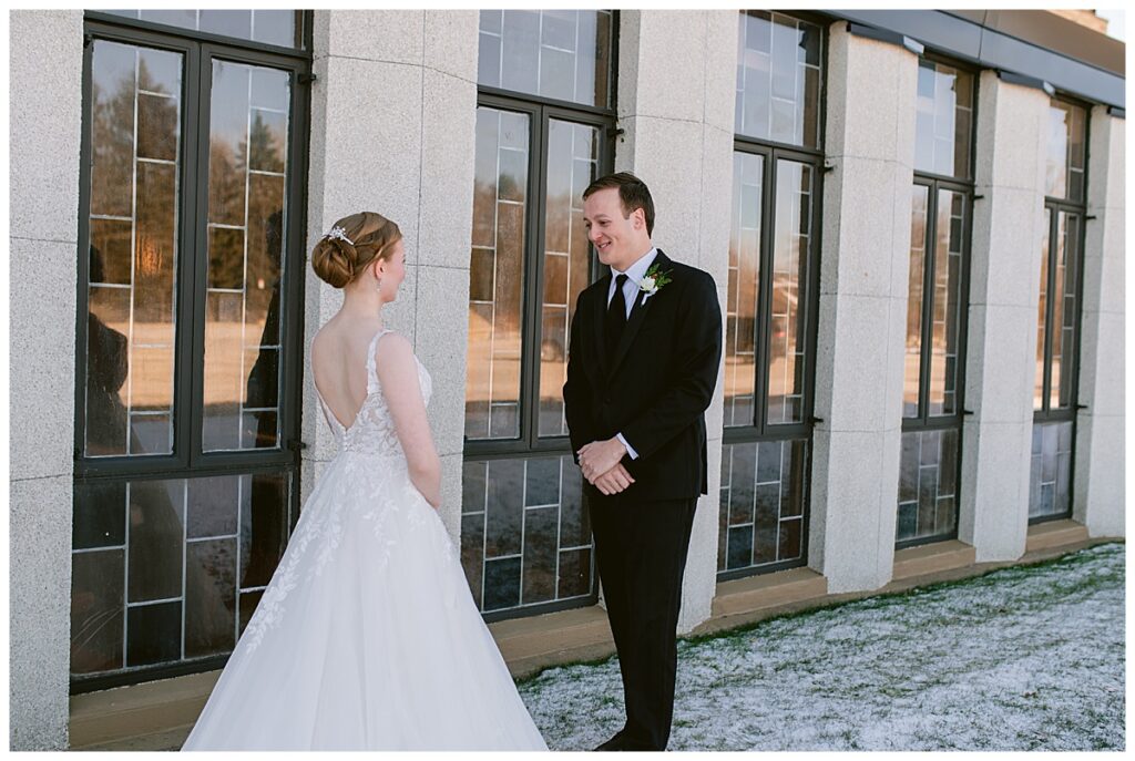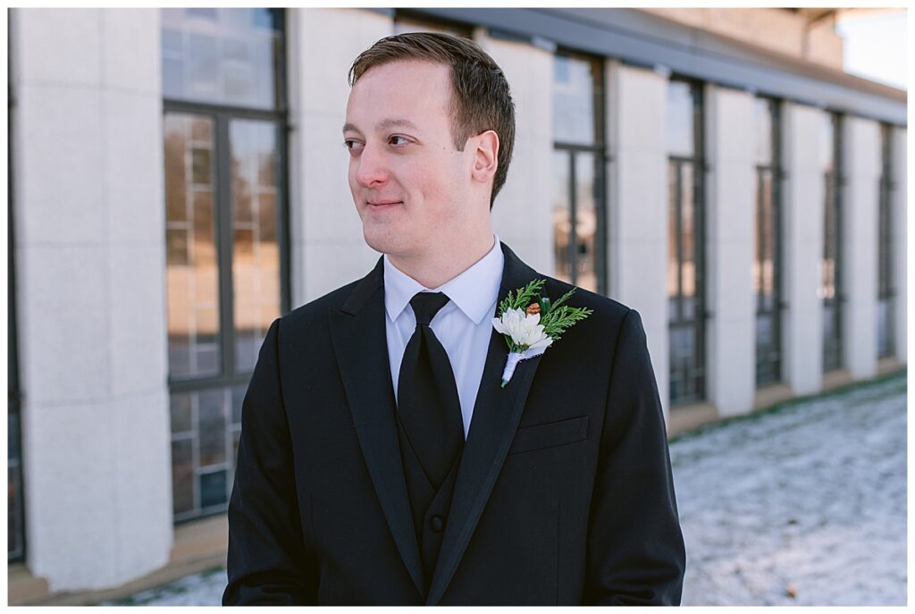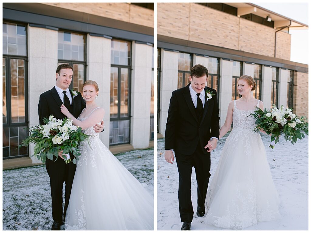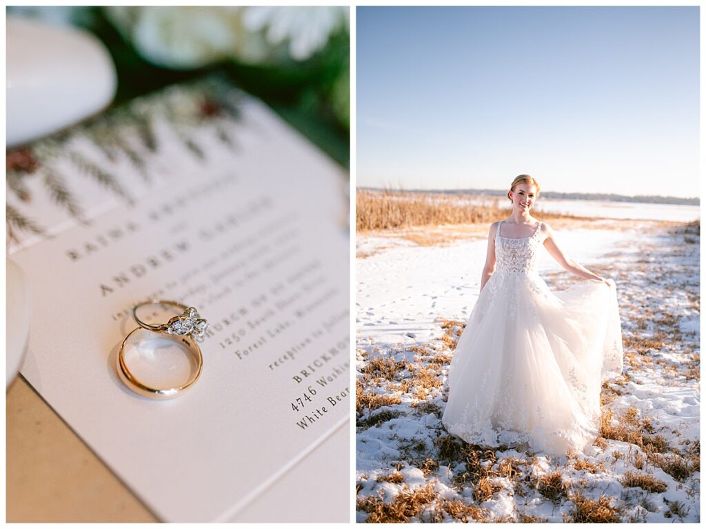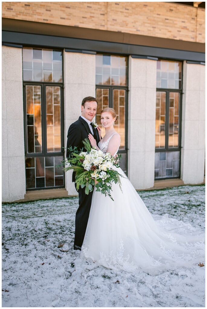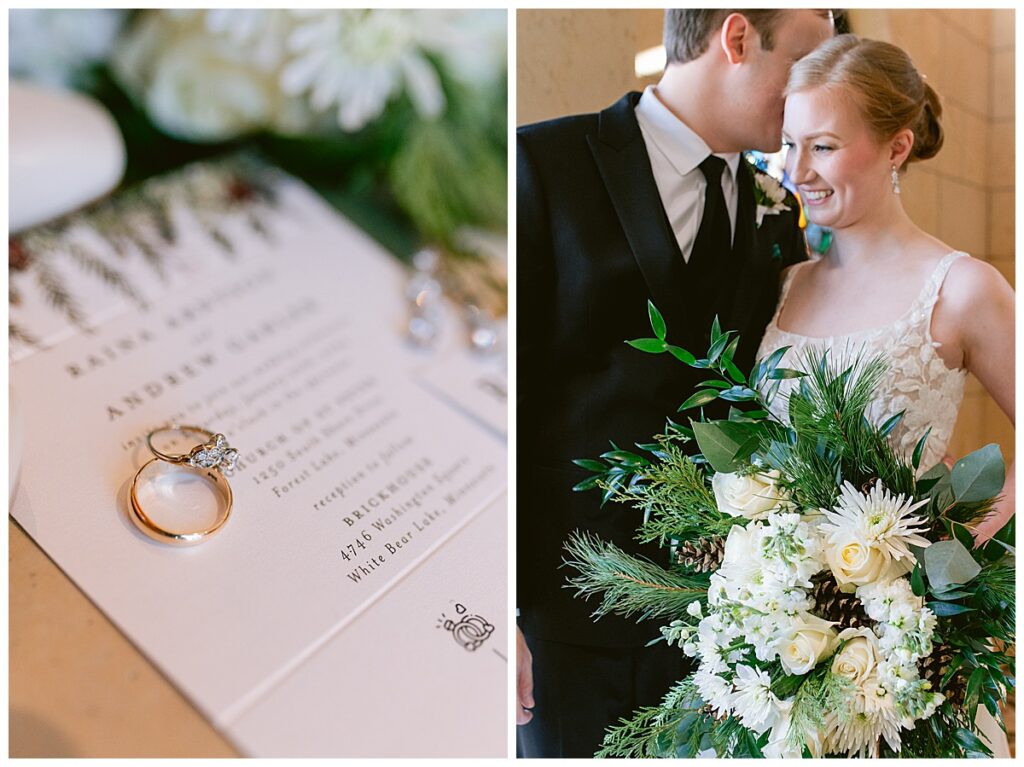 Following the ceremony, Raina and Andy braved the winter chill for some breathtaking photos. Against the snow-covered landscape of White Bear Lake, the emerald green coat that Raina wore (which was her grandmother’s) was perfectly paired with pops of green and pinecones in the beautiful bouquet created by Michele of Custom Floral Design. The couple wandered around Matoska Park where the sun shone brightly and cast a golden glow over the icy landscape. As Raina and Andy embraced in the brisk and cold air, timeless photographs that reflected the essence of their love were created.