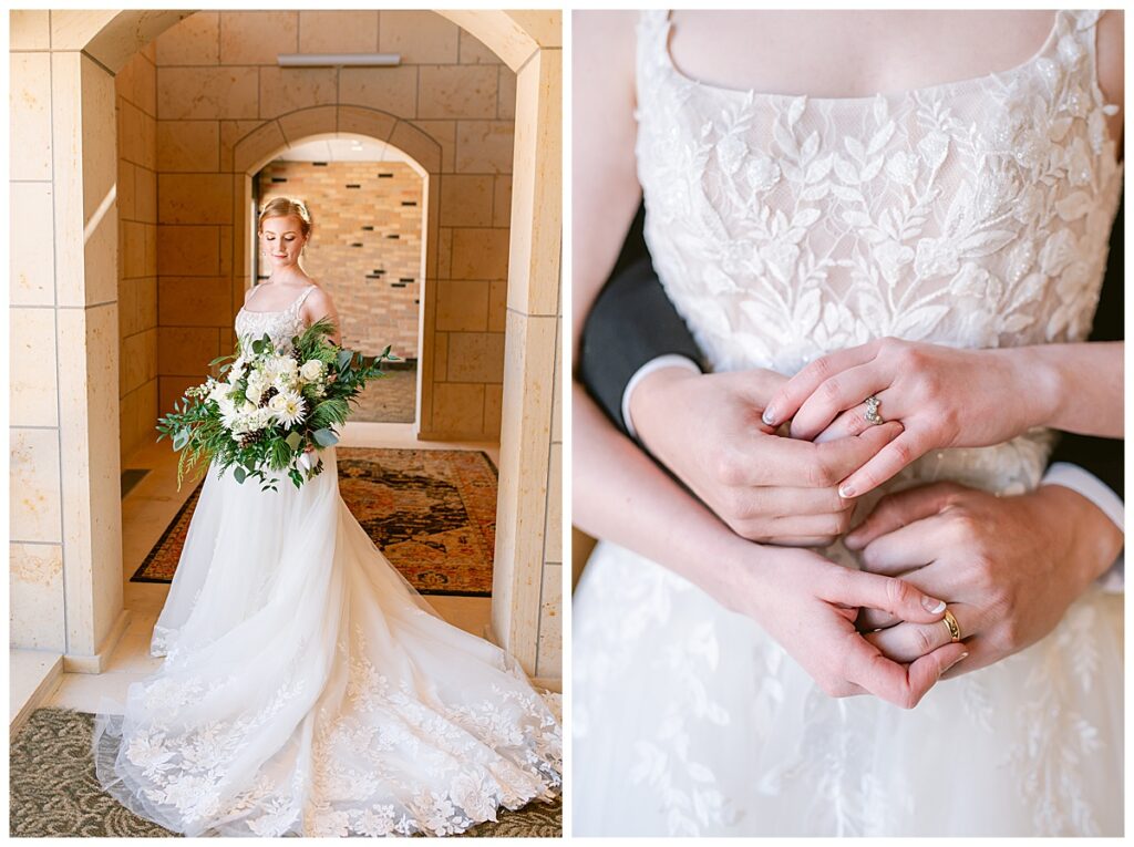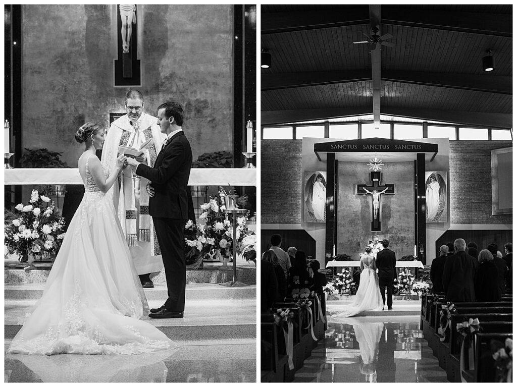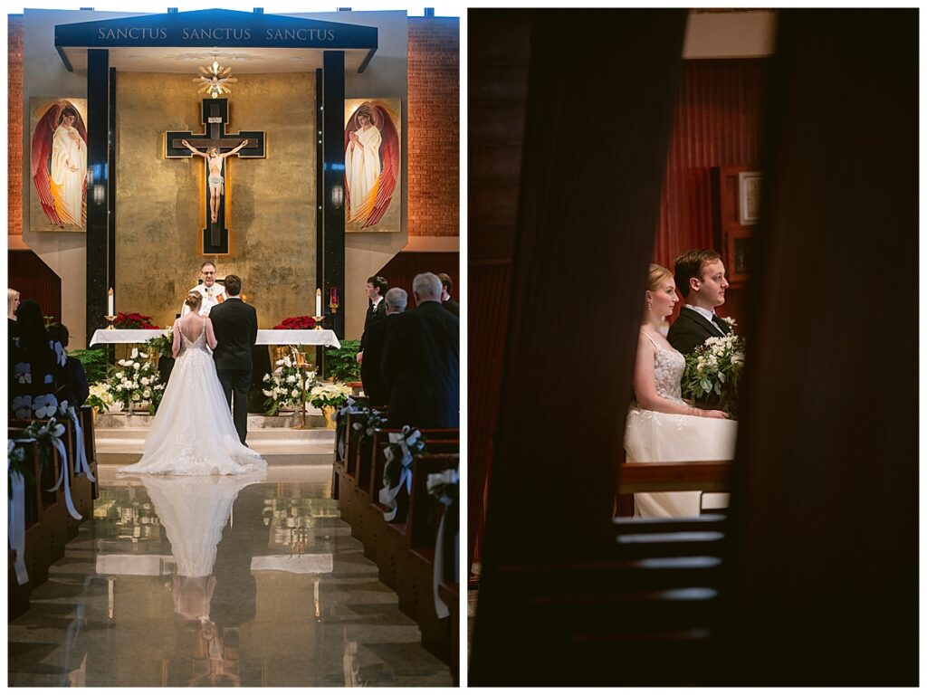 The ceremony took place at The Church of St. Peter in Forest Lake. The air inside was filled with the warmth of love and the melodies of sacred vows. The bridal party, adorned in emerald green velvet dresses and sharp grey suits, created a striking contrast against the traditional church setting. Raina was beautiful in her Justin Alexander wedding dress from Bridal Accents Couture.