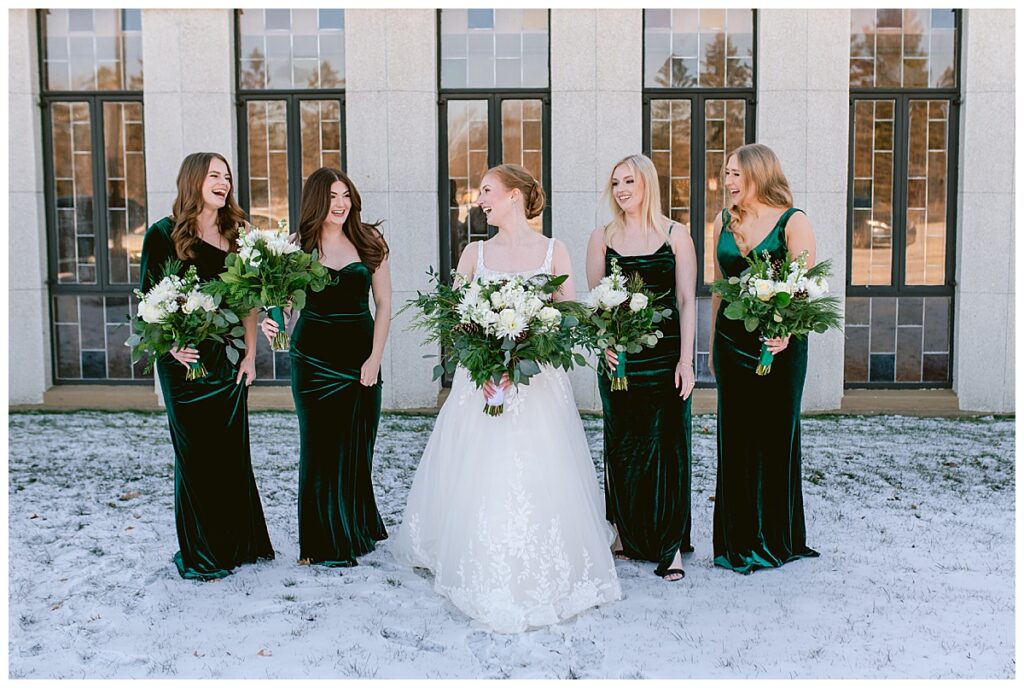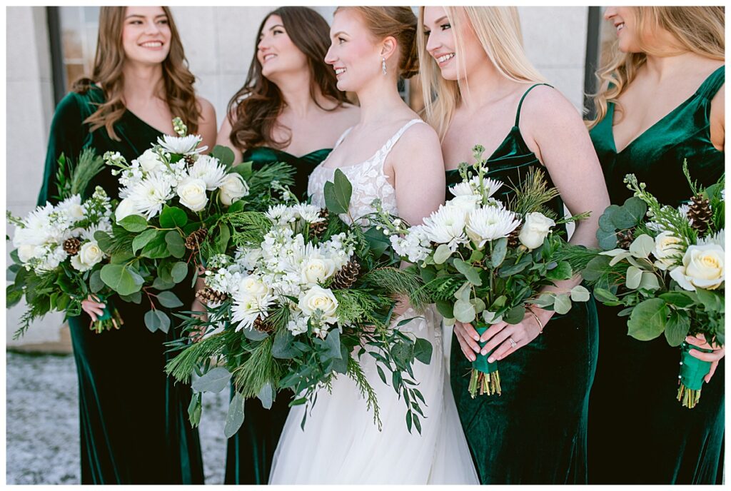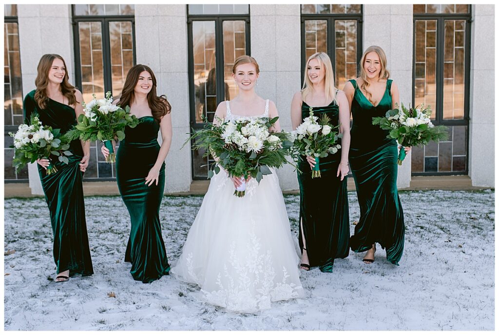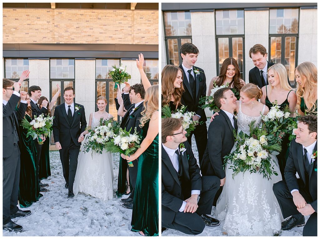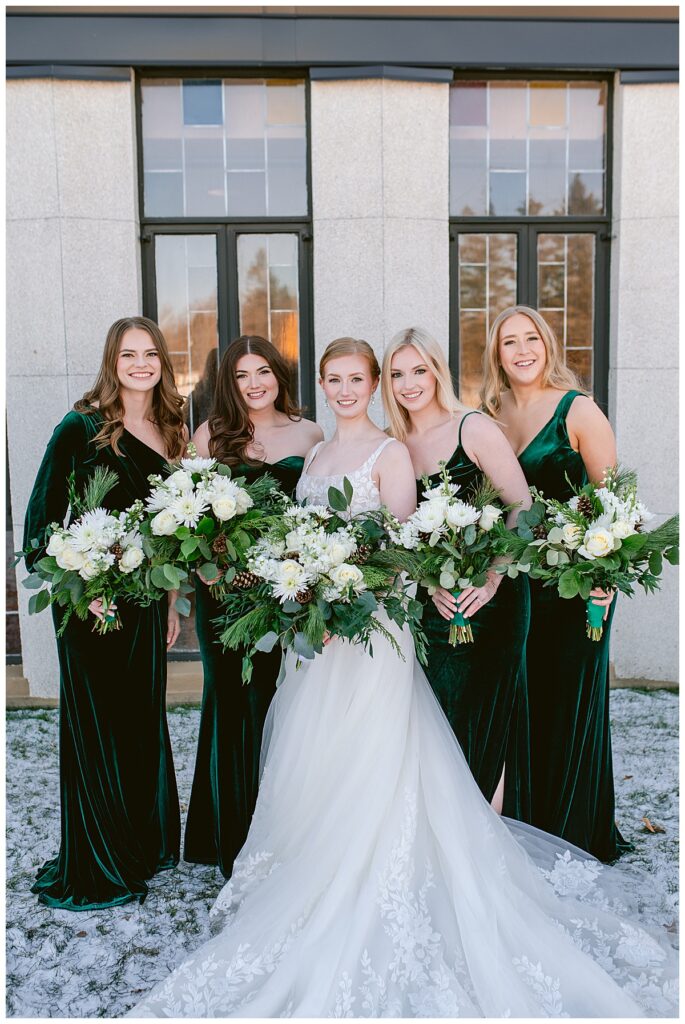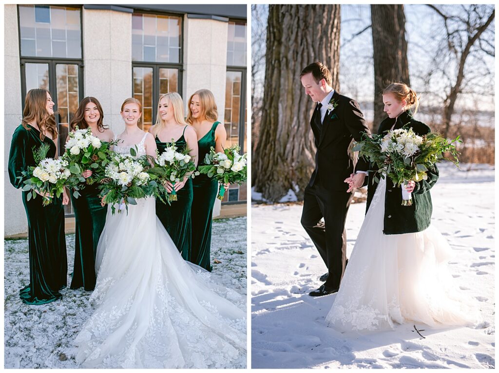 One of the standout features of this winter wedding was the bridesmaids’ attire. Instead of the traditional winter colors, Raina opted for a stunning and unexpected choice – emerald green velvet dresses from Revelry. The men wore sharp grey suits from Men’s Warehouse that accented the women’s dresses well. The rich, deep green added a touch of warmth to the winter scene, and the luxurious velvet texture enhanced the overall elegance of the bridal party.