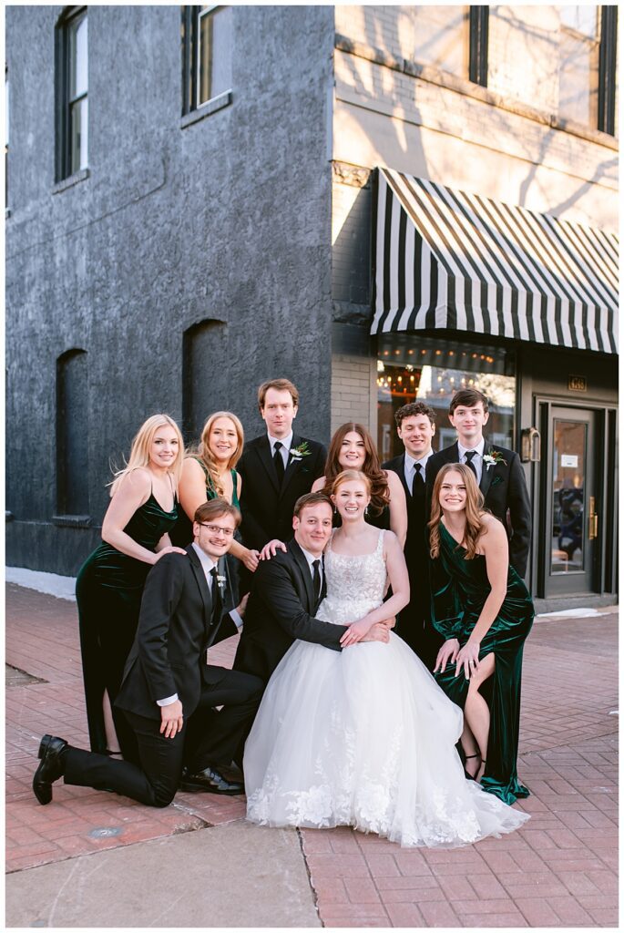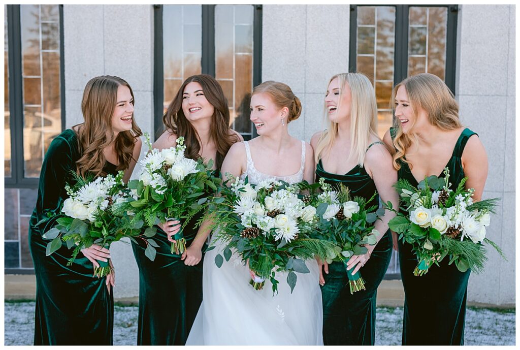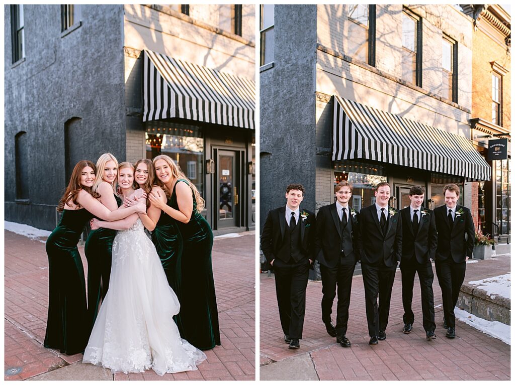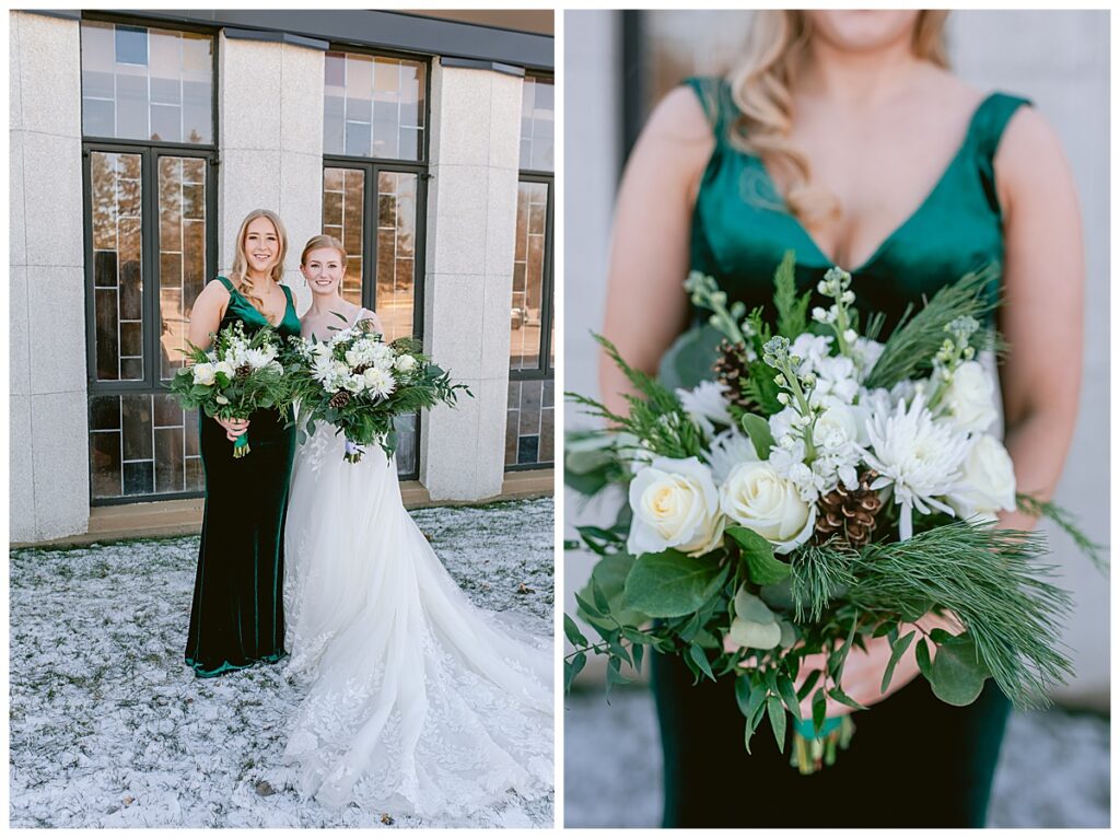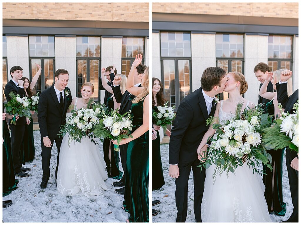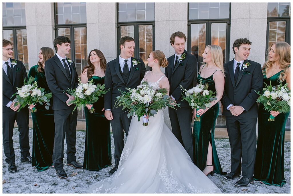 One of the standout features of this winter wedding was the bridesmaids’ attire. Instead of the traditional winter colors, Raina opted for a stunning and unexpected choice – emerald green velvet dresses from Revelry. The men wore sharp grey suits from Men’s Warehouse that accented the women’s dresses well. The rich, deep green added a touch of warmth to the winter scene, and the luxurious velvet texture enhanced the overall elegance of the bridal party.
