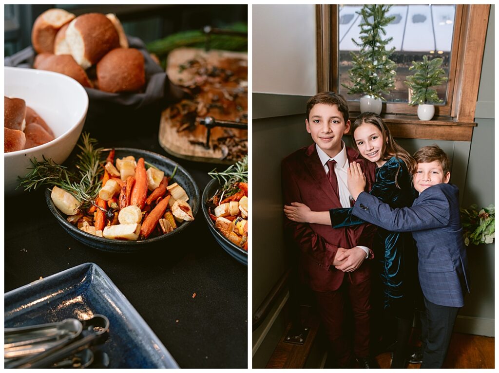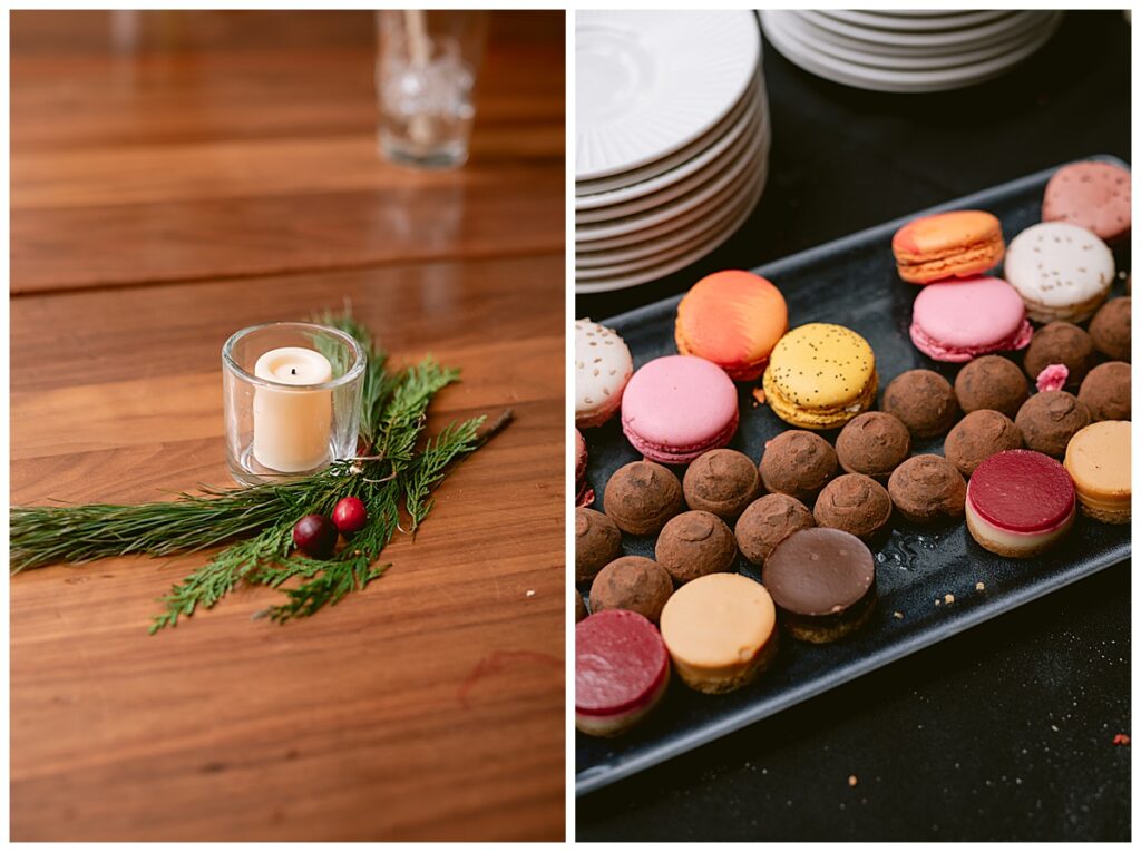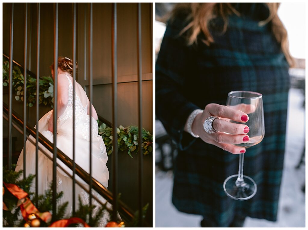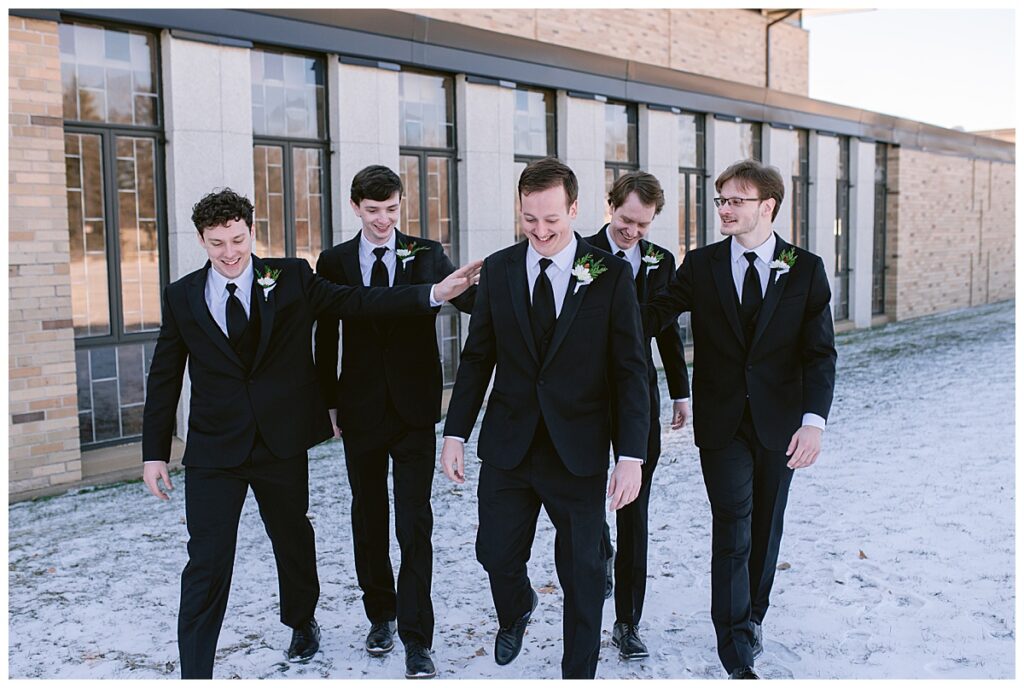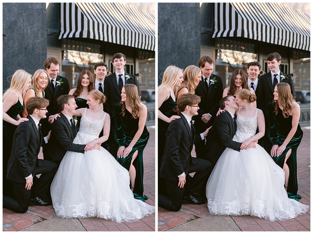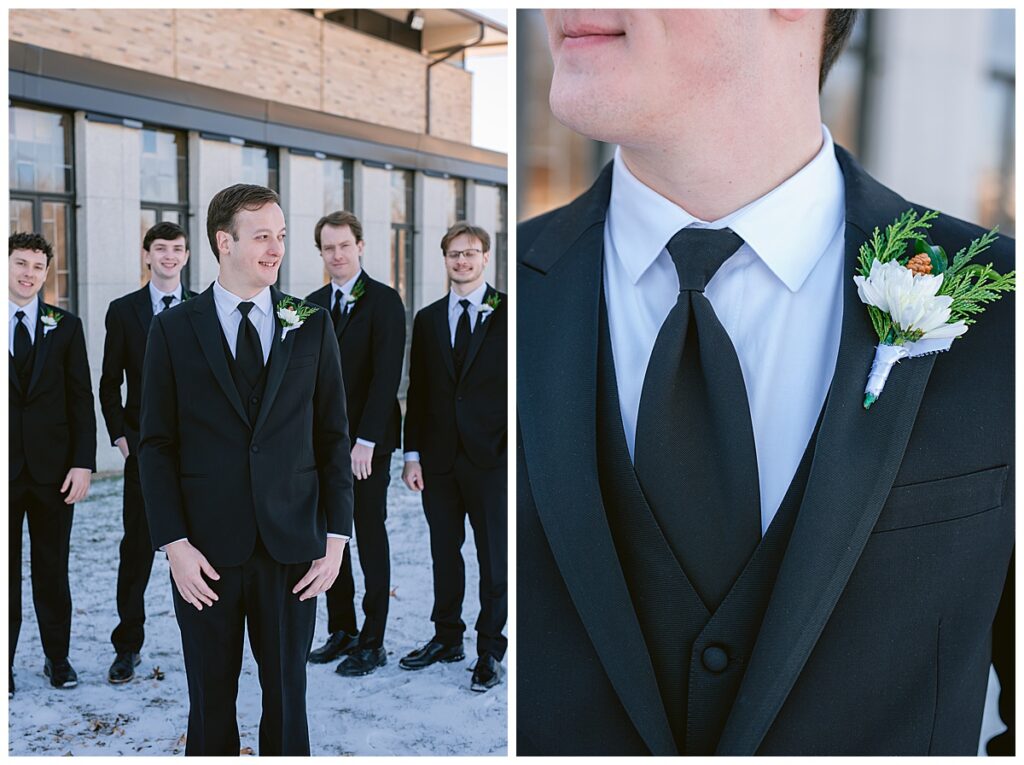 One of the standout features of this winter wedding was the bridesmaids’ attire. Instead of the traditional winter colors, Raina opted for a stunning and unexpected choice – emerald green velvet dresses from Revelry. The men wore sharp grey suits from Men’s Warehouse that accented the women’s dresses well. The rich, deep green added a touch of warmth to the winter scene, and the luxurious velvet texture enhanced the overall elegance of the bridal party.