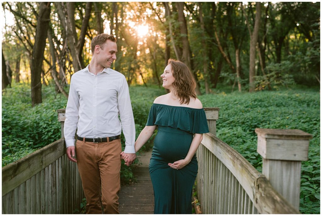 The soft summer light cast golden hues across the landscape of the park that Christy and Kyle chose to take their maternity photos at. Anxiously awaiting the arrival of their first baby, a son, Christy wore a perfect emerald green dress that highlighted her eyes and stood out against the golden hues.