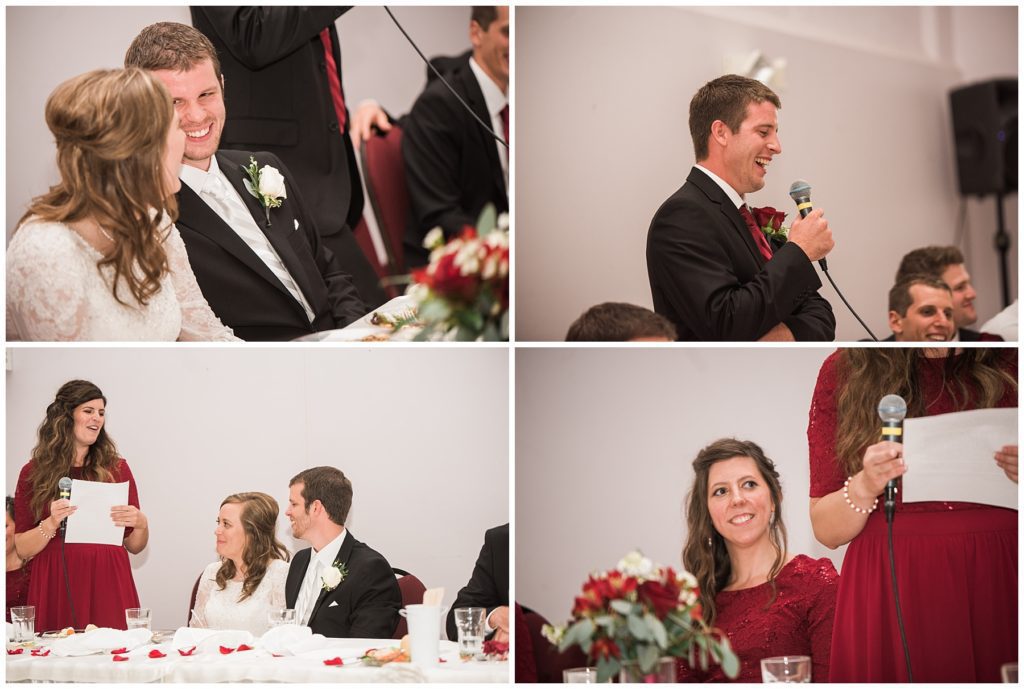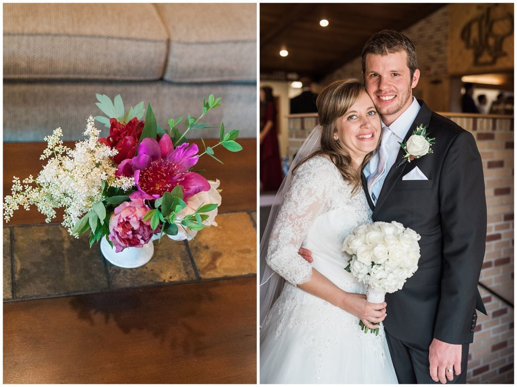 Bekah’s elegant lace dress from David’s Bridal was a perfect match to Jeremy’s black suit and white classic tie from Halberstadt’s. Her bridesmaids wore beautiful maroon dresses with lace sleeves that matched Bekah’s wedding dres
