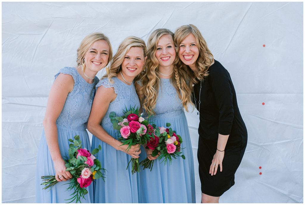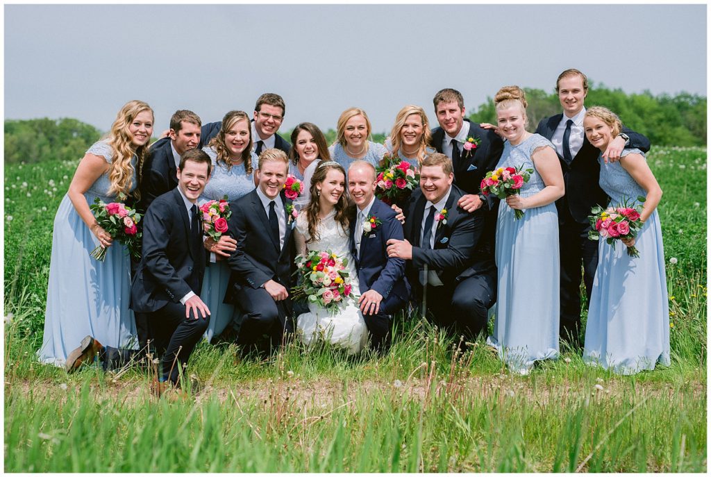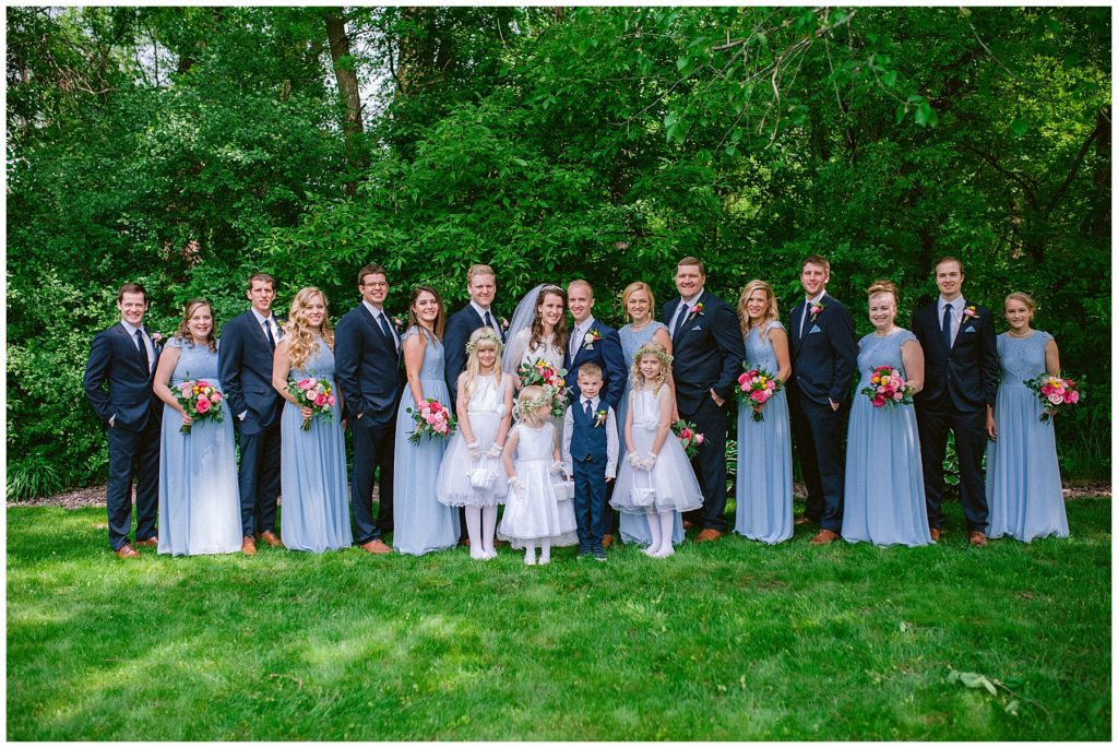 Anne’s beautiful lace wedding dress from the Wedding Shoppe paired perfectly with the periwinkle dresses that the bridesmaids wore. The baby’s breath and greenery bouquets popped when paired with the navy suits that the men wore.