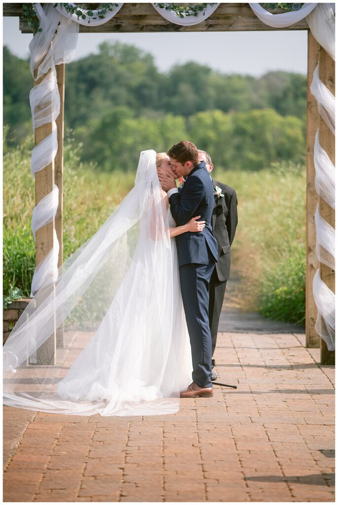 As the final touches were being made, the day moved gently into one of its most emotional moments: the first look. Kelly and Adam shared a quiet, private moment together, just the two of them, seeing each other before the ceremony began. There were tears, hugs, and so much love. Then, Keva joined in for her own little first look with mom and dad, tail wagging and tongue out, making it a moment no one would forget.