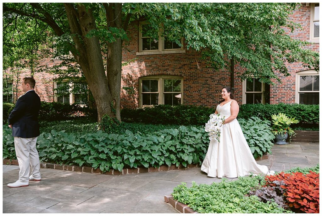 Tim and Milada chose to host their wedding at The Beach Club in Minneapolis. Located right off the Bde Maka Ska shoreline, the club is known for it’s class and elegance and provides the perfect backdrop for a beautiful urban wedding. Milada and her ladies began their morning getting ready with Sandy Xiong who did hair and make-up. They arrived at The Beach Club and got ready in the beautiful bridal suite where Milada mother helped her into her stunning dress from Vera’s House of Bridals. She and Tim chose to do their first look on the winding staircase, and then headed outdoors for photos on the streets in front of the club. The wedding party soon joined them with the ladies wearing blush colored dresses from David’s Bridal.The bouquets of garden roses and hydrangea from Richfiled Florals were the perfect accents when placed against the dresses and the classic black suits Tim and his groomsmen wore. We then headed to the green space near the club with the wedding party and had such a blast together with the men posing with croquet sticks (Tim’s favorite outdoor game!) and the women enjoying their time together.