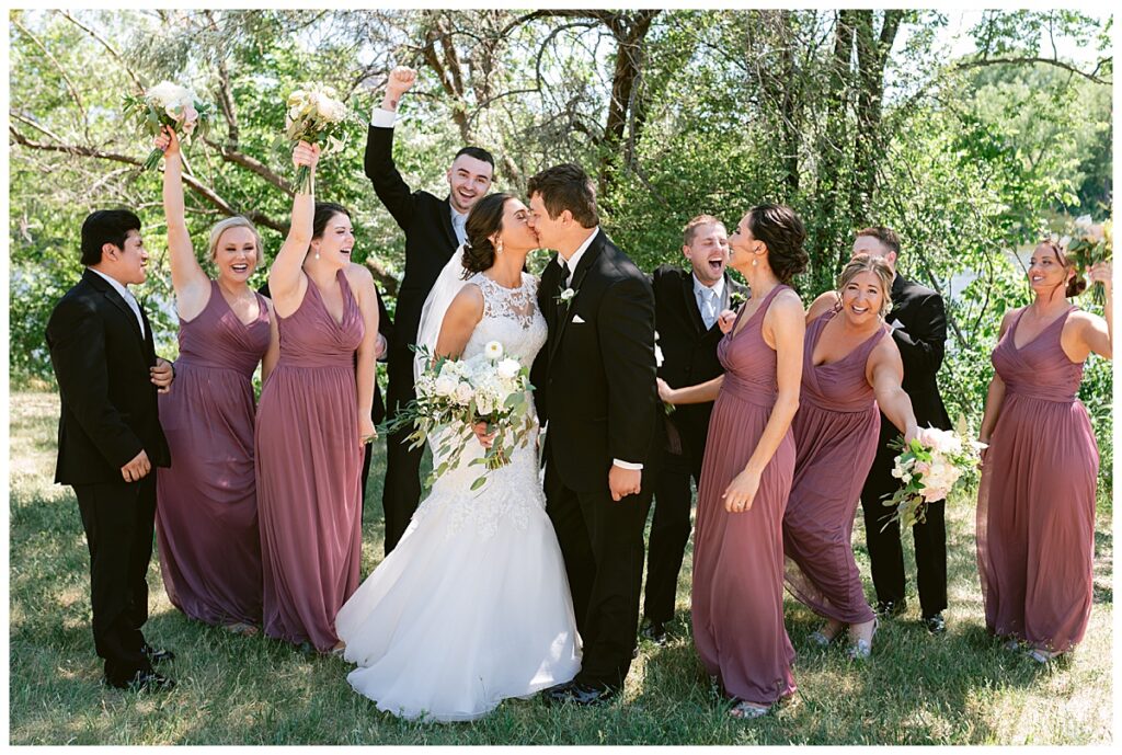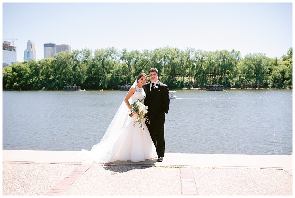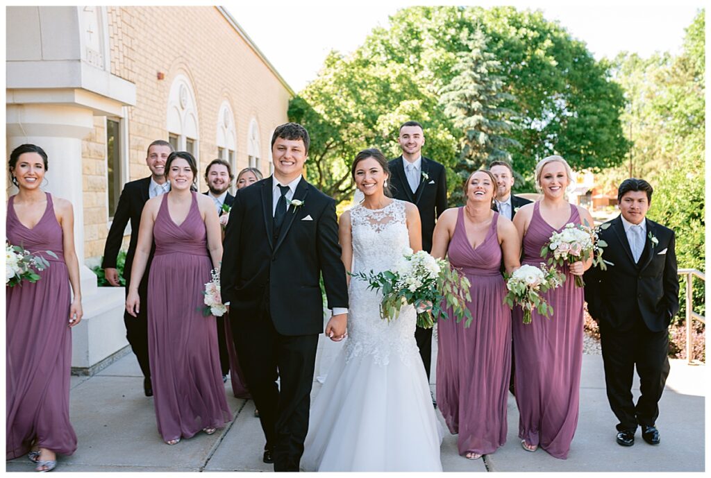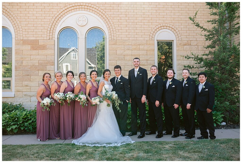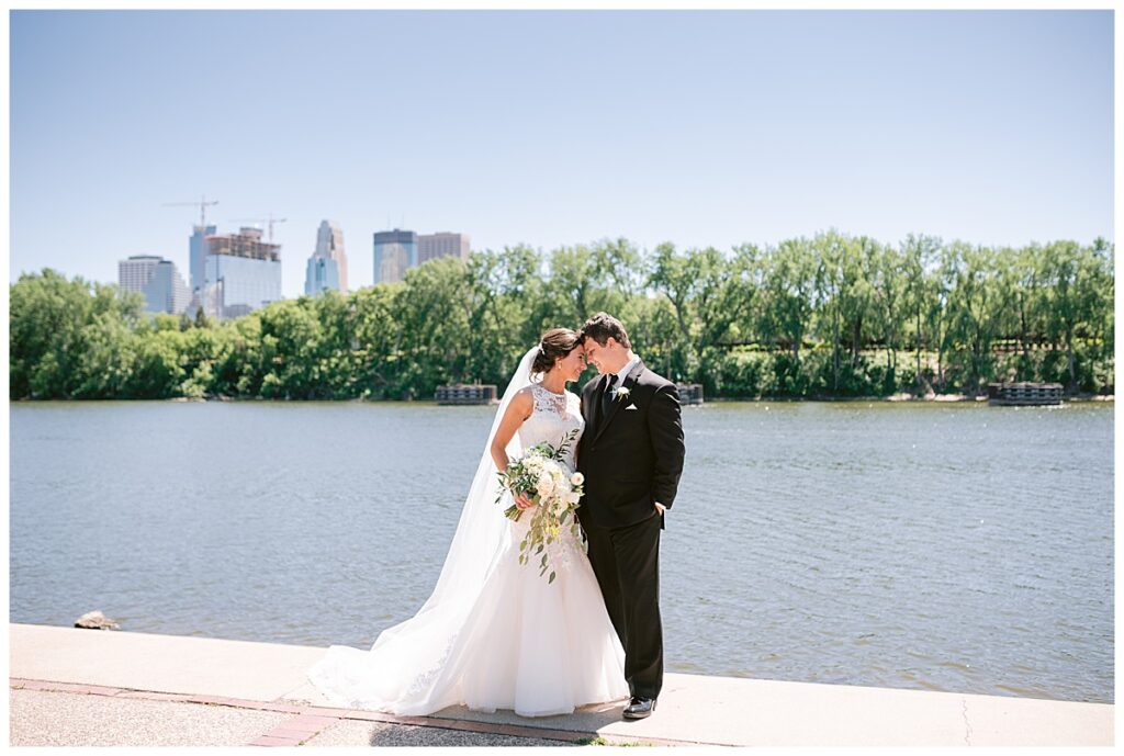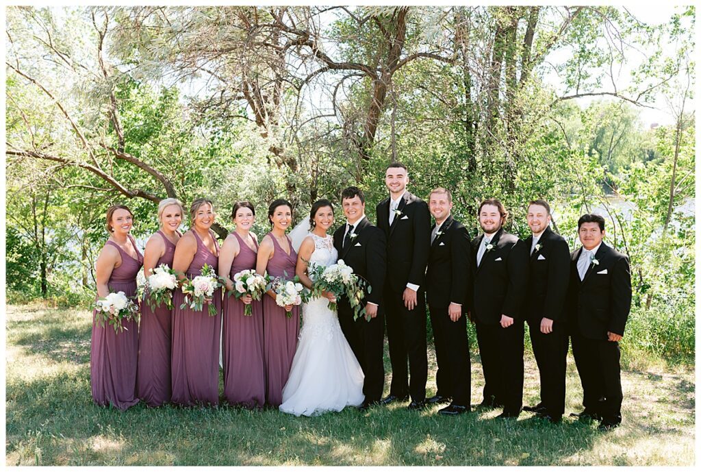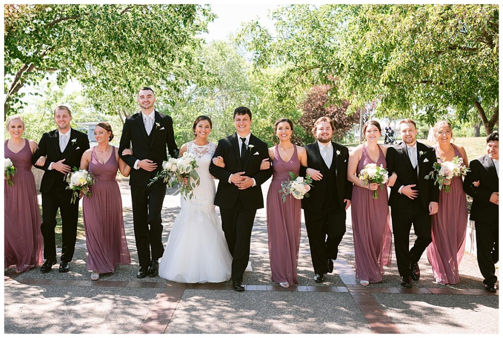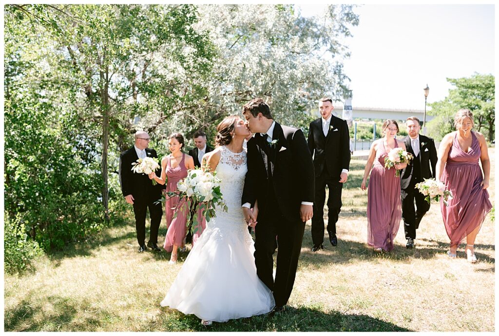 Because both Jessica and Nick love nature as well as Minneapolis, they decided to do their first look and many of the bridal party photos at Boom Island Park. Upon seeing Jess in her stunning gown from Our Shop Bridal, Nick held back tears as the couple saw each other for the first time. Jessica’s stunning bridal bouquet from Artemisia Studios was perfect when paired with the cathedral veil and lace back dress. The bridal party joined us, bridesmaids in lilac dresses from David’s Bridal and groomsmen in black tuxes from Savvi, and we had a fun time walking the park and the warmth of the summer day.