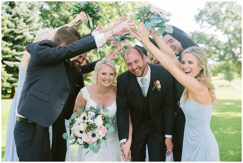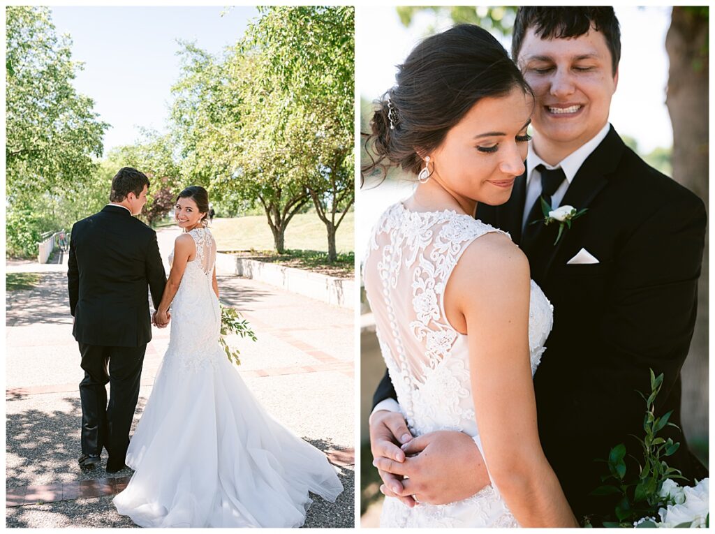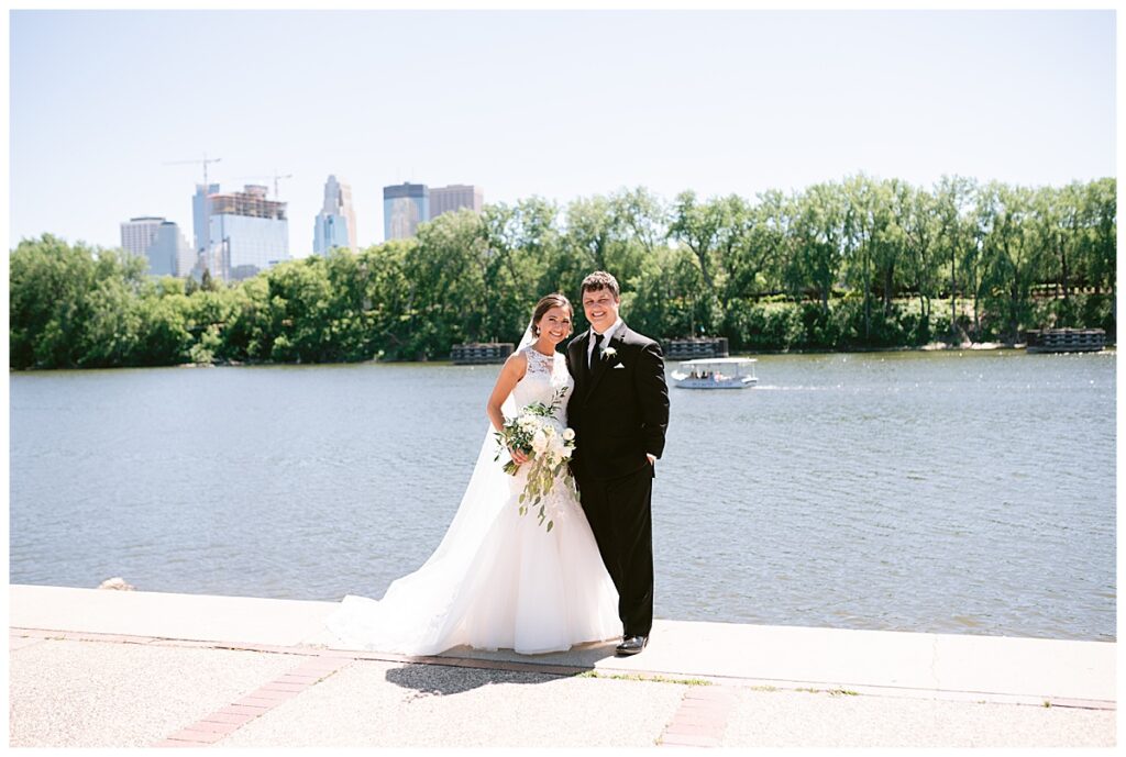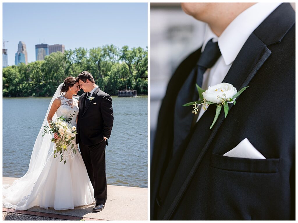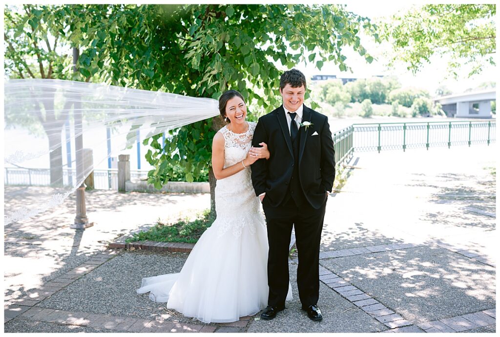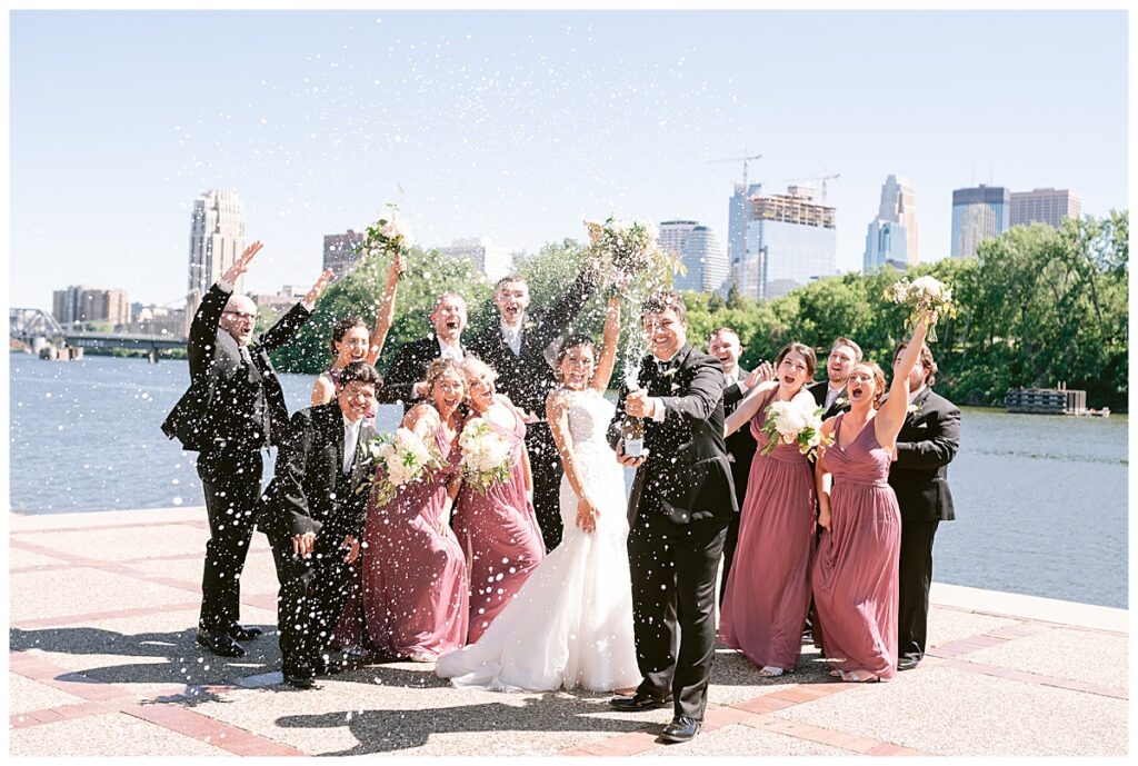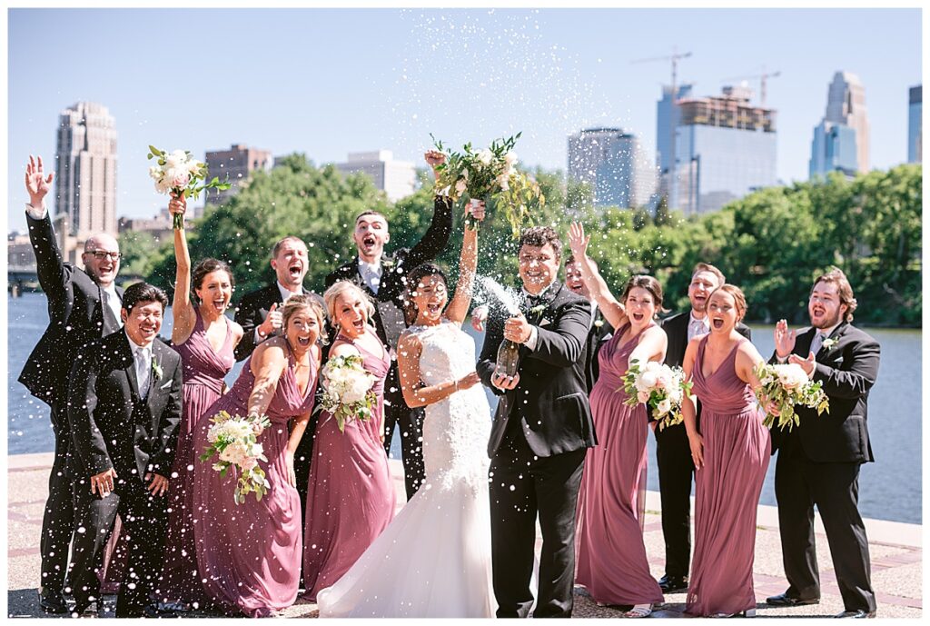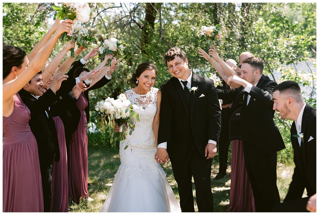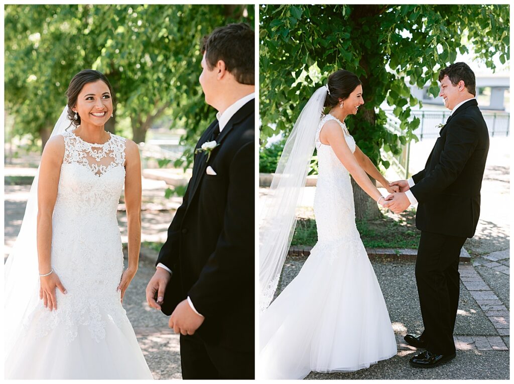 Because both Jessica and Nick love nature as well as Minneapolis, they decided to do their first look and many of the bridal party photos at Boom Island Park. Upon seeing Jess in her stunning gown from Our Shop Bridal, Nick held back tears as the couple saw each other for the first time. Jessica’s stunning bridal bouquet from Artemisia Studios was perfect when paired with the cathedral veil and lace back dress. The bridal party joined us, bridesmaids in lilac dresses from David’s Bridal and groomsmen in black tuxes from Savvi, and we had a fun time walking the park and the warmth of the summer day.