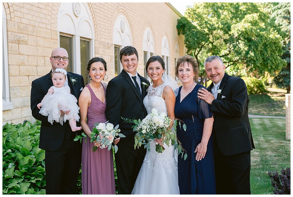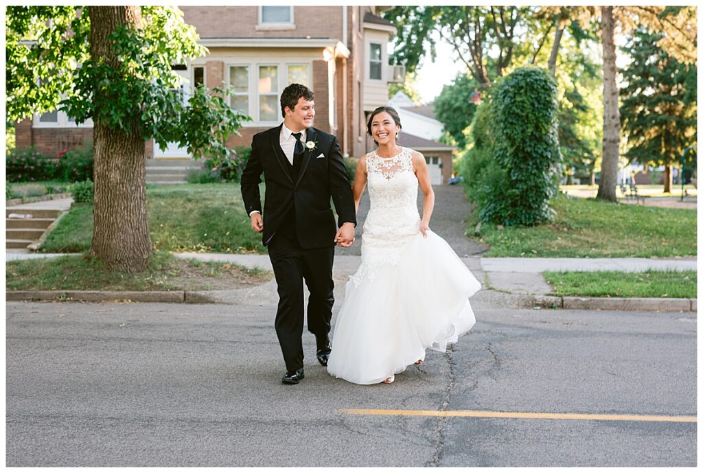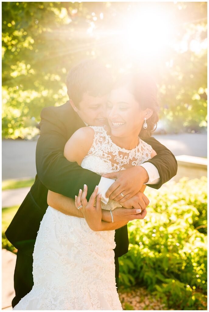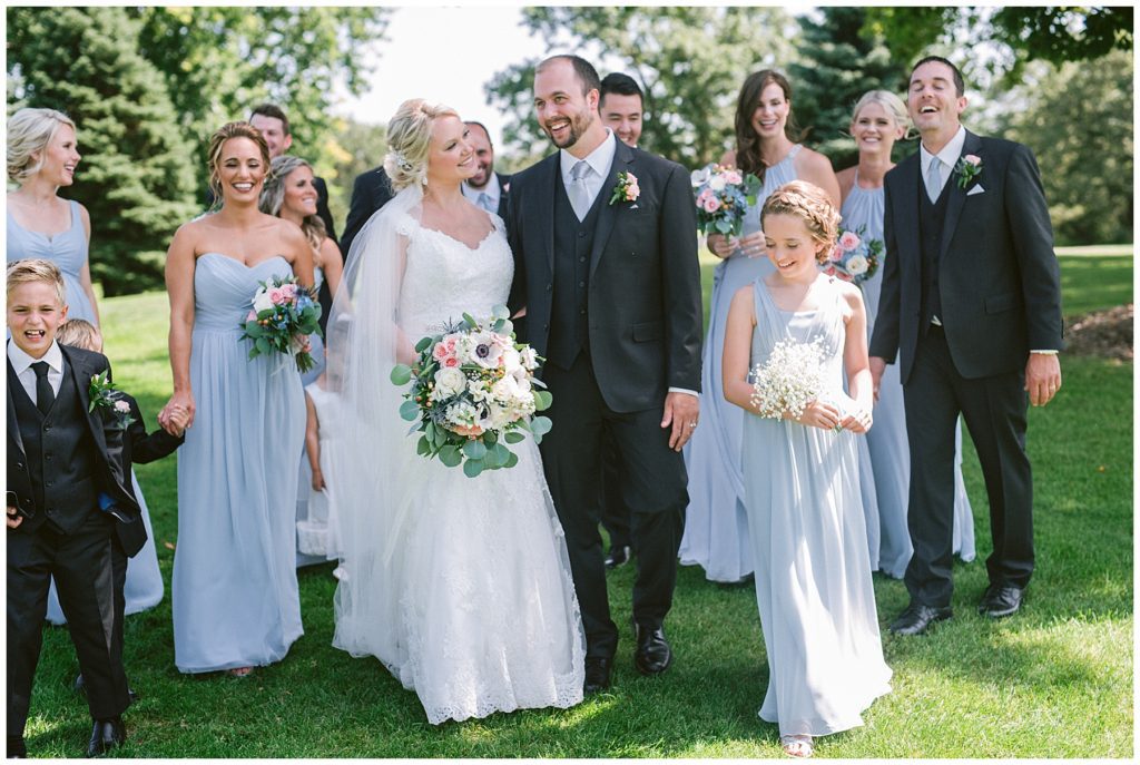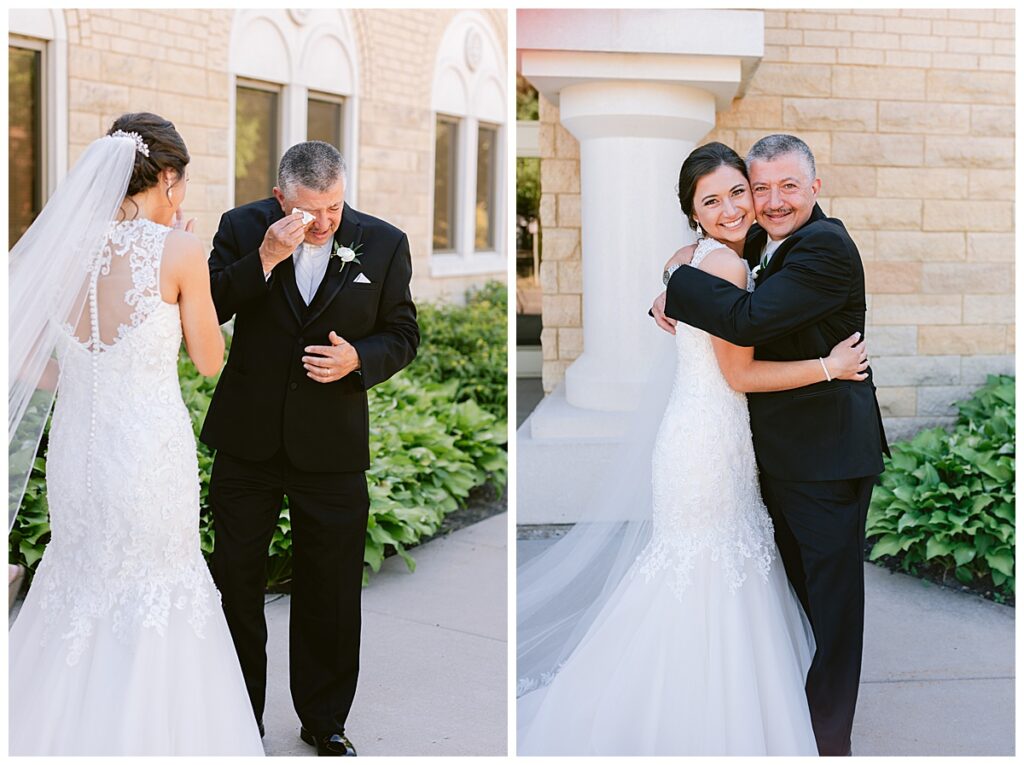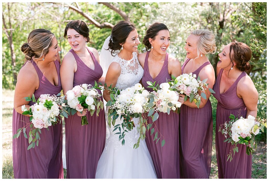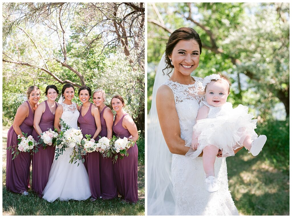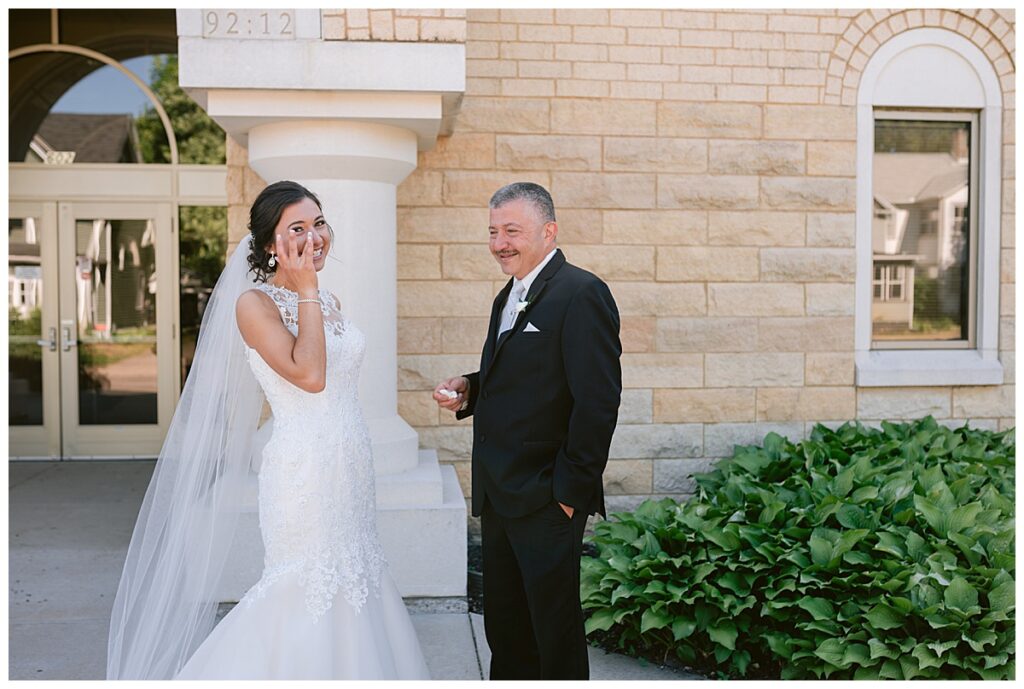 Because both Jessica and Nick love nature as well as Minneapolis, they decided to do their first look and many of the bridal party photos at Boom Island Park. Upon seeing Jess in her stunning gown from Our Shop Bridal, Nick held back tears as the couple saw each other for the first time. Jessica’s stunning bridal bouquet from Artemisia Studios was perfect when paired with the cathedral veil and lace back dress. The bridal party joined us, bridesmaids in lilac dresses from David’s Bridal and groomsmen in black tuxes from Savvi, and we had a fun time walking the park and the warmth of the summer day.