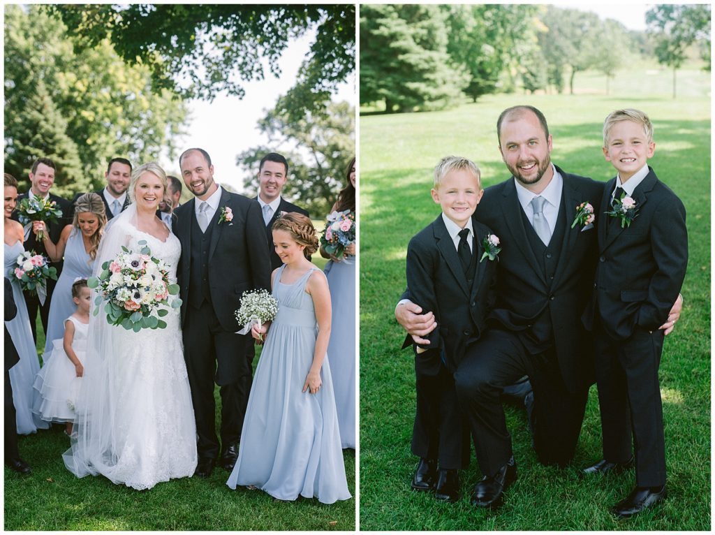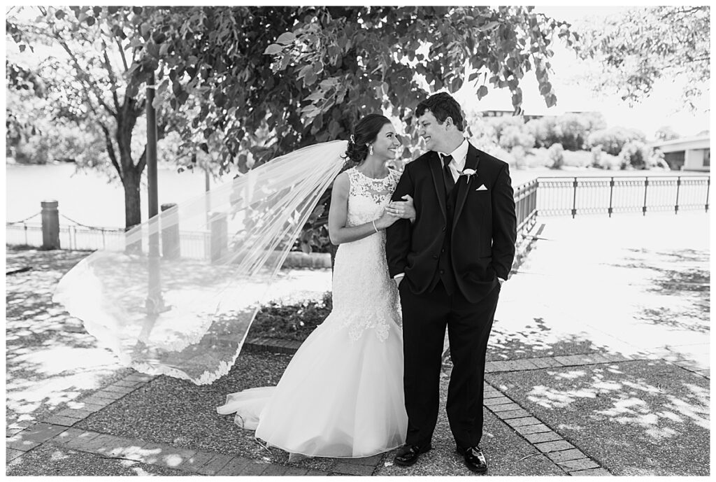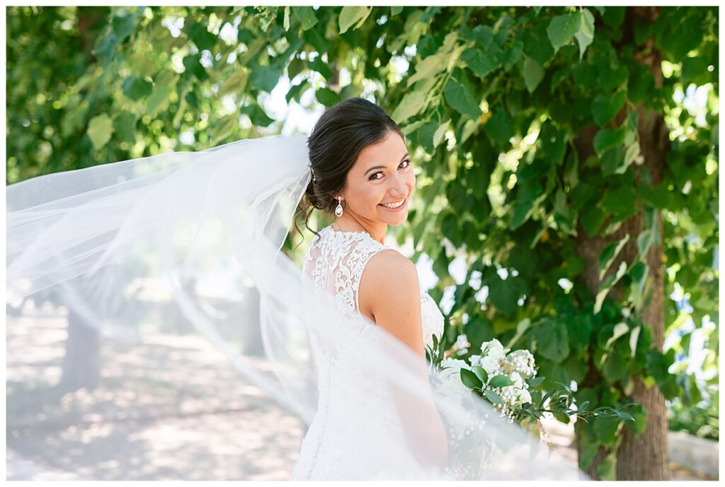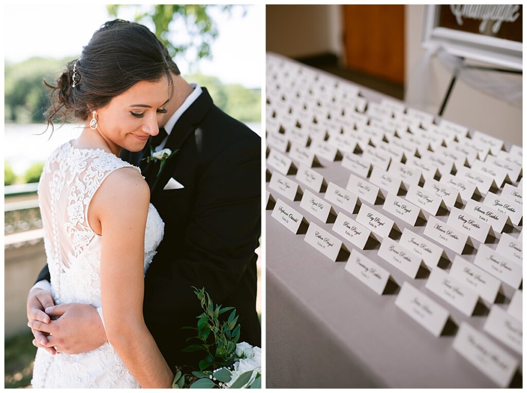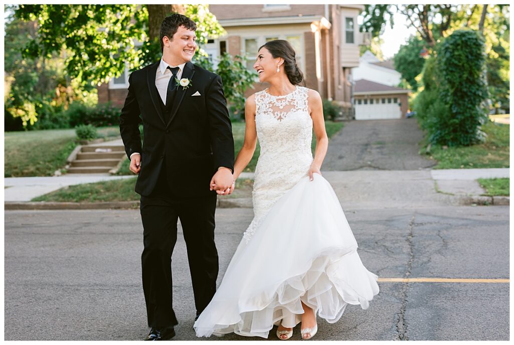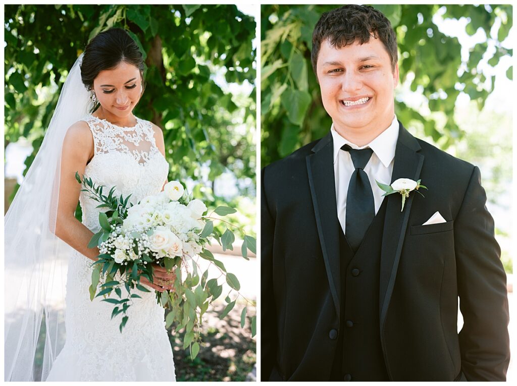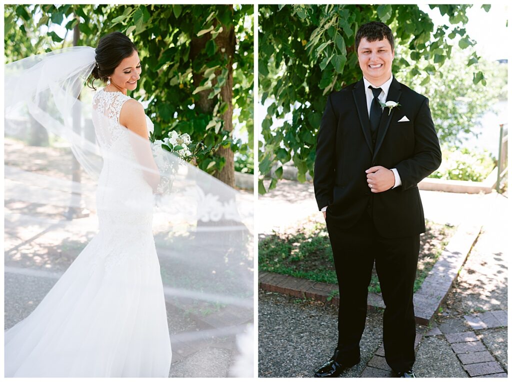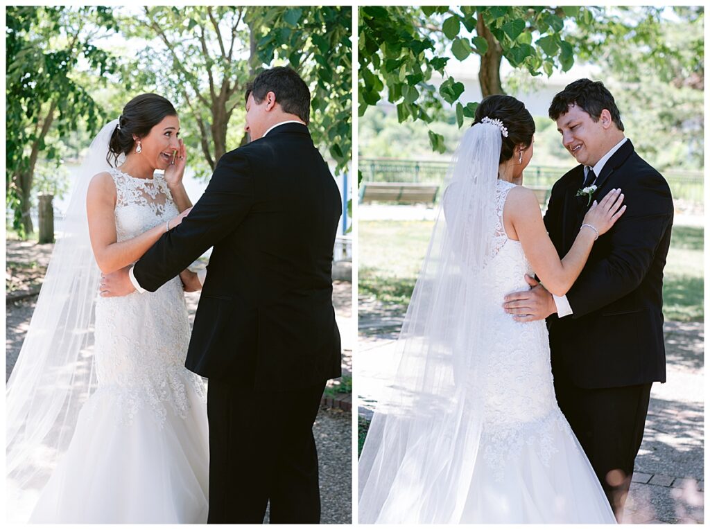 Because both Jessica and Nick love nature as well as Minneapolis, they decided to do their first look and many of the bridal party photos at Boom Island Park. Upon seeing Jess in her stunning gown from Our Shop Bridal, Nick held back tears as the couple saw each other for the first time. Jessica’s stunning bridal bouquet from Artemisia Studios was perfect when paired with the cathedral veil and lace back dress. The bridal party joined us, bridesmaids in lilac dresses from David’s Bridal and groomsmen in black tuxes from Savvi, and we had a fun time walking the park and the warmth of the summer day.