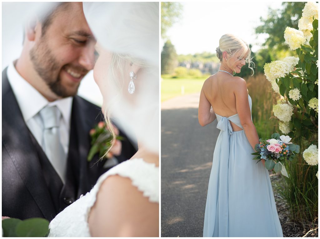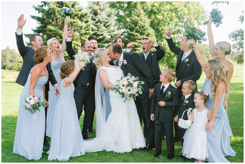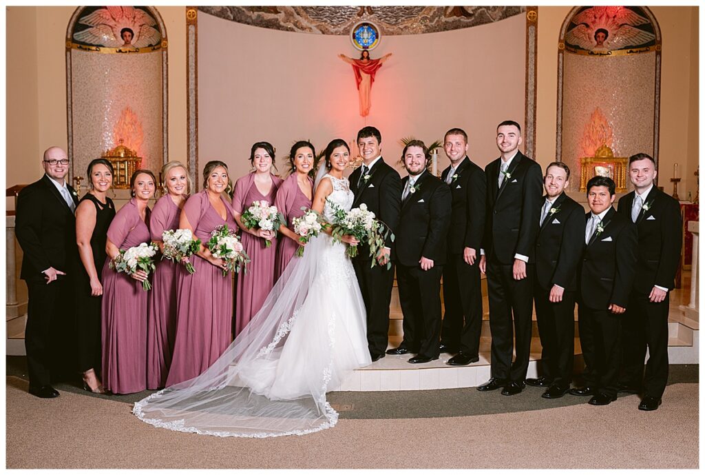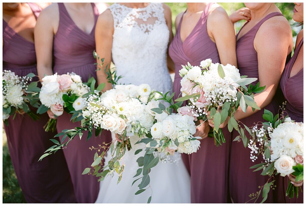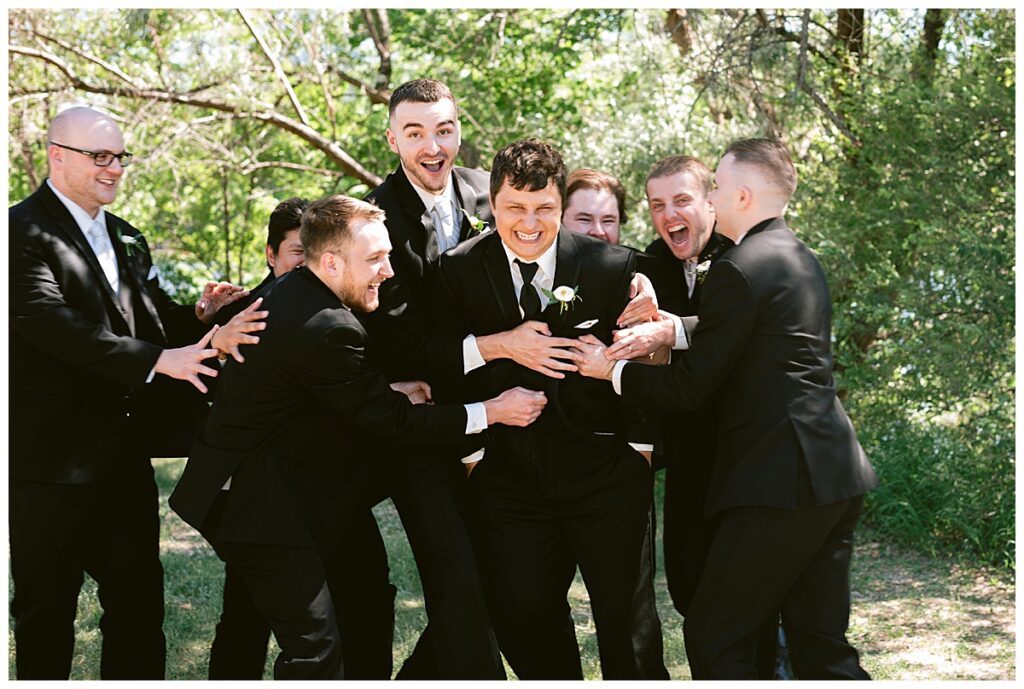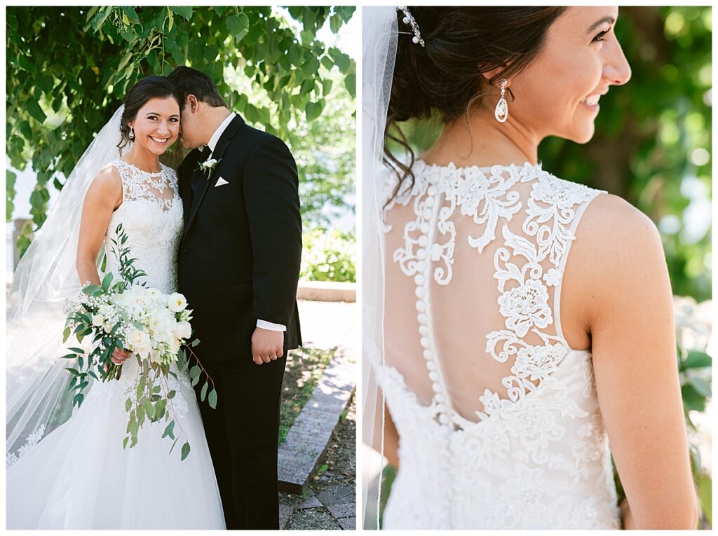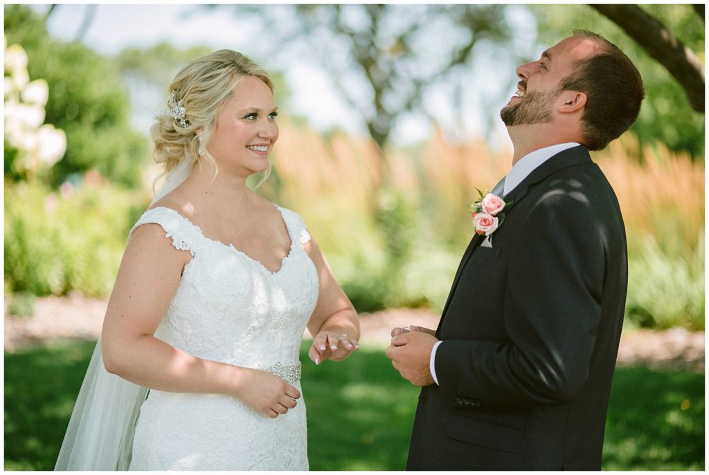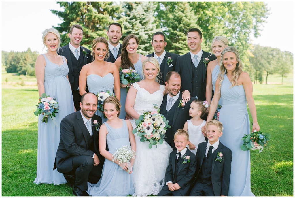 Because both Jessica and Nick love nature as well as Minneapolis, they decided to do their first look and many of the bridal party photos at Boom Island Park. Upon seeing Jess in her stunning gown from Our Shop Bridal, Nick held back tears as the couple saw each other for the first time. Jessica’s stunning bridal bouquet from Artemisia Studios was perfect when paired with the cathedral veil and lace back dress. The bridal party joined us, bridesmaids in lilac dresses from David’s Bridal and groomsmen in black tuxes from Savvi, and we had a fun time walking the park and the warmth of the summer day.