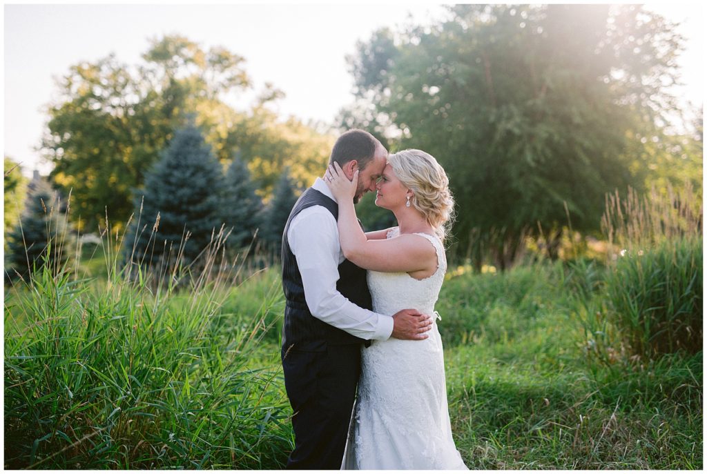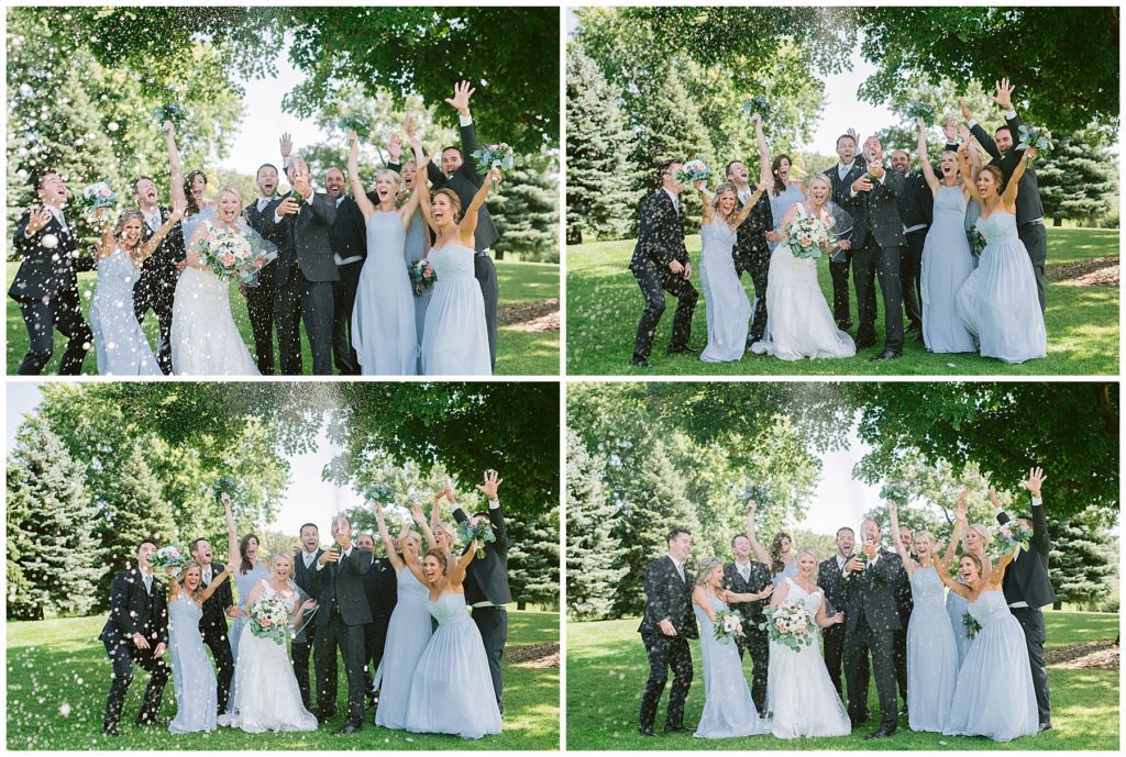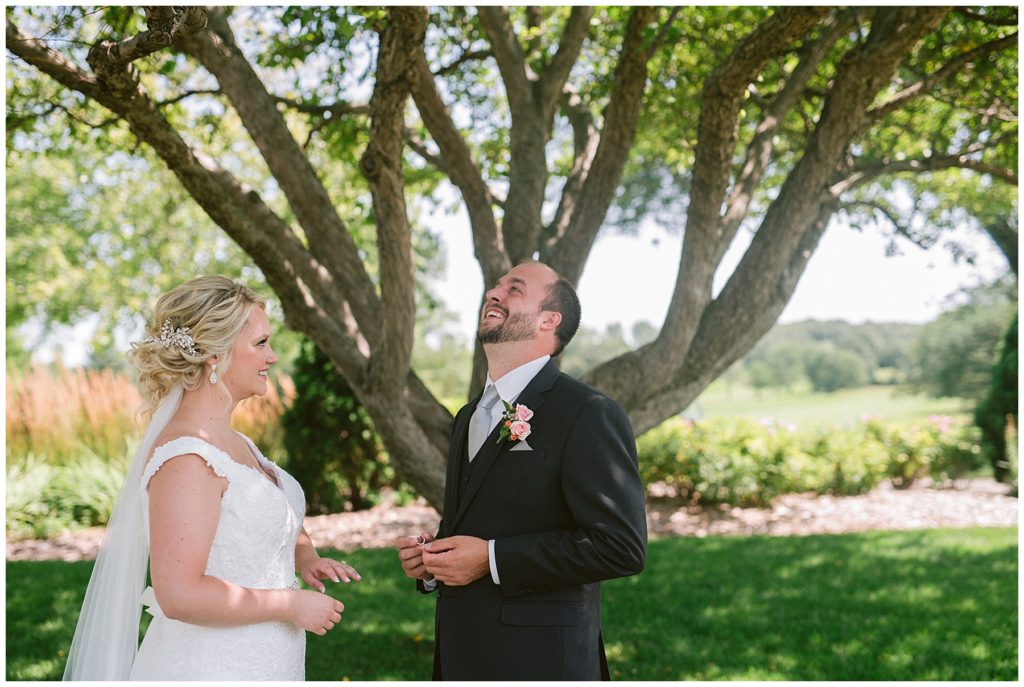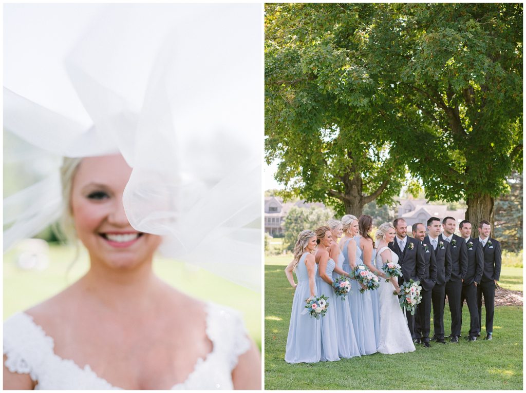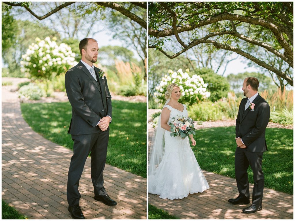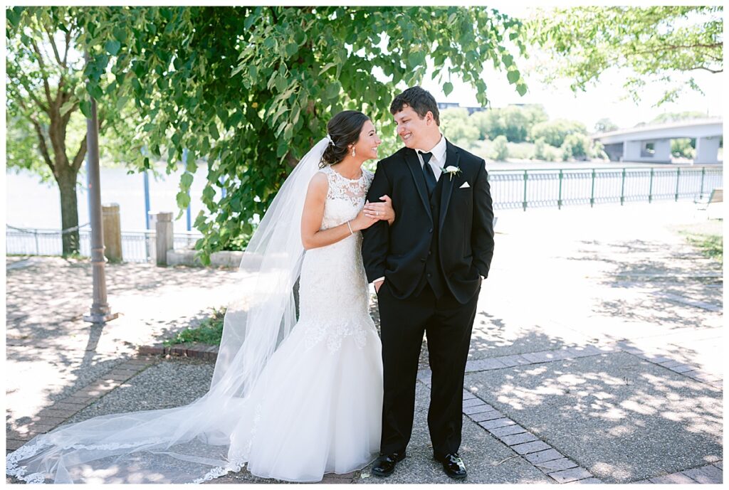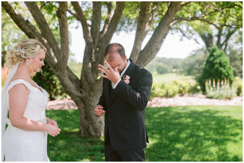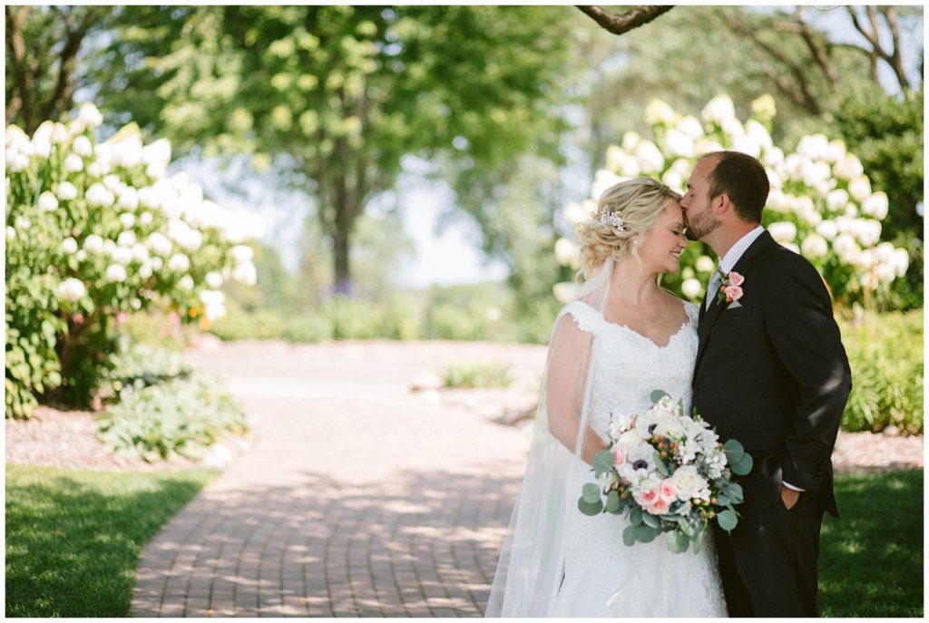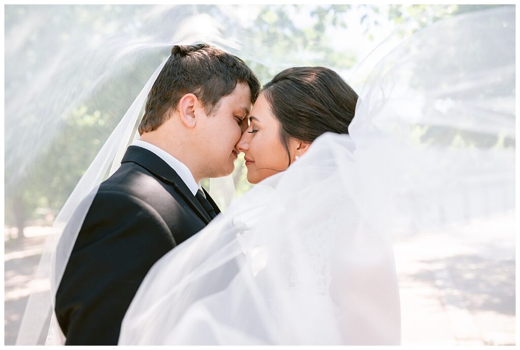 Because both Jessica and Nick love nature as well as Minneapolis, they decided to do their first look and many of the bridal party photos at Boom Island Park. Upon seeing Jess in her stunning gown from Our Shop Bridal, Nick held back tears as the couple saw each other for the first time. Jessica’s stunning bridal bouquet from Artemisia Studios was perfect when paired with the cathedral veil and lace back dress. The bridal party joined us, bridesmaids in lilac dresses from David’s Bridal and groomsmen in black tuxes from Savvi, and we had a fun time walking the park and the warmth of the summer day.