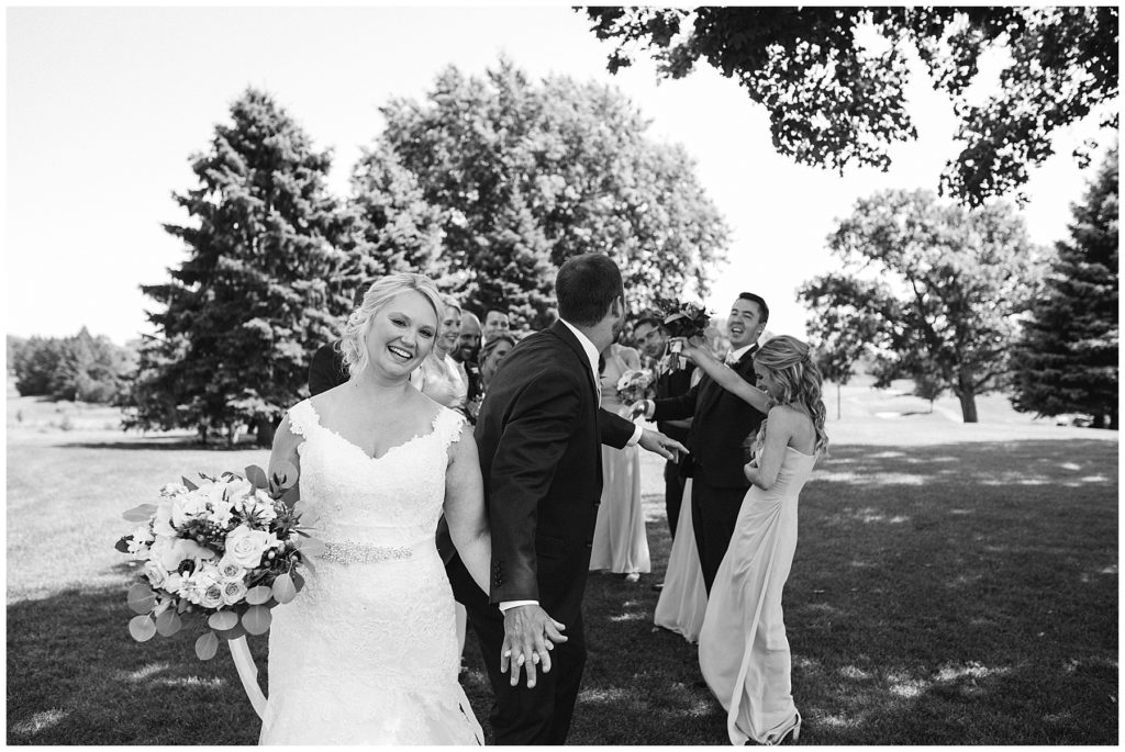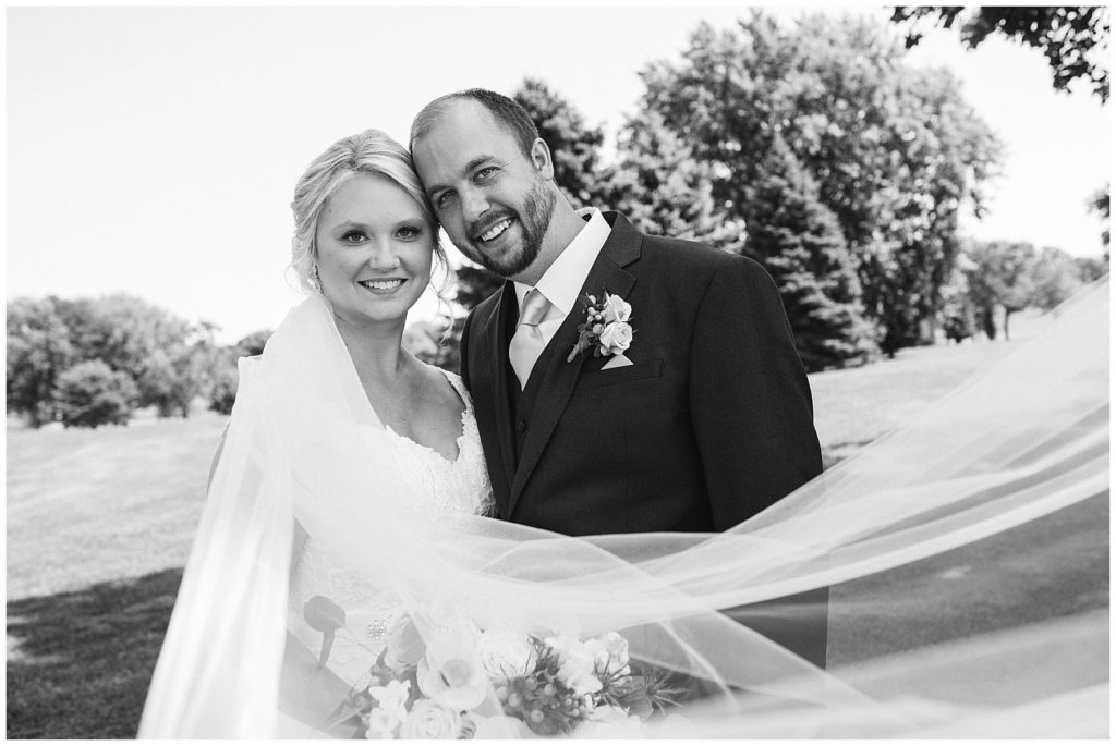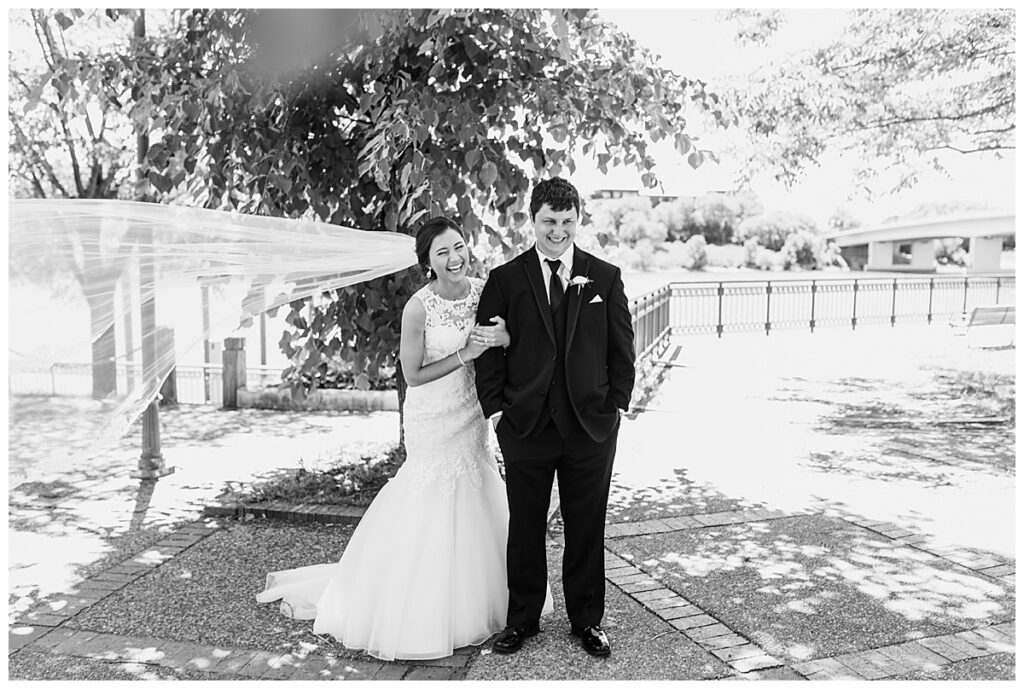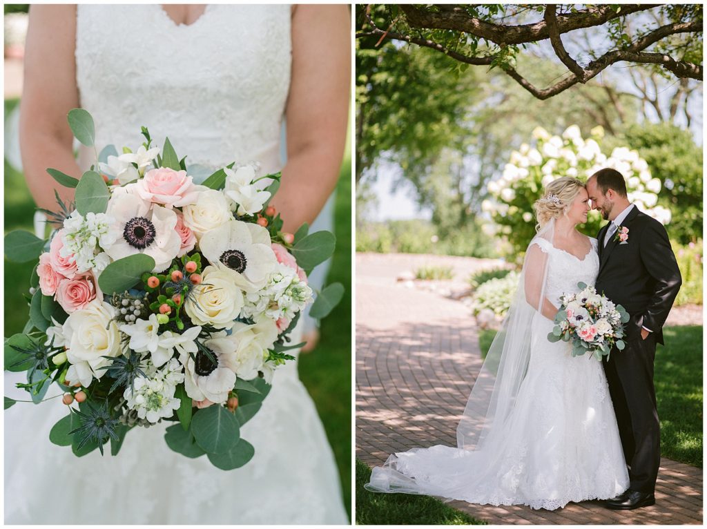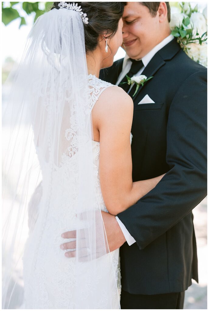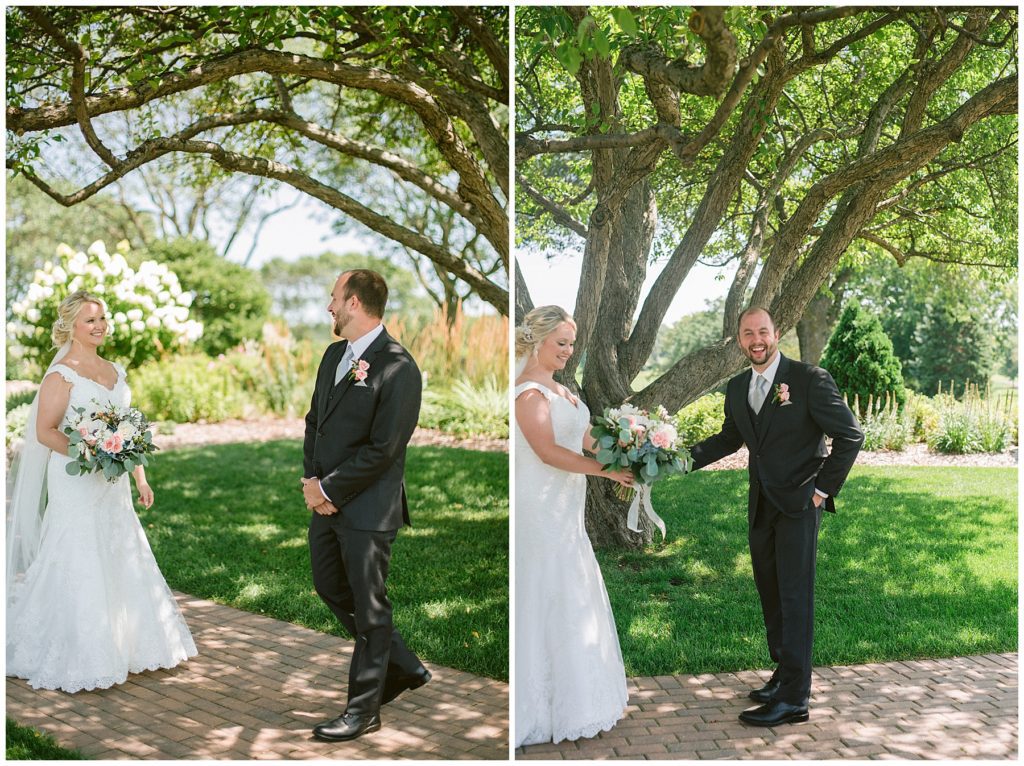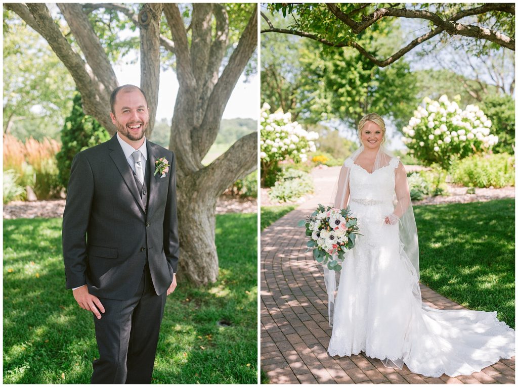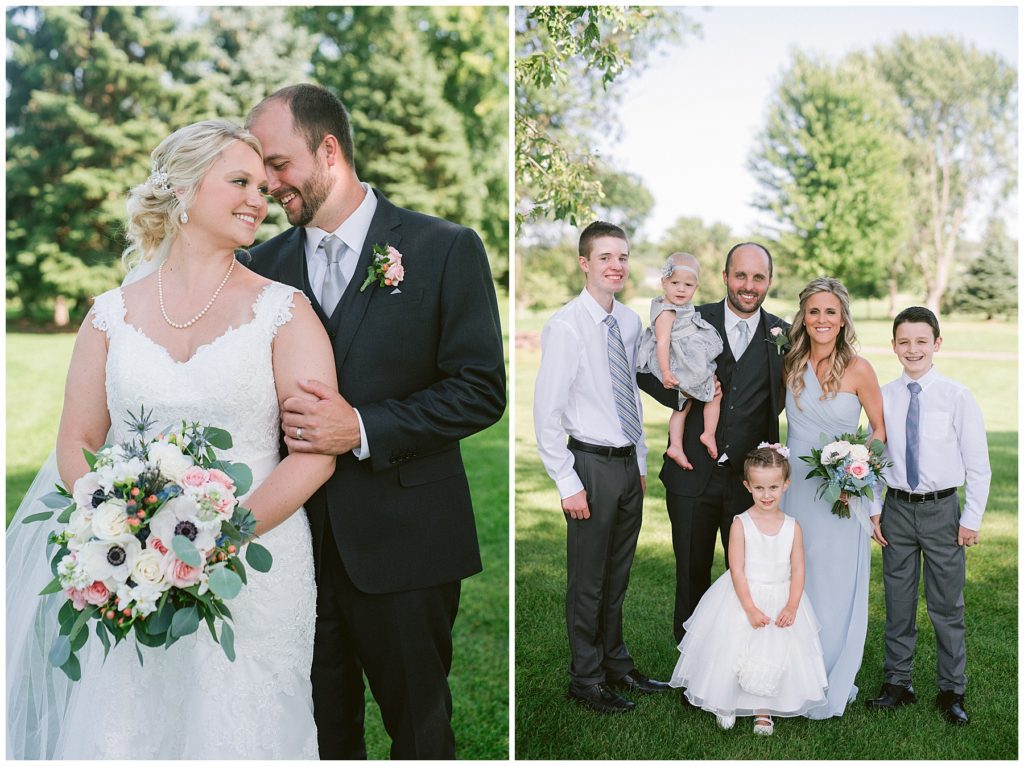 Because both Jessica and Nick love nature as well as Minneapolis, they decided to do their first look and many of the bridal party photos at Boom Island Park. Upon seeing Jess in her stunning gown from Our Shop Bridal, Nick held back tears as the couple saw each other for the first time. Jessica’s stunning bridal bouquet from Artemisia Studios was perfect when paired with the cathedral veil and lace back dress. The bridal party joined us, bridesmaids in lilac dresses from David’s Bridal and groomsmen in black tuxes from Savvi, and we had a fun time walking the park and the warmth of the summer day.