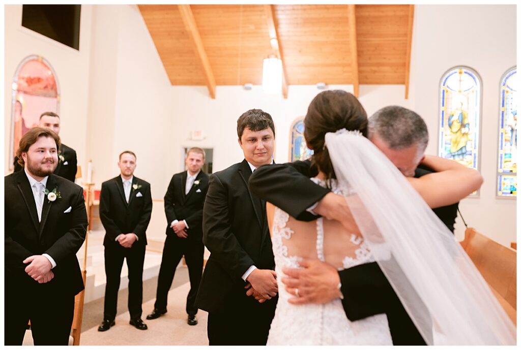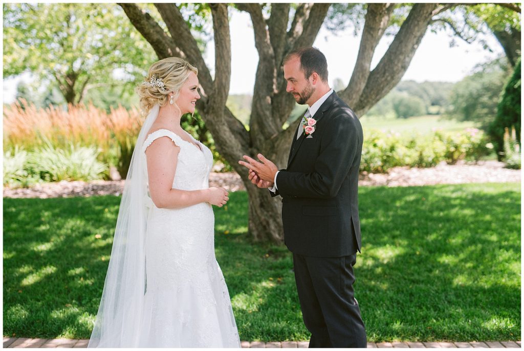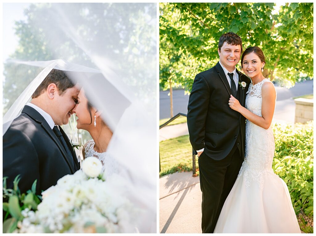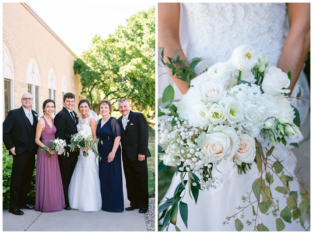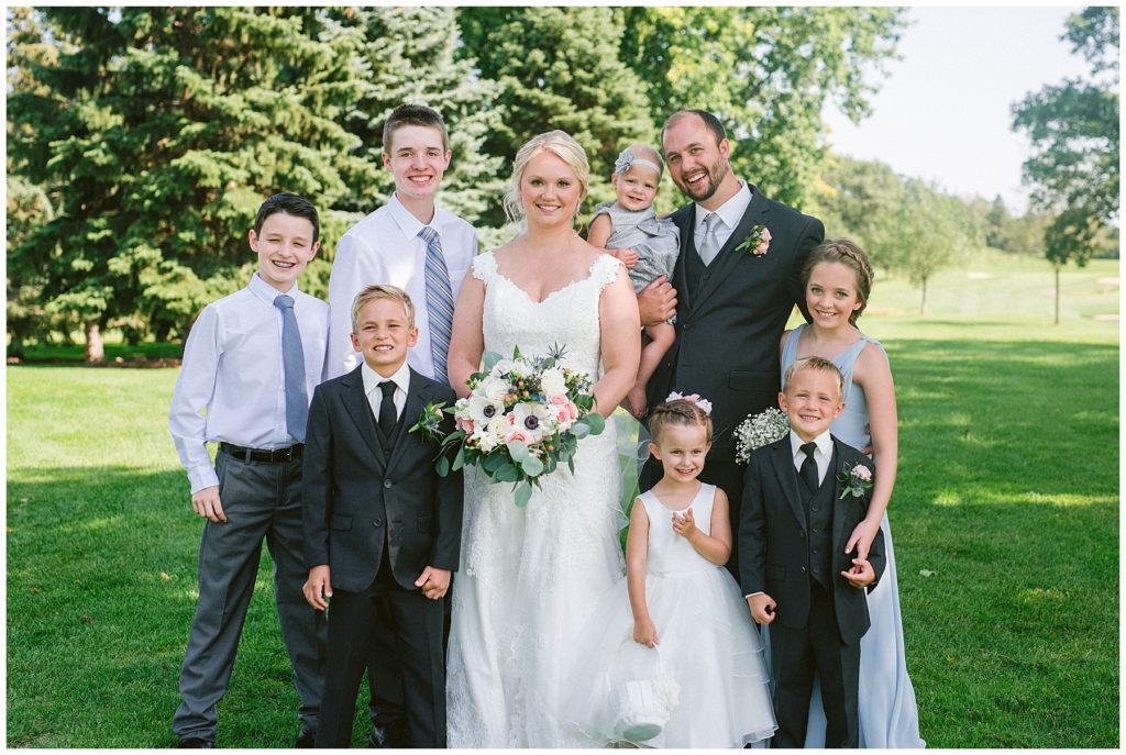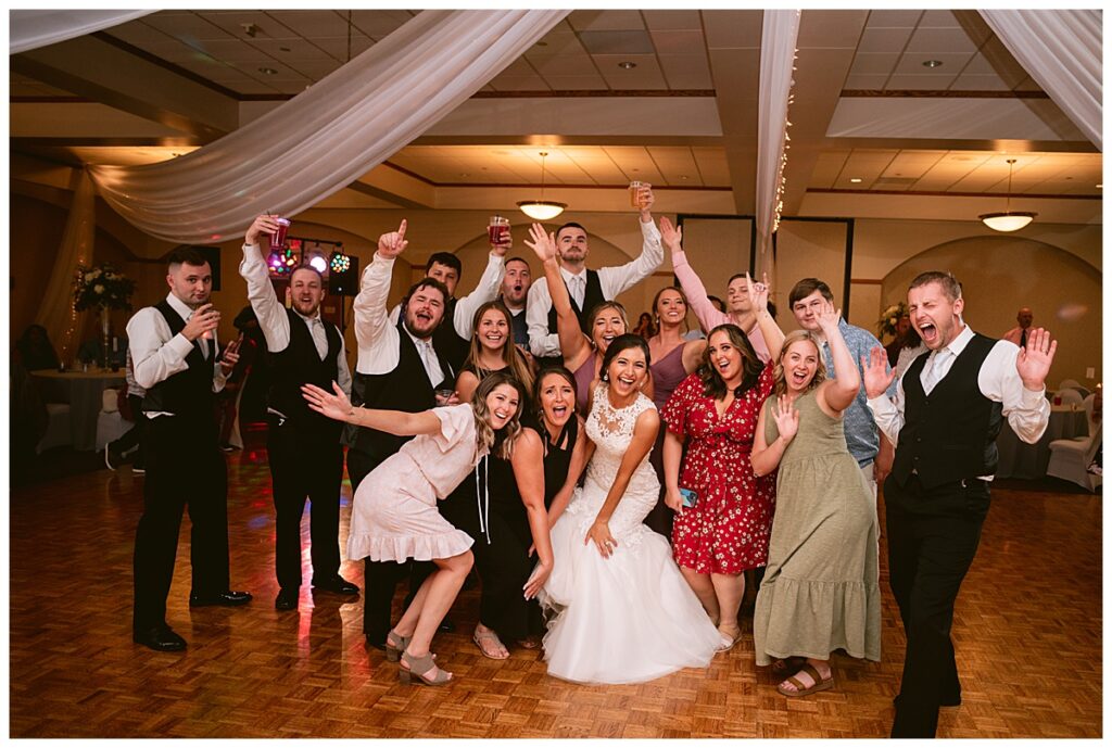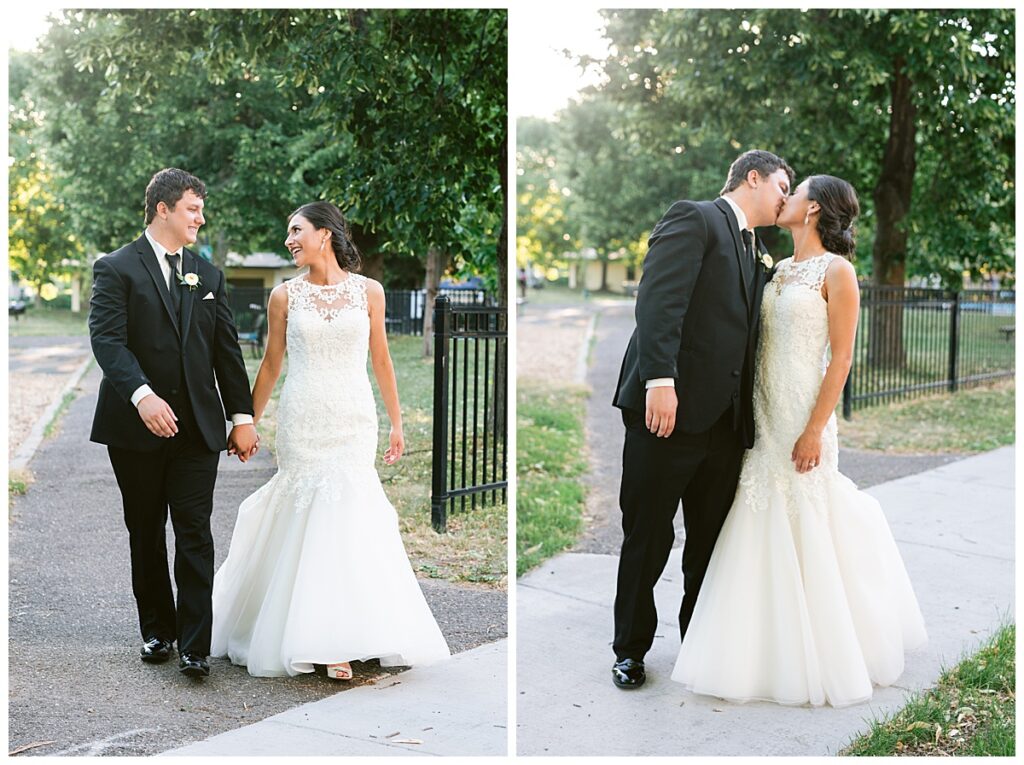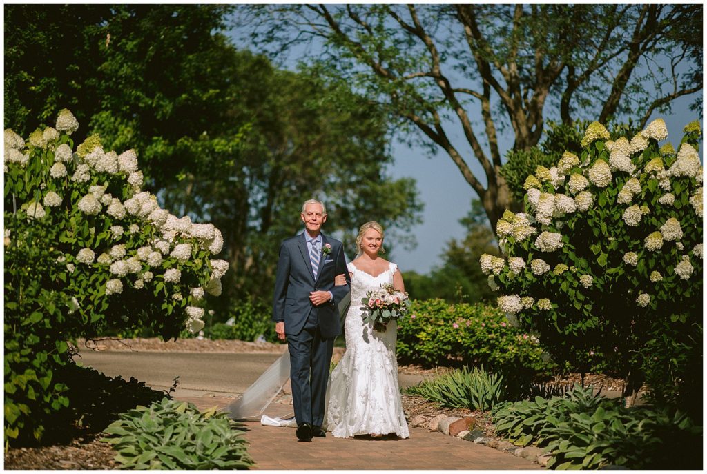 Because both Jessica and Nick love nature as well as Minneapolis, they decided to do their first look and many of the bridal party photos at Boom Island Park. Upon seeing Jess in her stunning gown from Our Shop Bridal, Nick held back tears as the couple saw each other for the first time. Jessica’s stunning bridal bouquet from Artemisia Studios was perfect when paired with the cathedral veil and lace back dress. The bridal party joined us, bridesmaids in lilac dresses from David’s Bridal and groomsmen in black tuxes from Savvi, and we had a fun time walking the park and the warmth of the summer day.