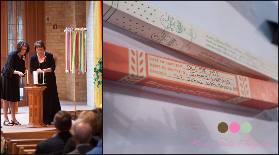 During the ceremony, the side candles that Jim and Jennifer used to light the unity candle were their baptism candles. I just loved this small detail that they added that was so meaningful.