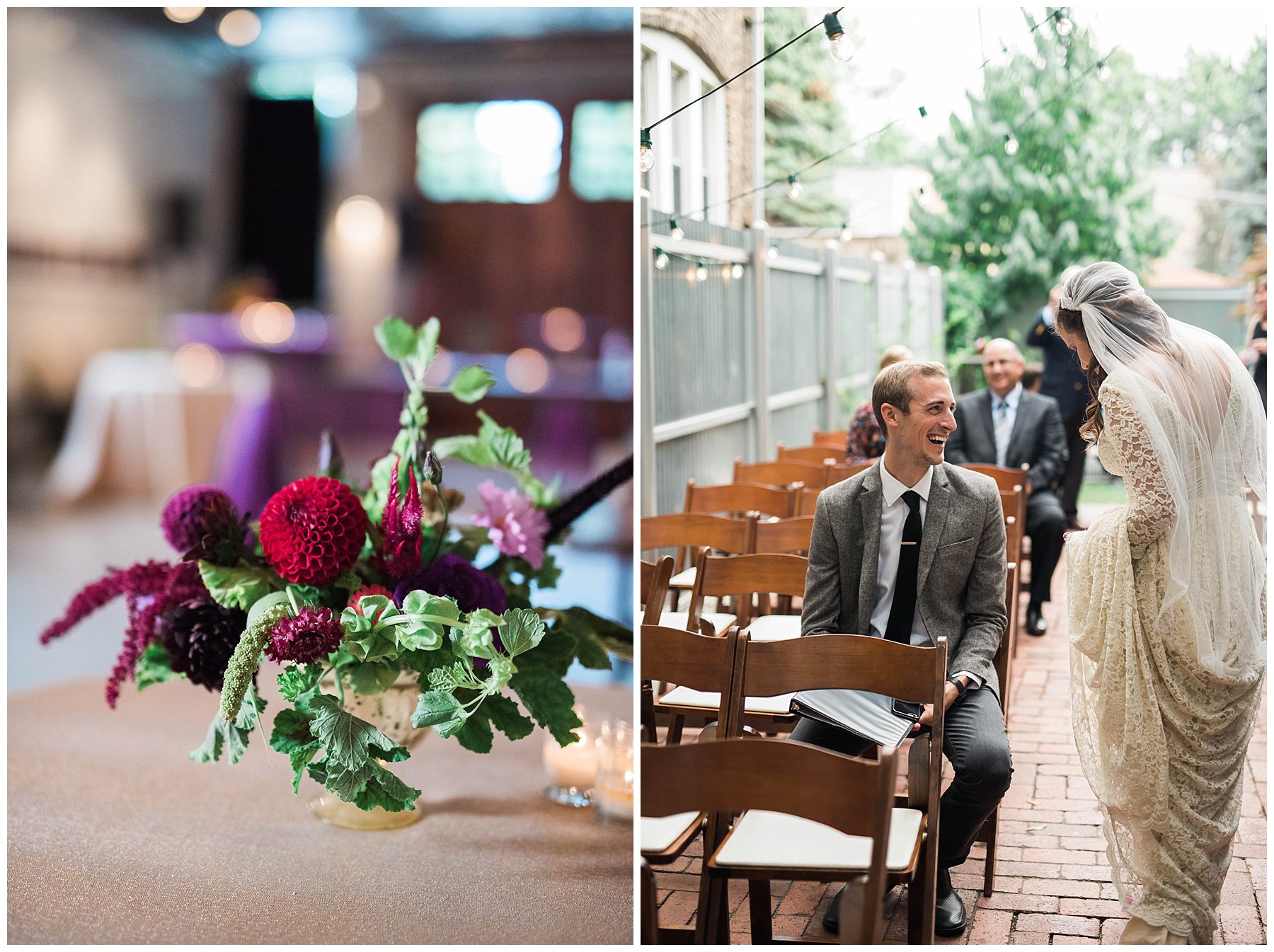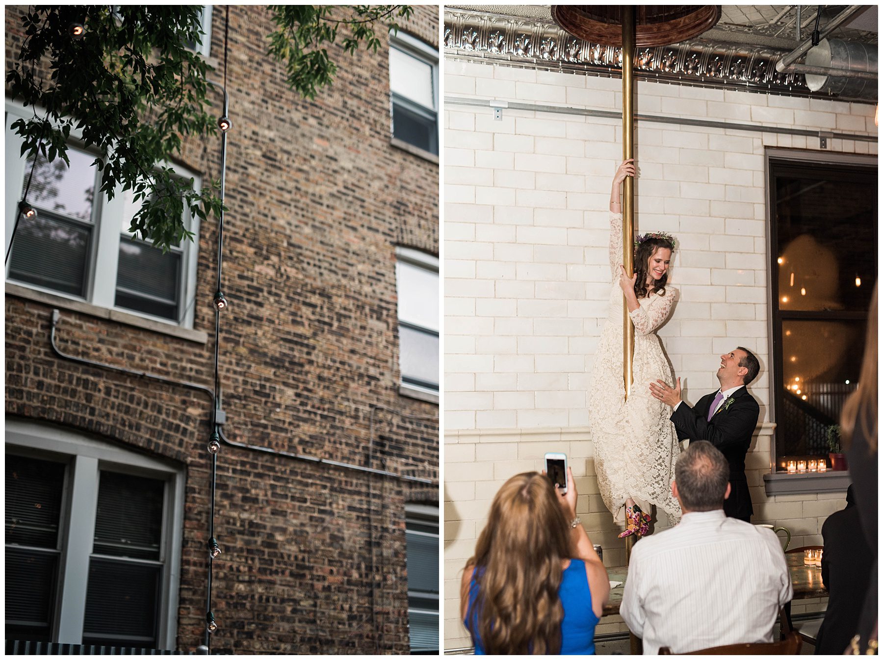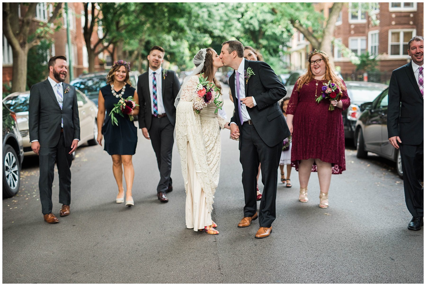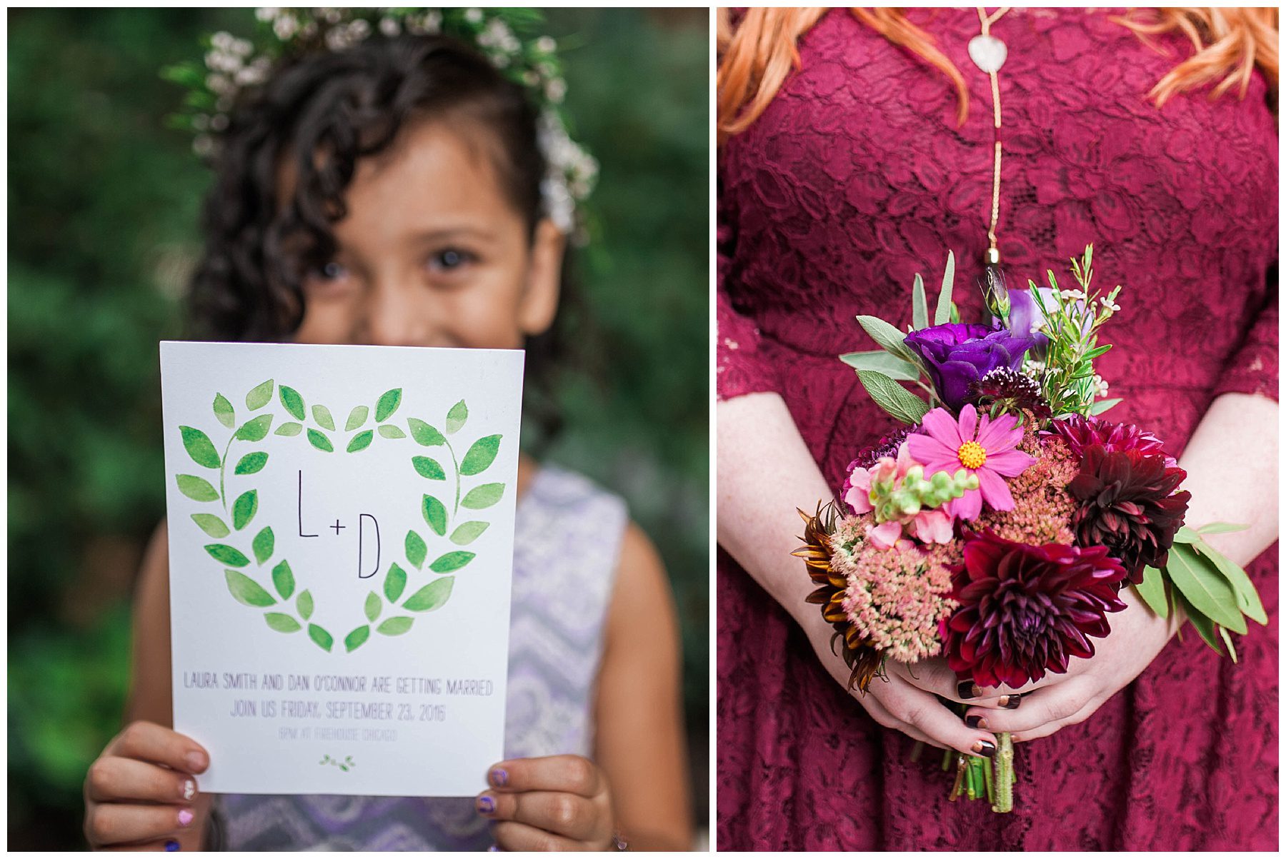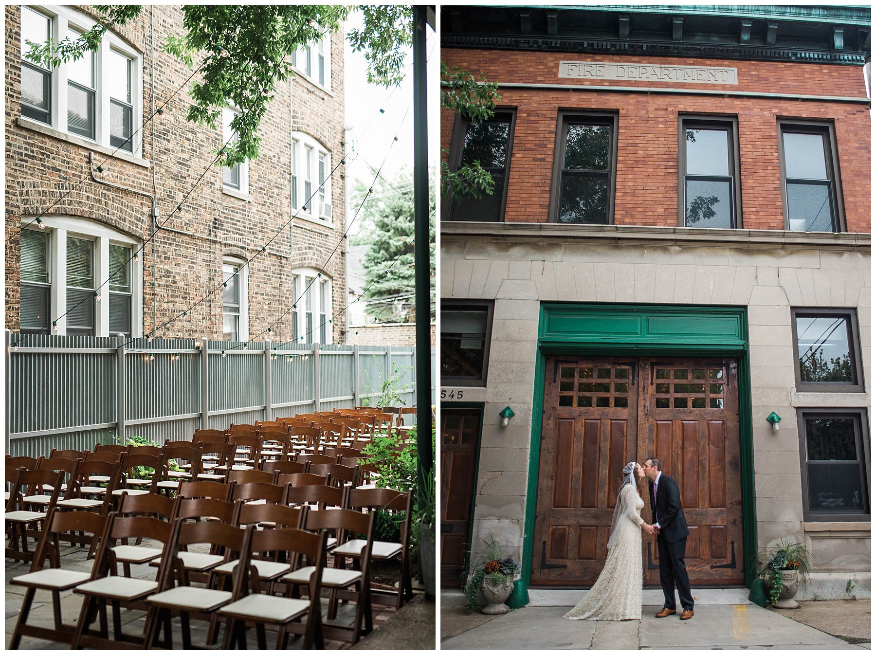 Because the wedding held lots of out of town guests, Laura and Dan wanted a smaller outdoor venue where they could mingle with friends. They found the Firehouse in the Edgewater neighborhood to be the perfect mix of historic architecture along with a boho vintage flair. Vines trellised around the building which was centered in the middle of a beautiful Chicago neighborhood that their wedding party perused together for photos before the ceremony. After their beautiful outdoor ceremony at dusk, guests were given appetizers from a local Chicago restaurant, which consisted of their favorite foods, Indian, Mexican, and German. Signature drinks with whisky, Dan’s favorite, were at the bar. Laura’s bouquets and flower crowns were from local flower gardens and her grandmother had brought in Zinnias from her Iowa farm that Katie from Art Farm Blooms incorporated into the organic bouquets and table arrangements. The bridesmaids chose their own dresses from Zara and All Saints, to compliment Laura’s Amanda Archer Romance gown made by Mignoette Bridal and her John Fluevog shoes. The couple was introduced as Laura slid down the fire pole and took off her veil to a floral crown of her own and danced to the tunes pulled together by Toast and Jams.