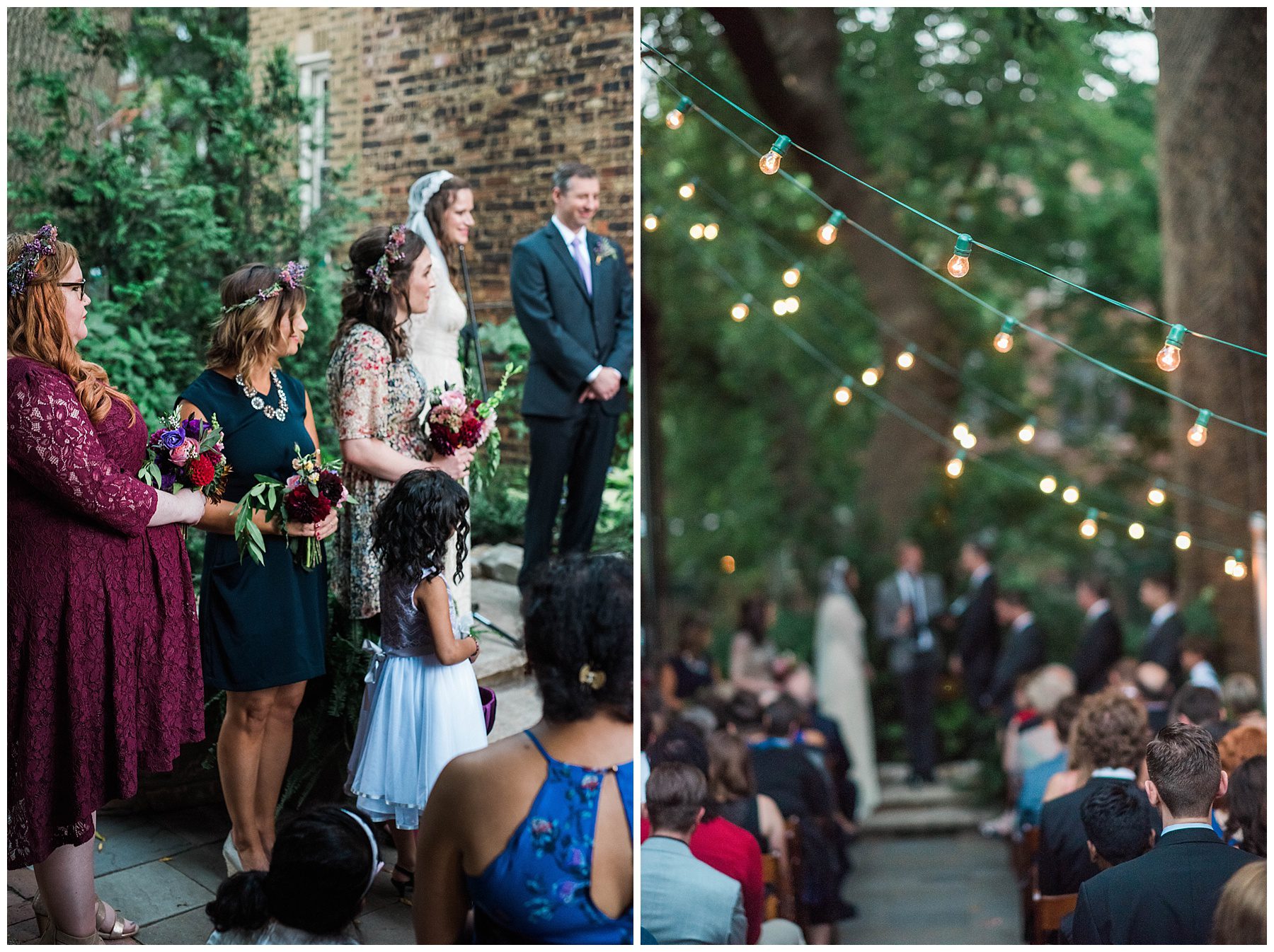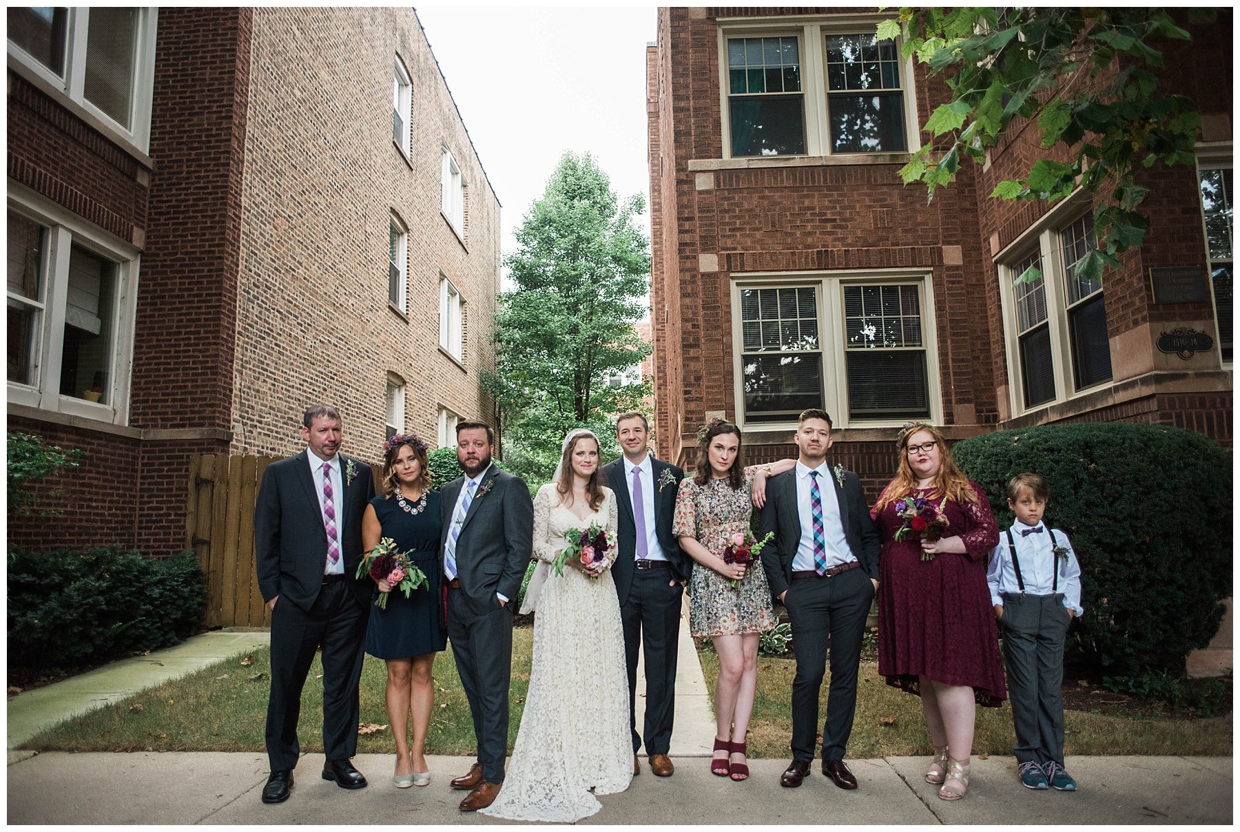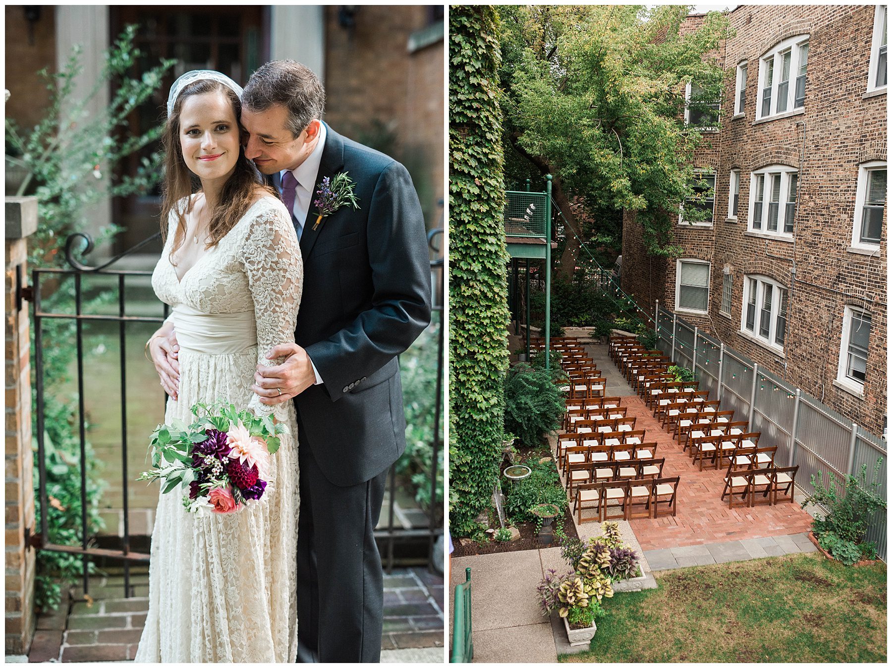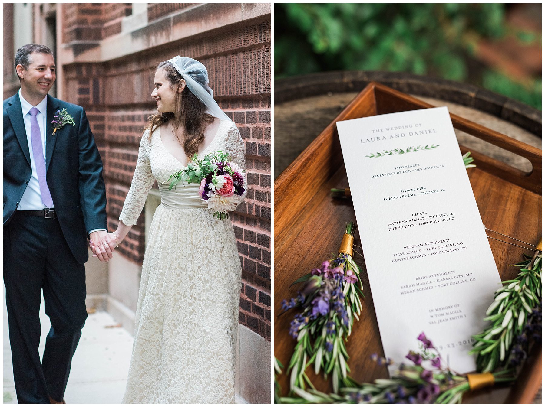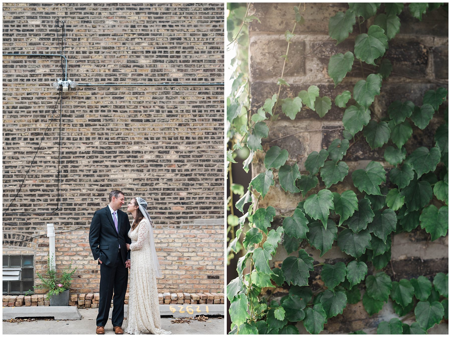 Because the wedding held lots of out of town guests, Laura and Dan wanted a smaller outdoor venue where they could mingle with friends. They found the Firehouse in the Edgewater neighborhood to be the perfect mix of historic architecture along with a boho vintage flair. Vines trellised around the building which was centered in the middle of a beautiful Chicago neighborhood that their wedding party perused together for photos before the ceremony. After their beautiful outdoor ceremony at dusk, guests were given appetizers from a local Chicago restaurant, which consisted of their favorite foods, Indian, Mexican, and German. Signature drinks with whisky, Dan’s favorite, were at the bar. Laura’s bouquets and flower crowns were from local flower gardens and her grandmother had brought in Zinnias from her Iowa farm that Katie from Art Farm Blooms incorporated into the organic bouquets and table arrangements. The bridesmaids chose their own dresses from Zara and All Saints, to compliment Laura’s Amanda Archer Romance gown made by Mignoette Bridal and her John Fluevog shoes. The couple was introduced as Laura slid down the fire pole and took off her veil to a floral crown of her own and danced to the tunes pulled together by Toast and Jams.