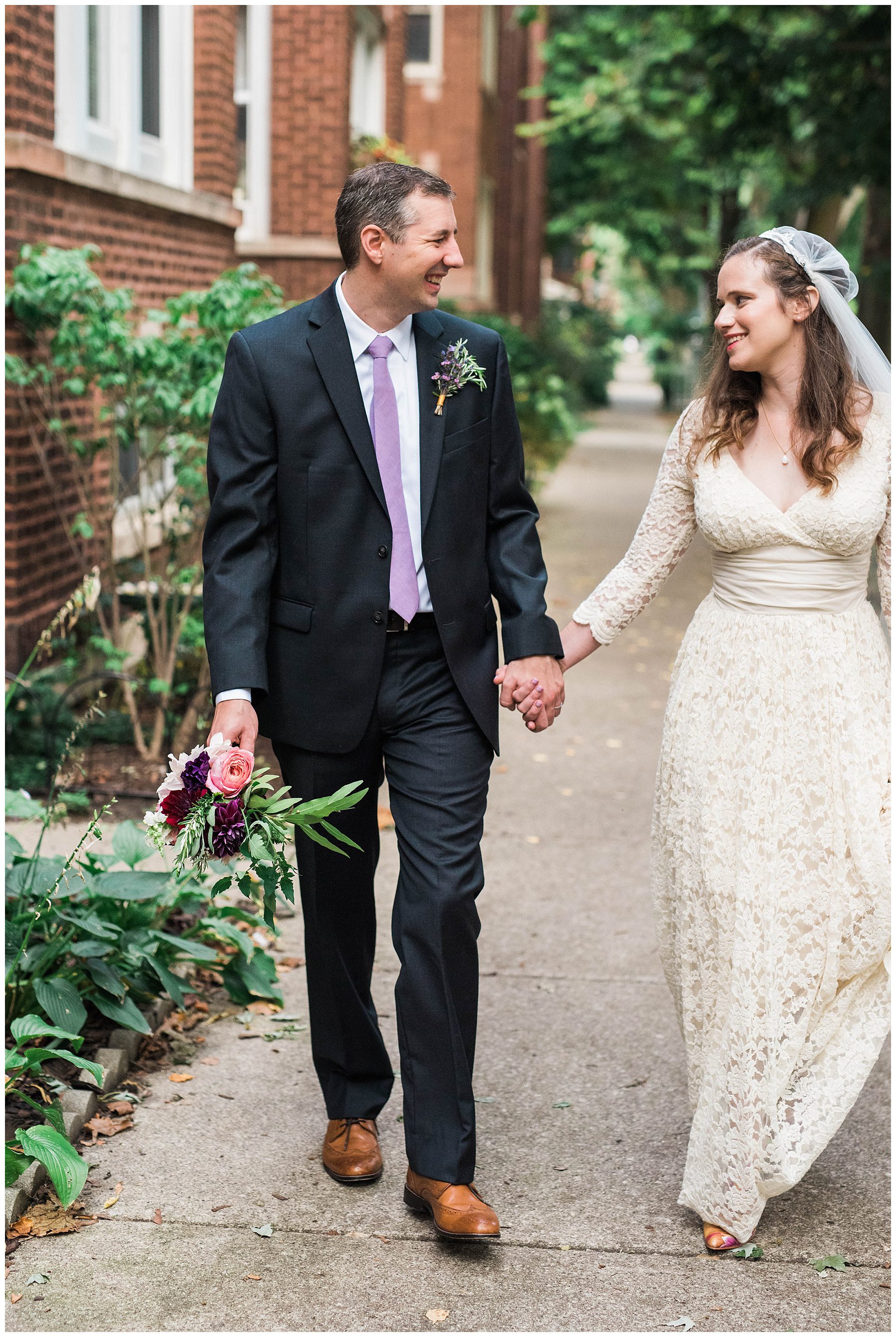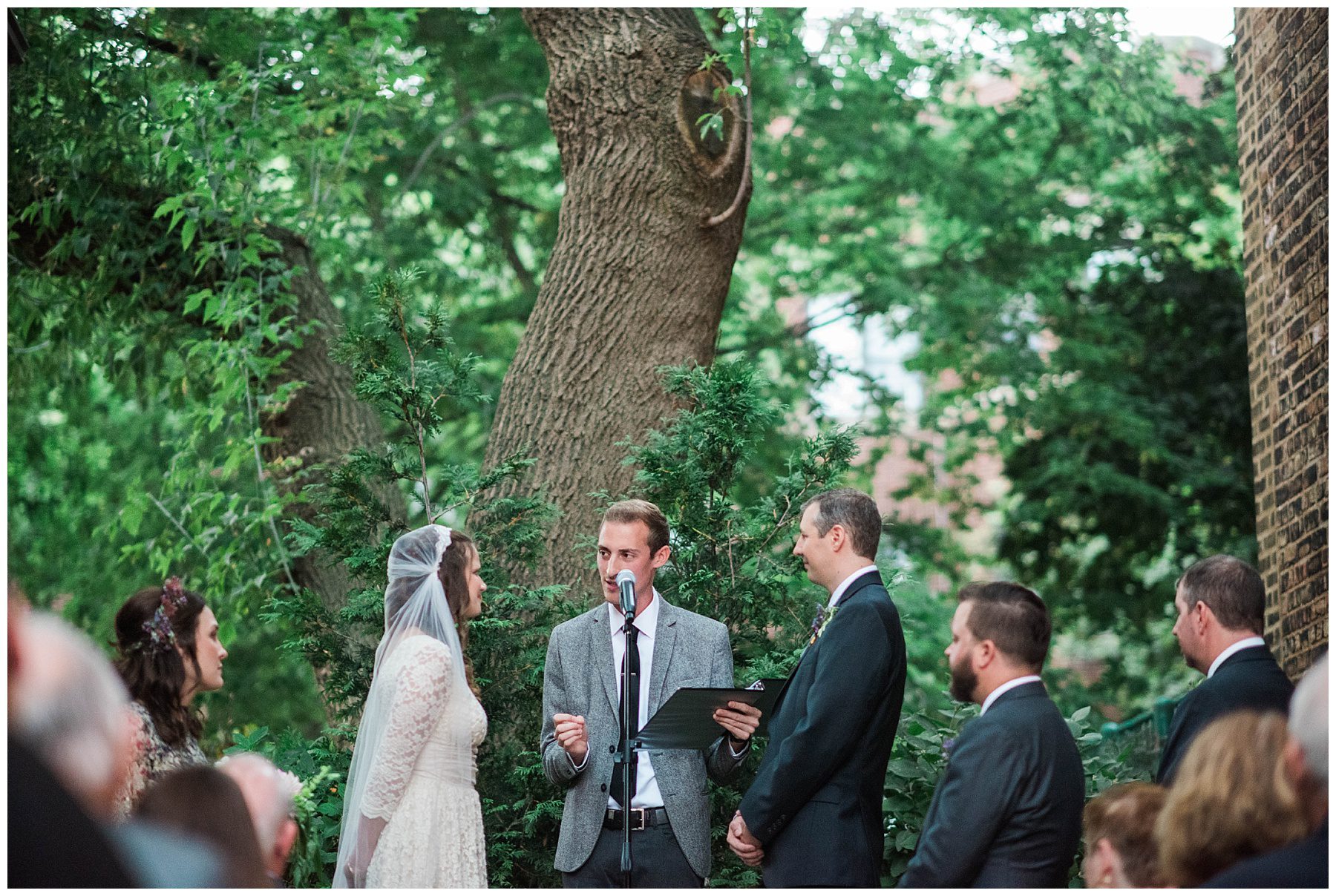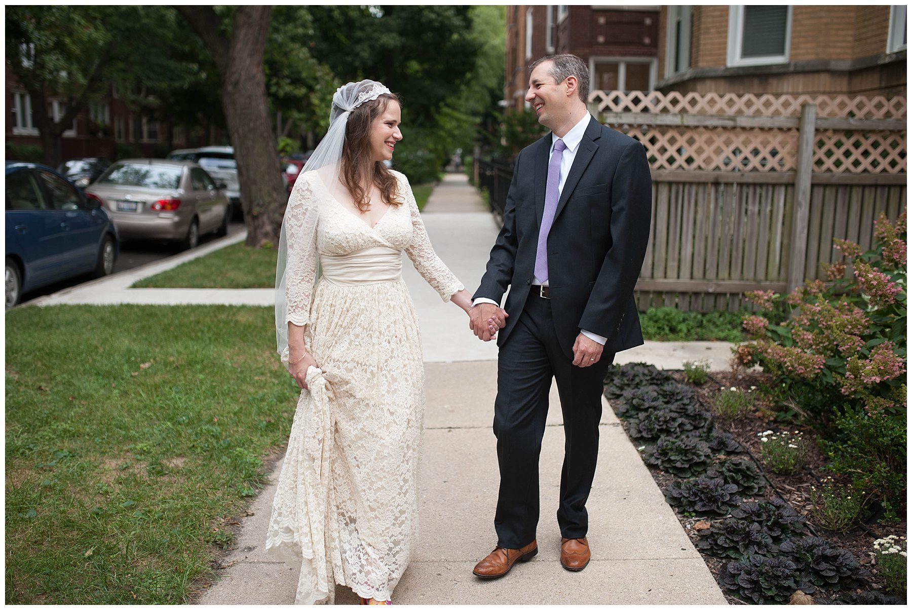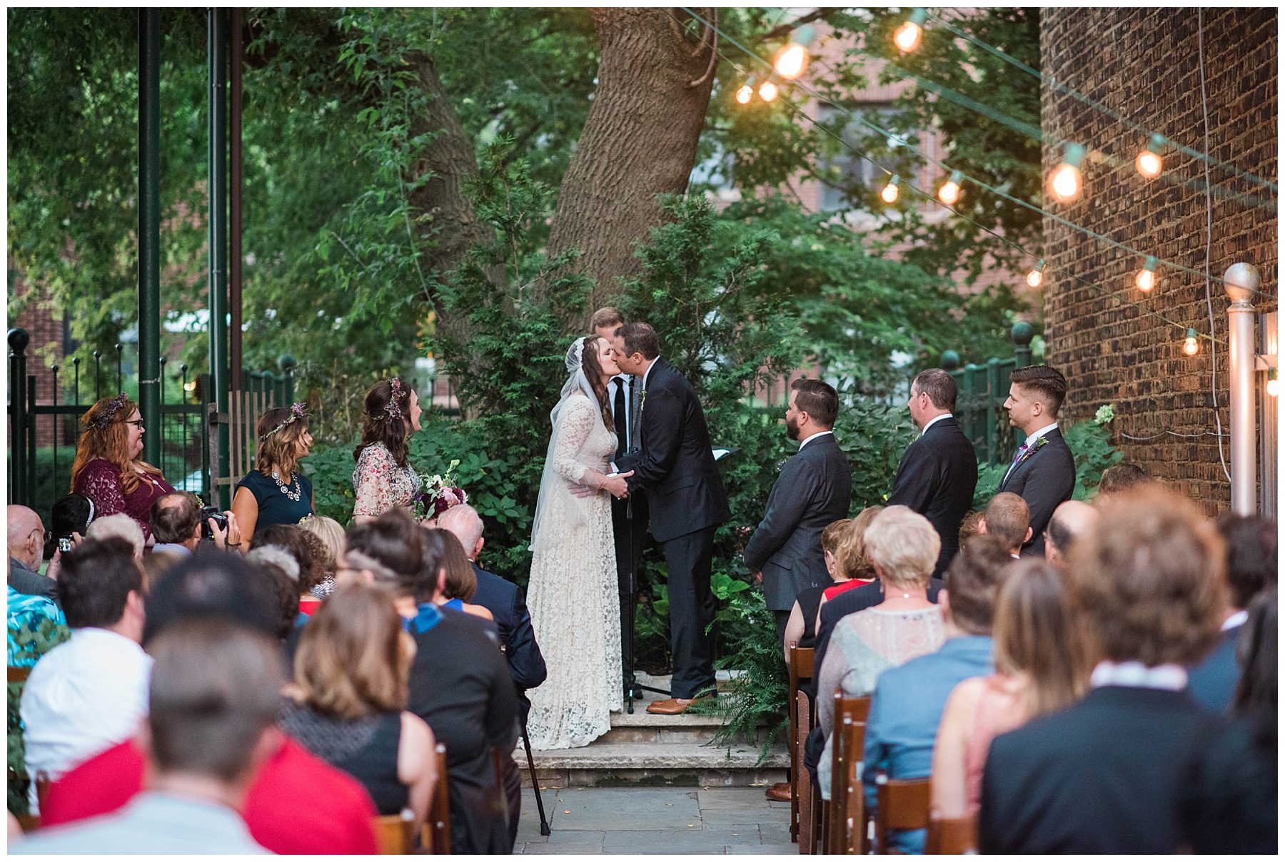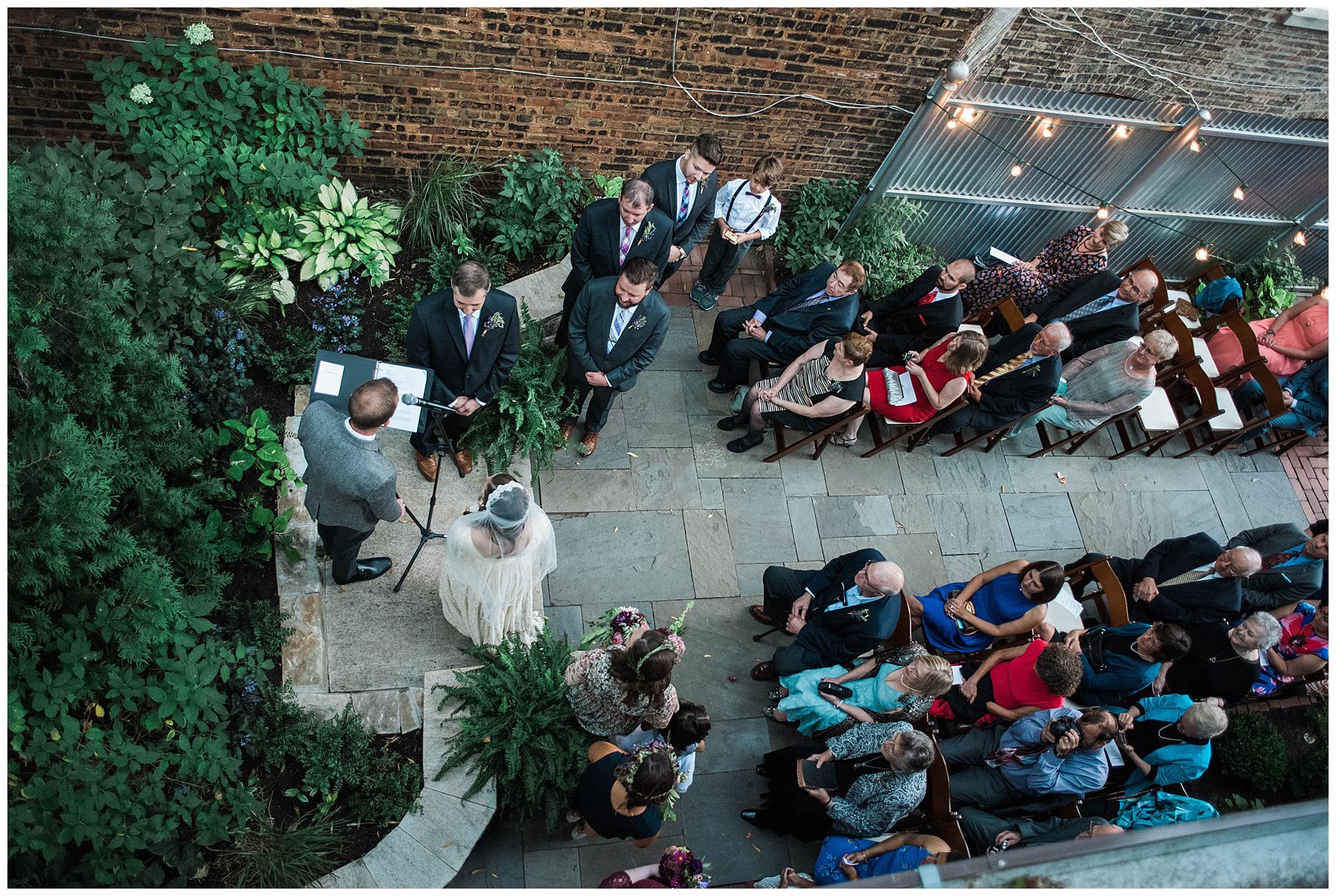 Because the wedding held lots of out of town guests, Laura and Dan wanted a smaller outdoor venue where they could mingle with friends. They found the Firehouse in the Edgewater neighborhood to be the perfect mix of historic architecture along with a boho vintage flair. Vines trellised around the building which was centered in the middle of a beautiful Chicago neighborhood that their wedding party perused together for photos before the ceremony. After their beautiful outdoor ceremony at dusk, guests were given appetizers from a local Chicago restaurant, which consisted of their favorite foods, Indian, Mexican, and German. Signature drinks with whisky, Dan’s favorite, were at the bar. Laura’s bouquets and flower crowns were from local flower gardens and her grandmother had brought in Zinnias from her Iowa farm that Katie from Art Farm Blooms incorporated into the organic bouquets and table arrangements. The bridesmaids chose their own dresses from Zara and All Saints, to compliment Laura’s Amanda Archer Romance gown made by Mignoette Bridal and her John Fluevog shoes. The couple was introduced as Laura slid down the fire pole and took off her veil to a floral crown of her own and danced to the tunes pulled together by Toast and Jams.