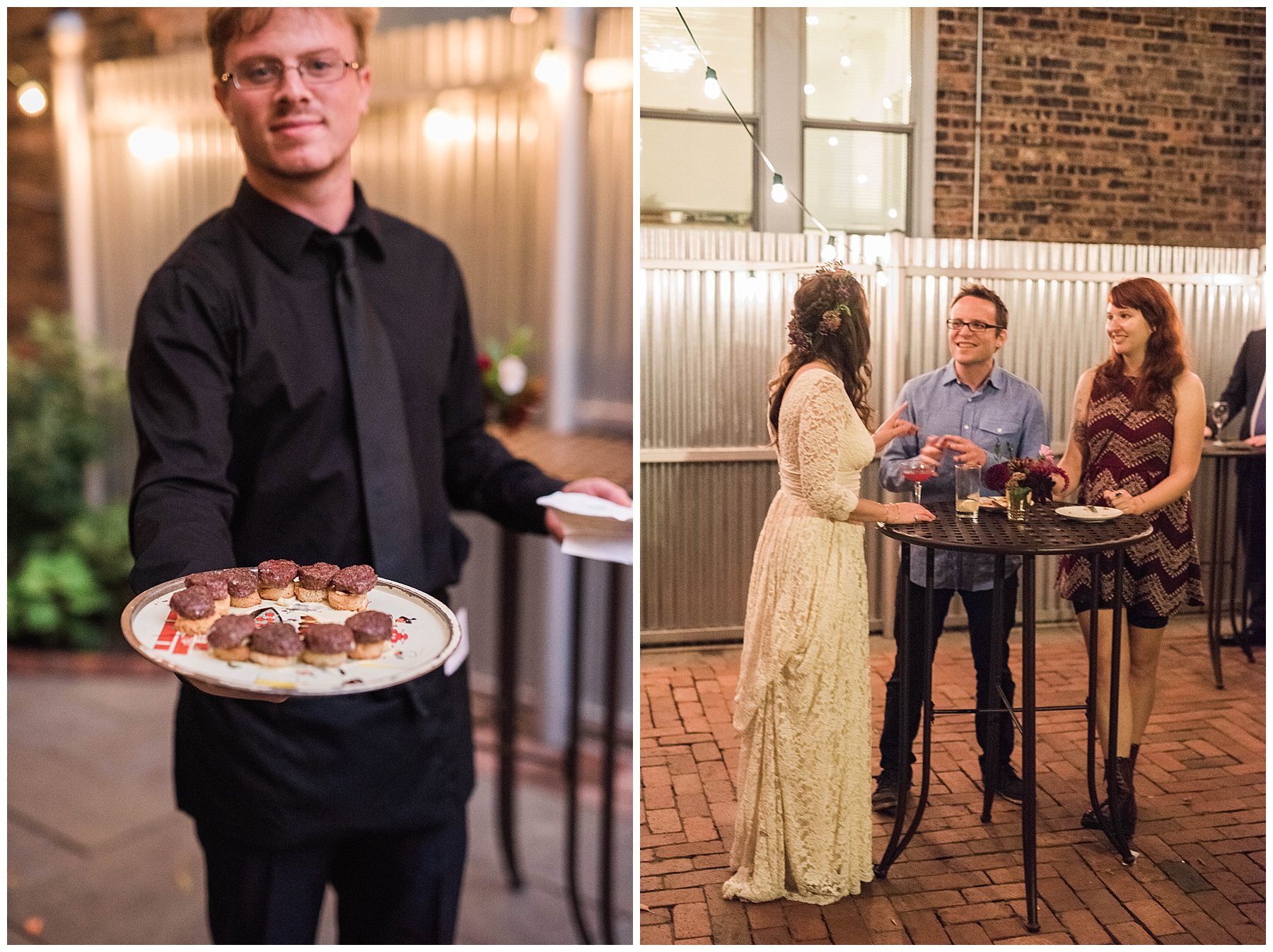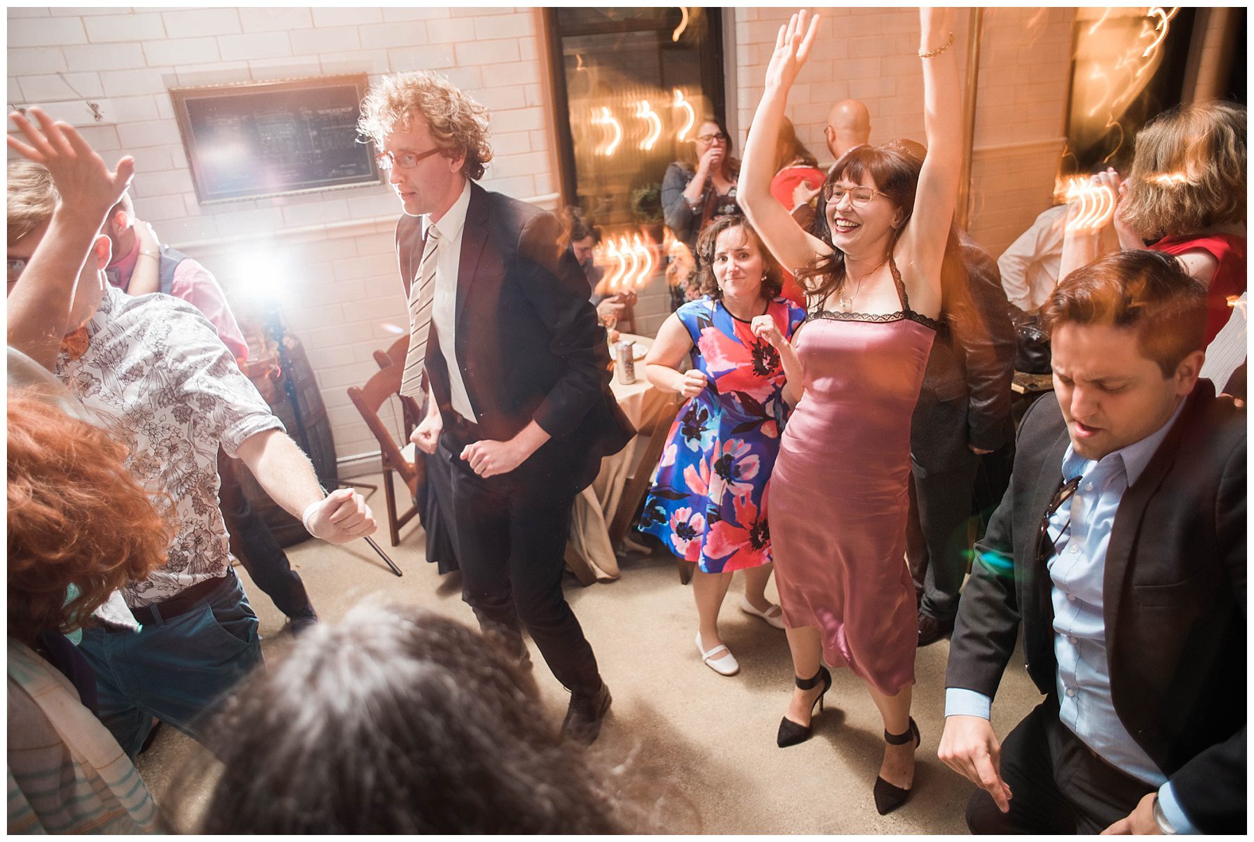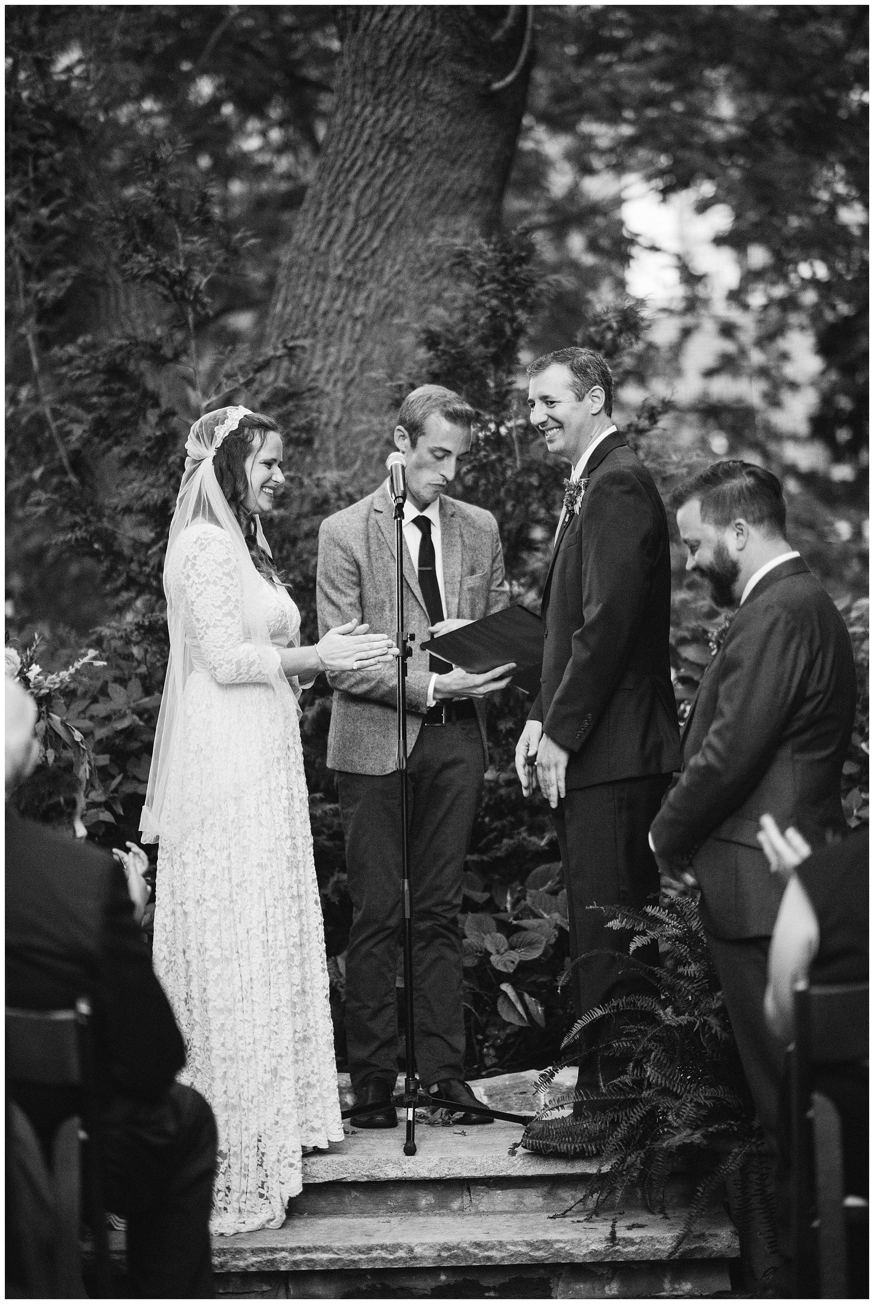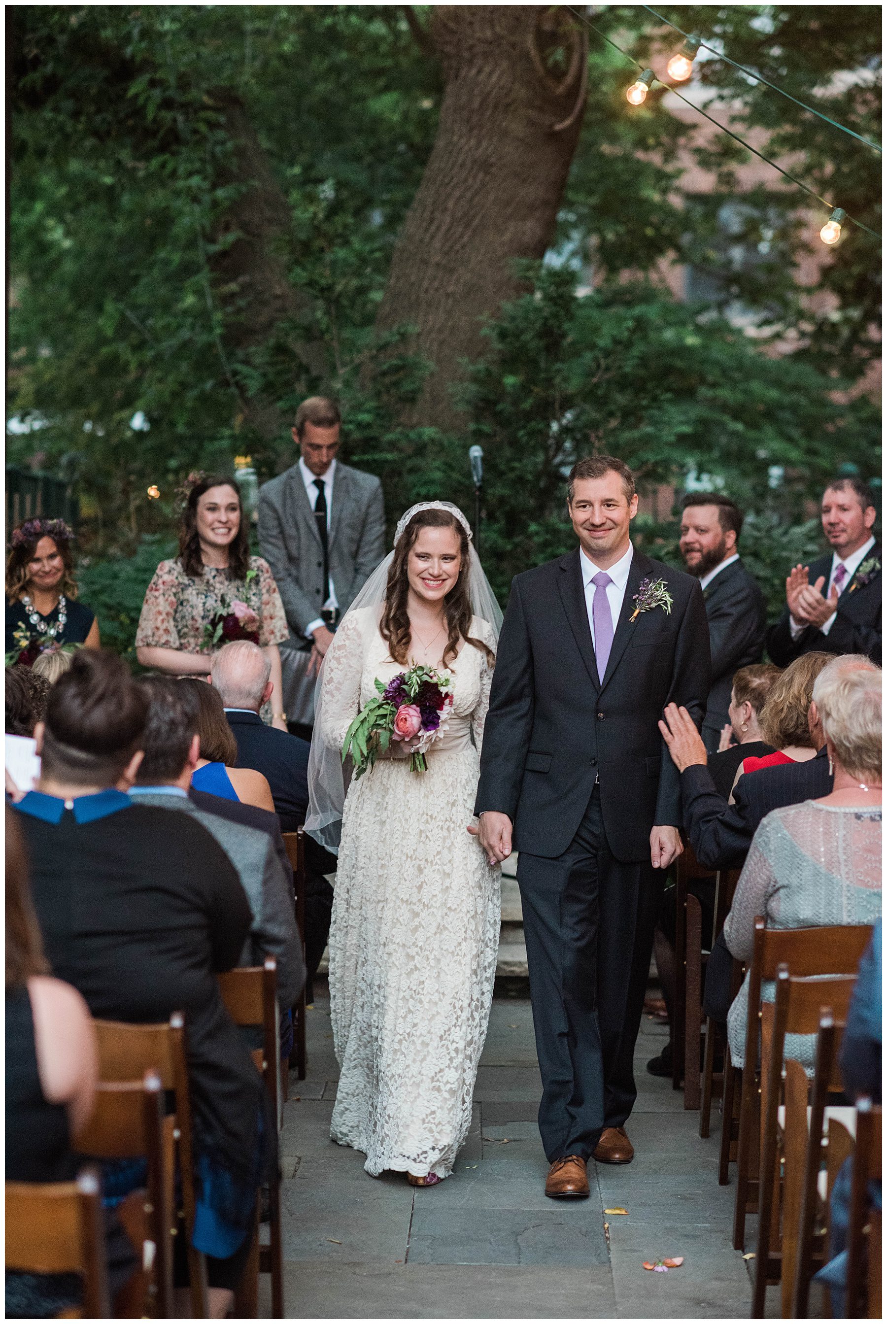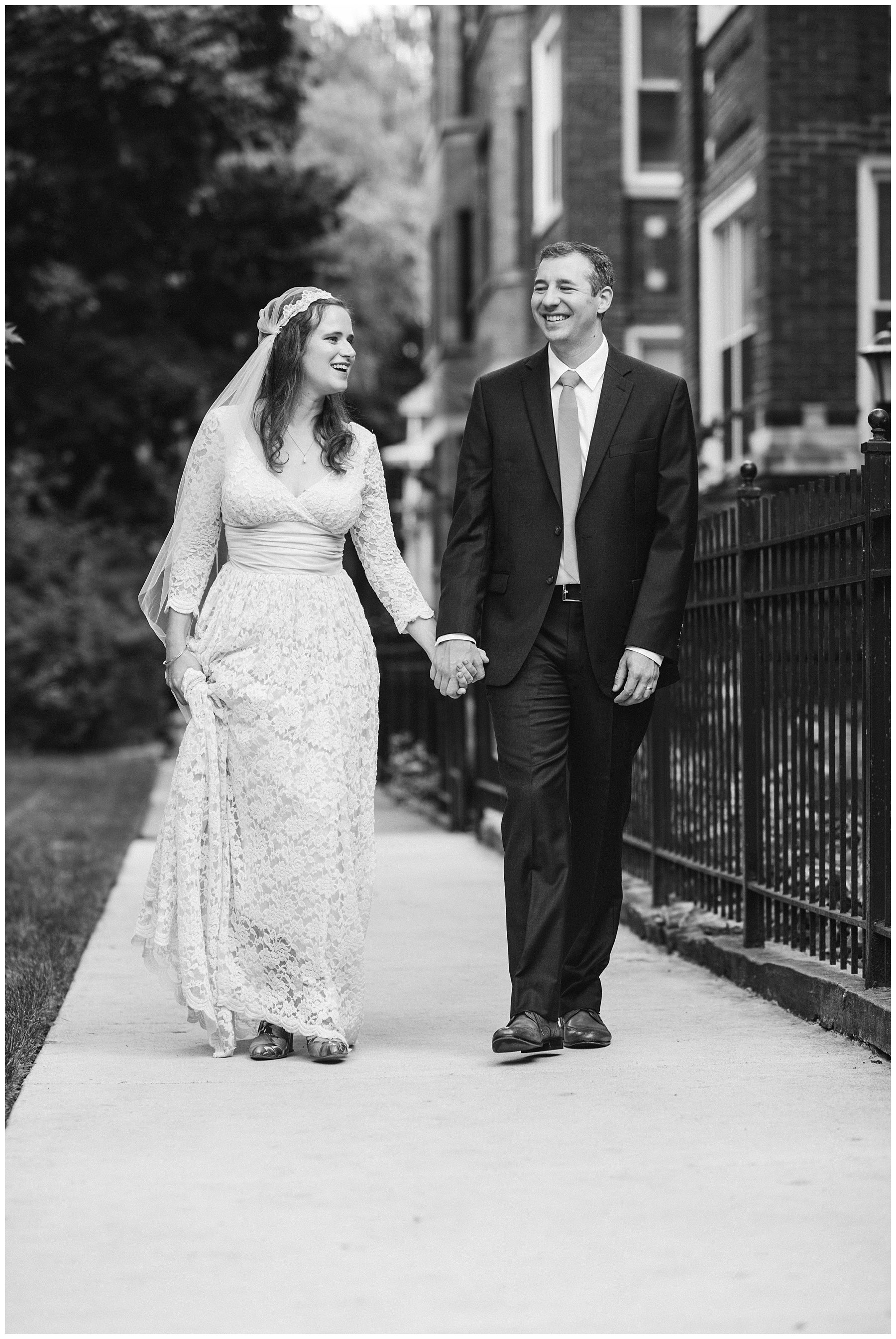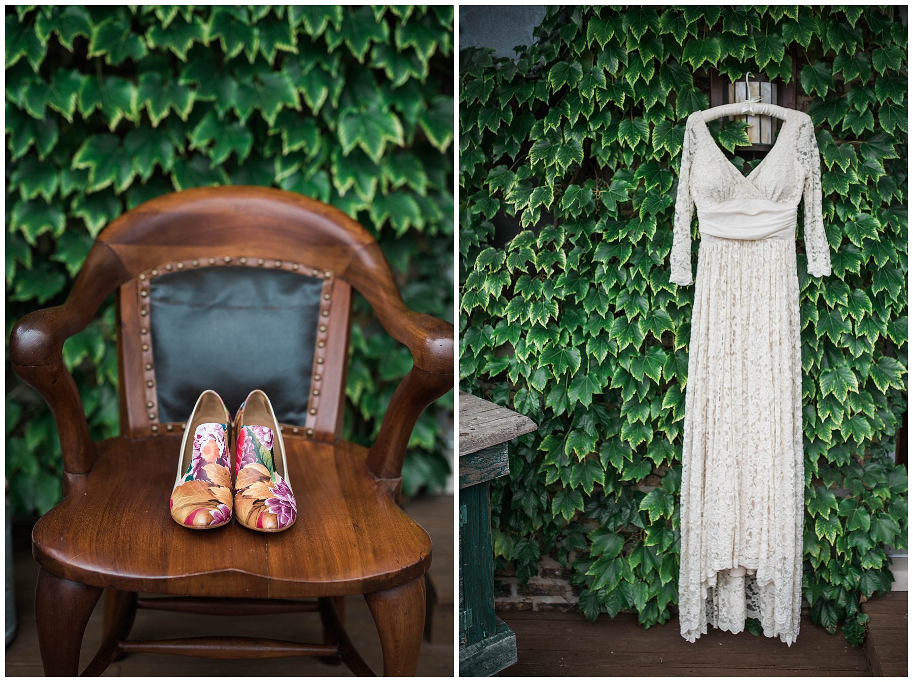 Because the wedding held lots of out of town guests, Laura and Dan wanted a smaller outdoor venue where they could mingle with friends. They found the Firehouse in the Edgewater neighborhood to be the perfect mix of historic architecture along with a boho vintage flair. Vines trellised around the building which was centered in the middle of a beautiful Chicago neighborhood that their wedding party perused together for photos before the ceremony. After their beautiful outdoor ceremony at dusk, guests were given appetizers from a local Chicago restaurant, which consisted of their favorite foods, Indian, Mexican, and German. Signature drinks with whisky, Dan’s favorite, were at the bar. Laura’s bouquets and flower crowns were from local flower gardens and her grandmother had brought in Zinnias from her Iowa farm that Katie from Art Farm Blooms incorporated into the organic bouquets and table arrangements. The bridesmaids chose their own dresses from Zara and All Saints, to compliment Laura’s Amanda Archer Romance gown made by Mignoette Bridal and her John Fluevog shoes. The couple was introduced as Laura slid down the fire pole and took off her veil to a floral crown of her own and danced to the tunes pulled together by Toast and Jams.