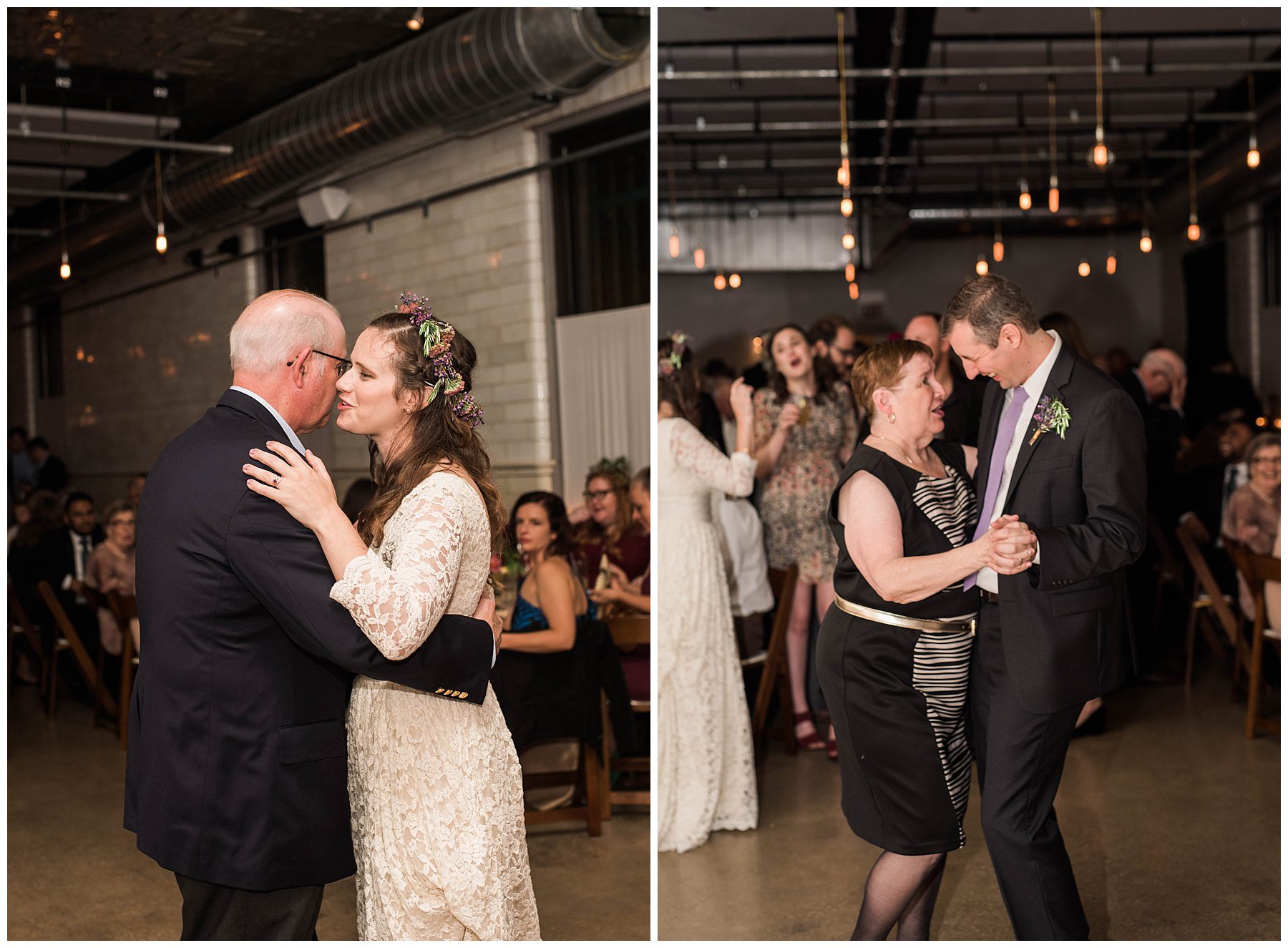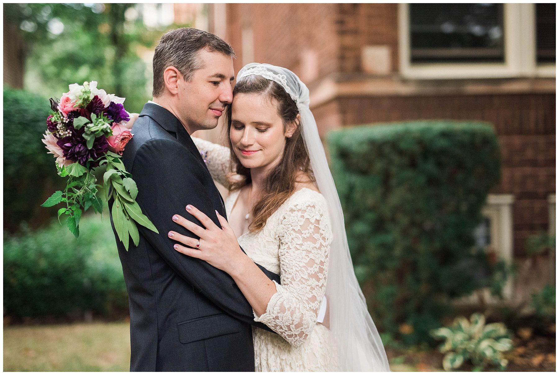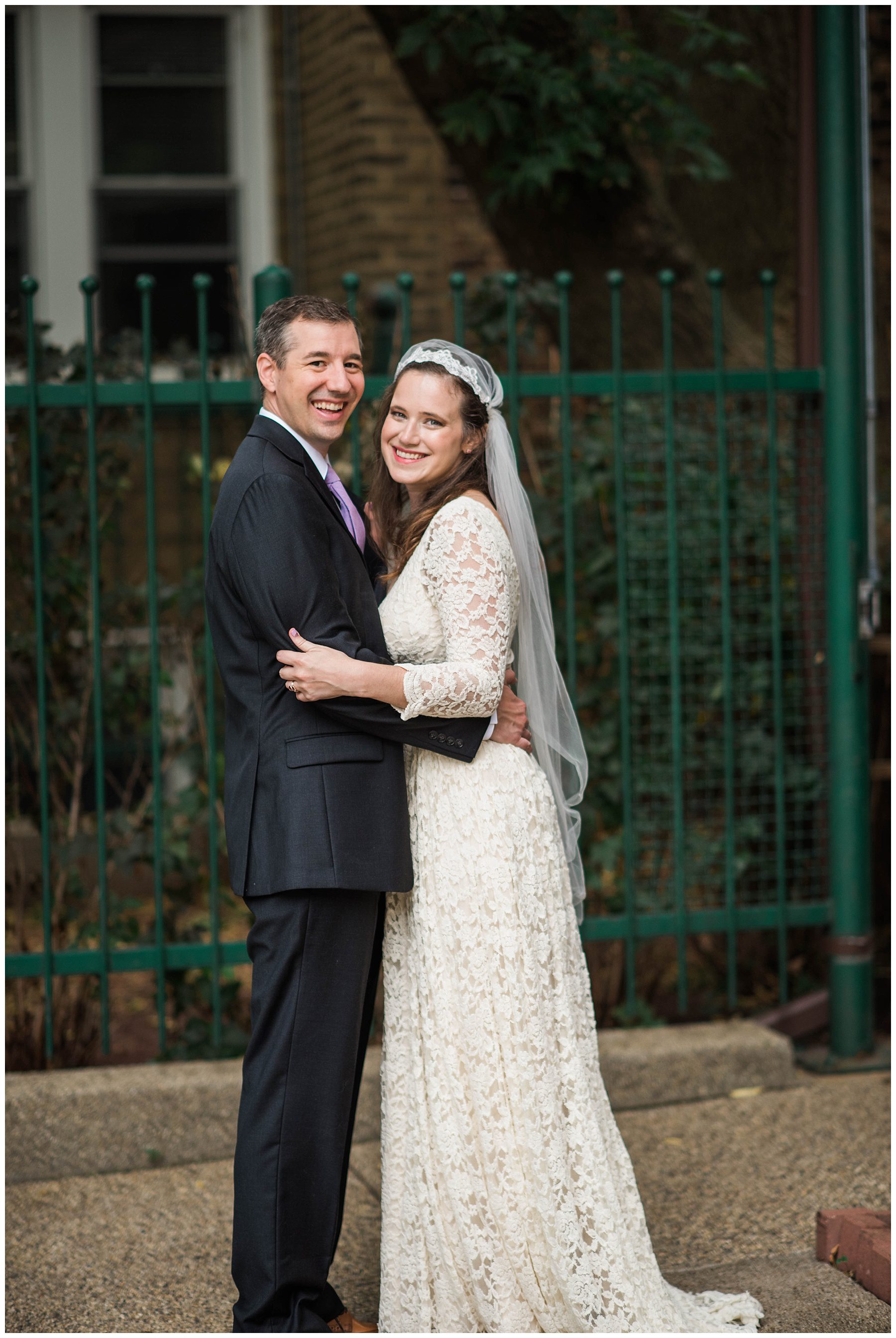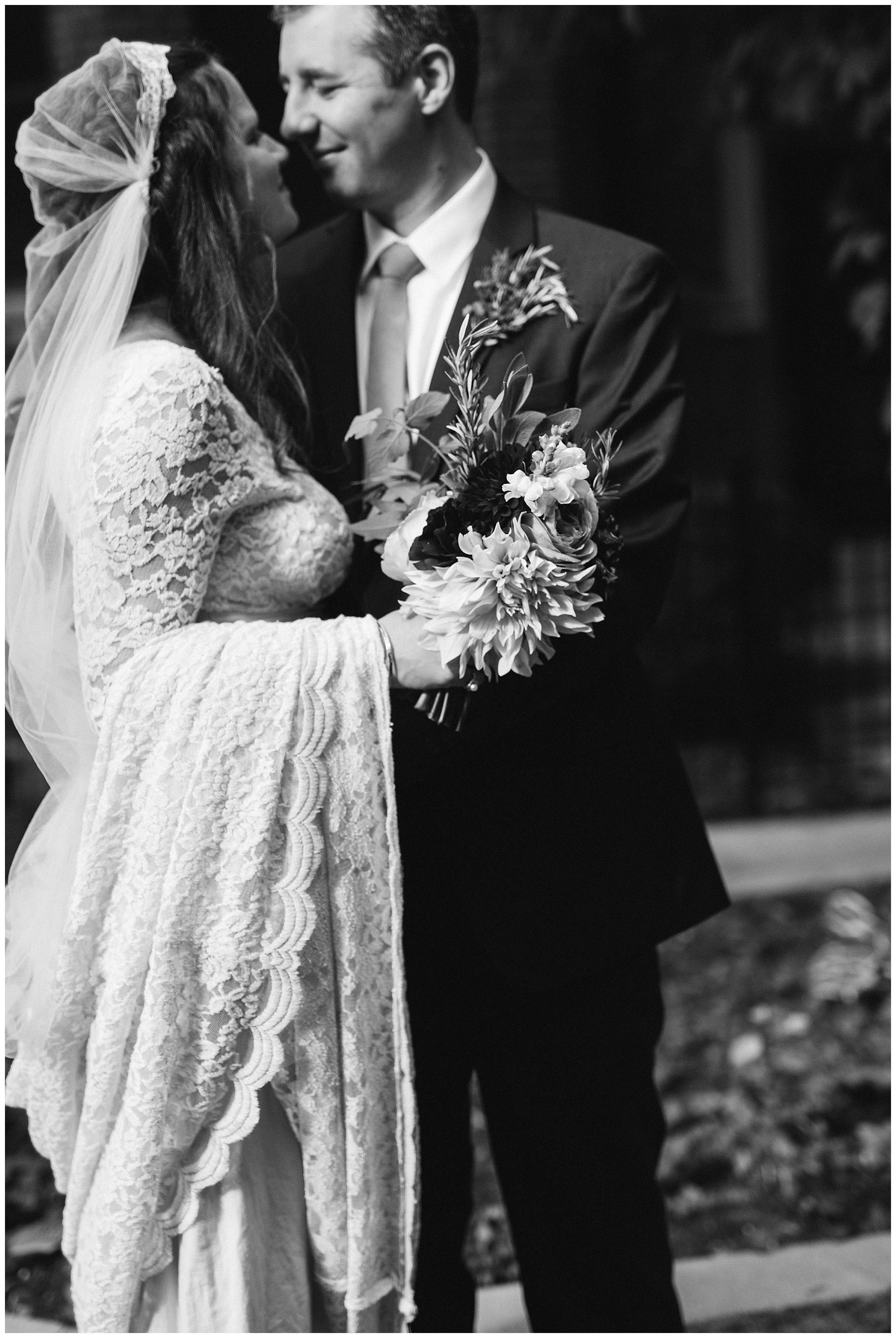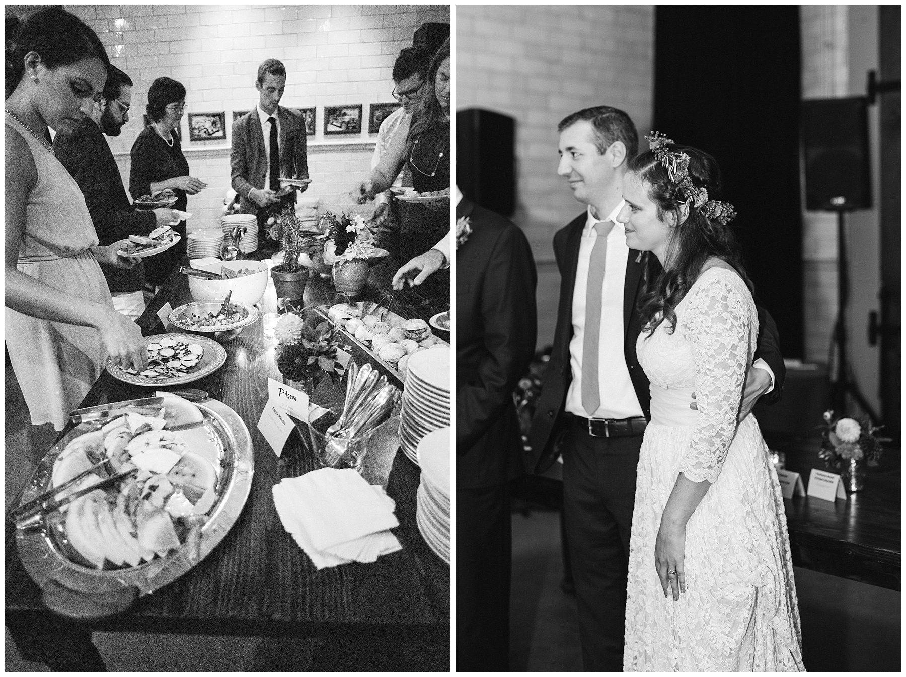 Because the wedding held lots of out of town guests, Laura and Dan wanted a smaller outdoor venue where they could mingle with friends. They found the Firehouse in the Edgewater neighborhood to be the perfect mix of historic architecture along with a boho vintage flair. Vines trellised around the building which was centered in the middle of a beautiful Chicago neighborhood that their wedding party perused together for photos before the ceremony. After their beautiful outdoor ceremony at dusk, guests were given appetizers from a local Chicago restaurant, which consisted of their favorite foods, Indian, Mexican, and German. Signature drinks with whisky, Dan’s favorite, were at the bar. Laura’s bouquets and flower crowns were from local flower gardens and her grandmother had brought in Zinnias from her Iowa farm that Katie from Art Farm Blooms incorporated into the organic bouquets and table arrangements. The bridesmaids chose their own dresses from Zara and All Saints, to compliment Laura’s Amanda Archer Romance gown made by Mignoette Bridal and her John Fluevog shoes. The couple was introduced as Laura slid down the fire pole and took off her veil to a floral crown of her own and danced to the tunes pulled together by Toast and Jams.