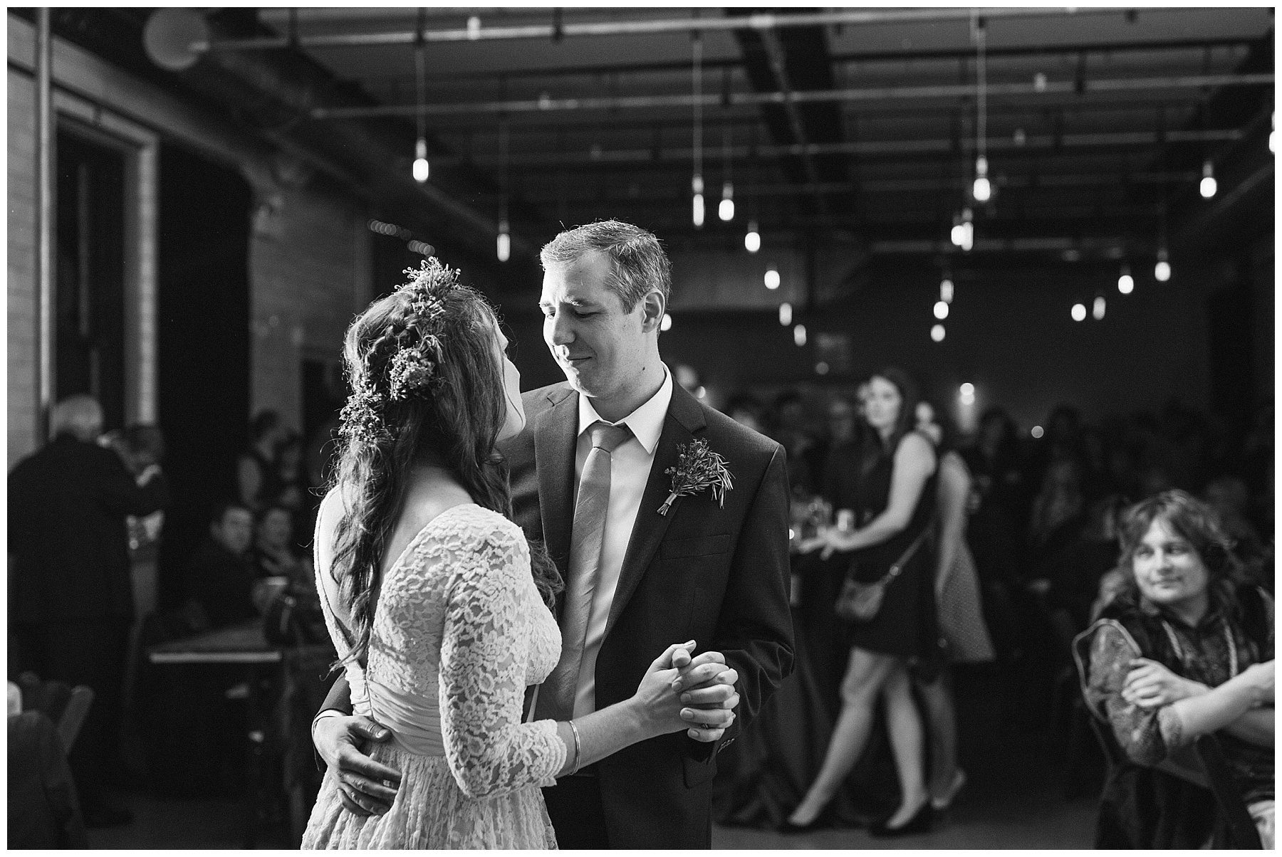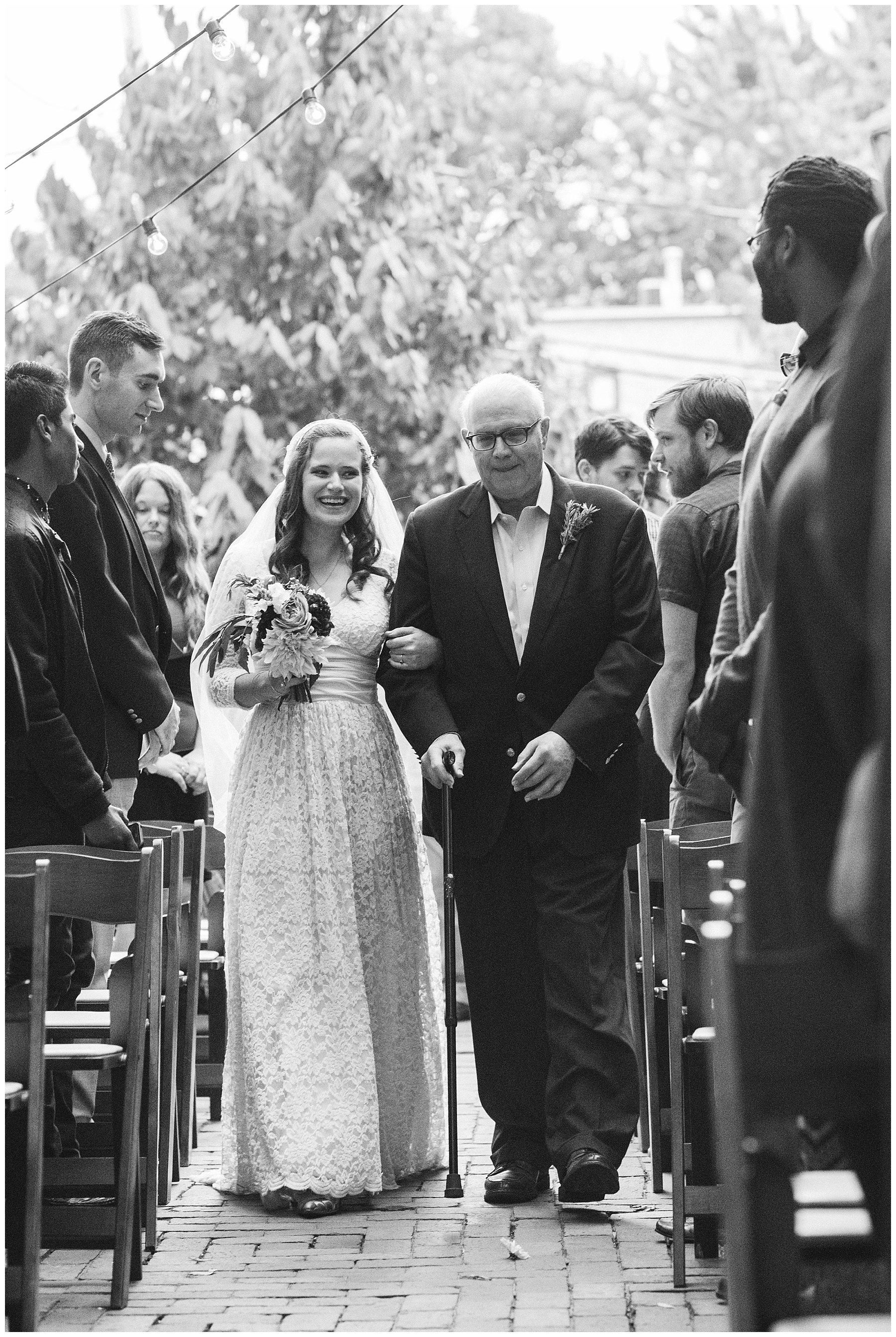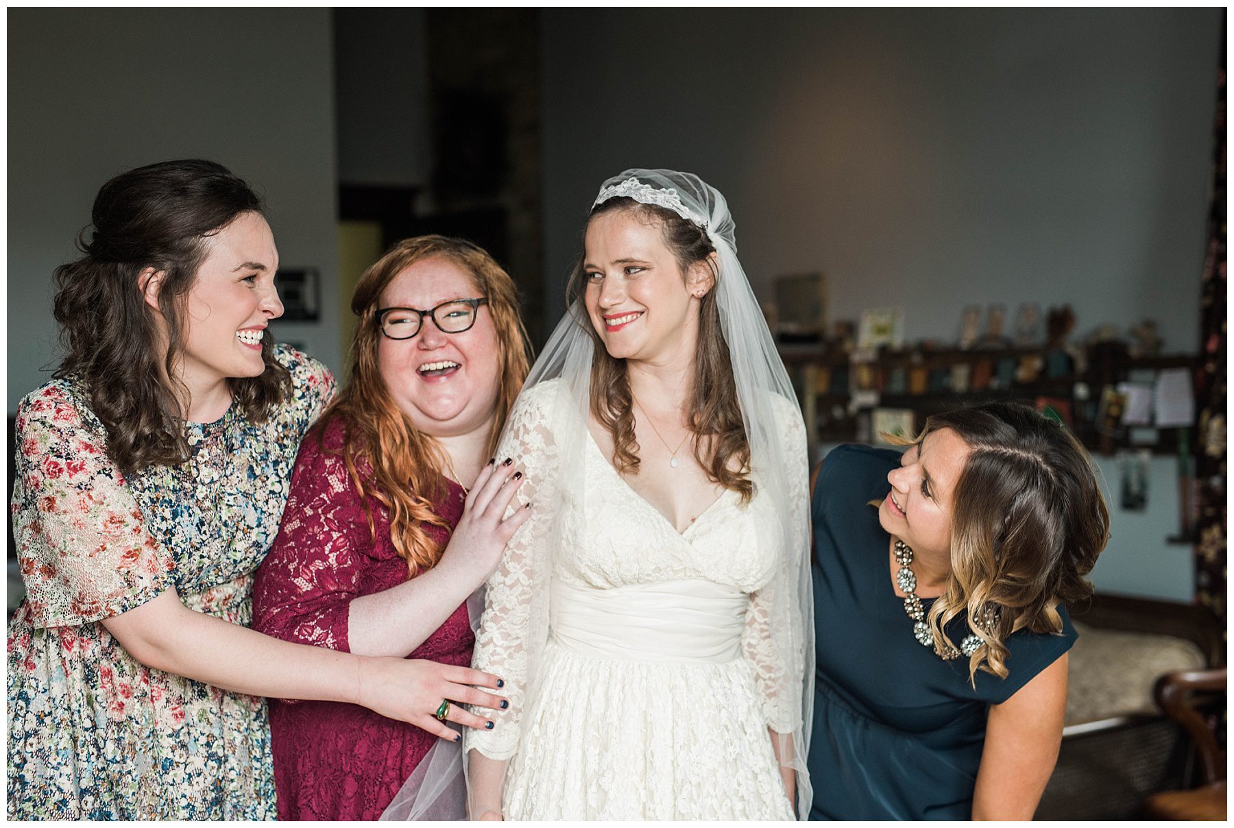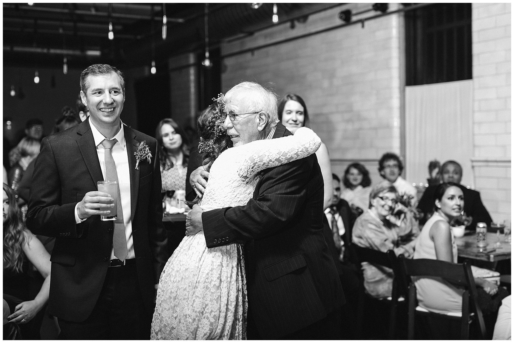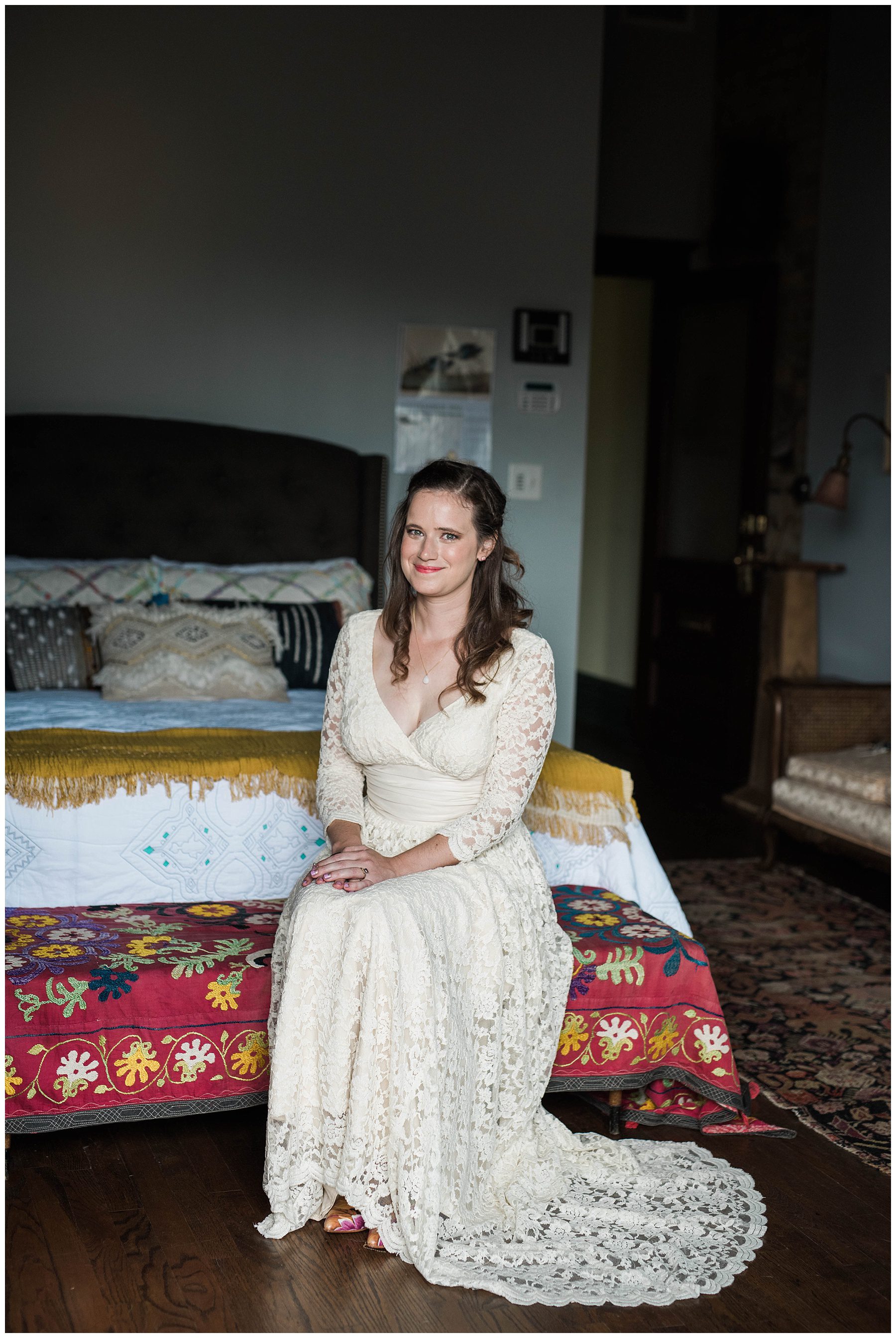 Because the wedding held lots of out of town guests, Laura and Dan wanted a smaller outdoor venue where they could mingle with friends. They found the Firehouse in the Edgewater neighborhood to be the perfect mix of historic architecture along with a boho vintage flair. Vines trellised around the building which was centered in the middle of a beautiful Chicago neighborhood that their wedding party perused together for photos before the ceremony. After their beautiful outdoor ceremony at dusk, guests were given appetizers from a local Chicago restaurant, which consisted of their favorite foods, Indian, Mexican, and German. Signature drinks with whisky, Dan’s favorite, were at the bar. Laura’s bouquets and flower crowns were from local flower gardens and her grandmother had brought in Zinnias from her Iowa farm that Katie from Art Farm Blooms incorporated into the organic bouquets and table arrangements. The bridesmaids chose their own dresses from Zara and All Saints, to compliment Laura’s Amanda Archer Romance gown made by Mignoette Bridal and her John Fluevog shoes. The couple was introduced as Laura slid down the fire pole and took off her veil to a floral crown of her own and danced to the tunes pulled together by Toast and Jams.
