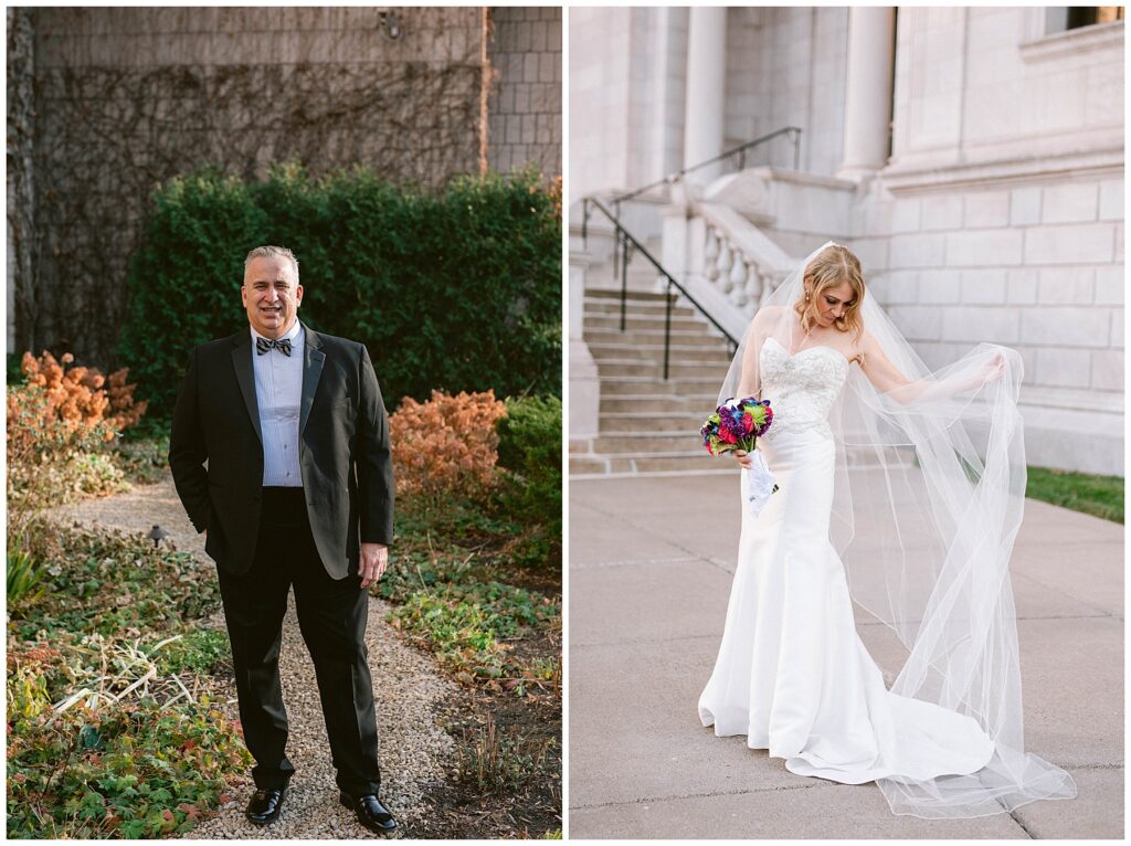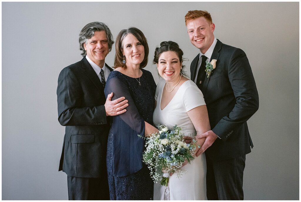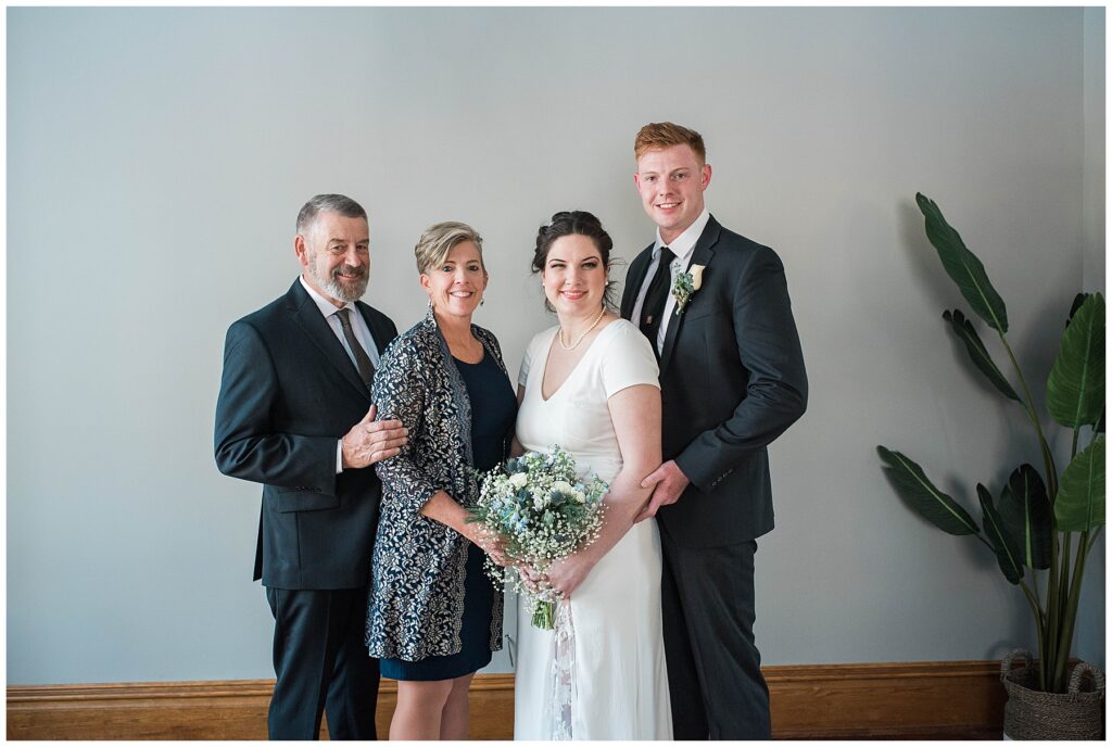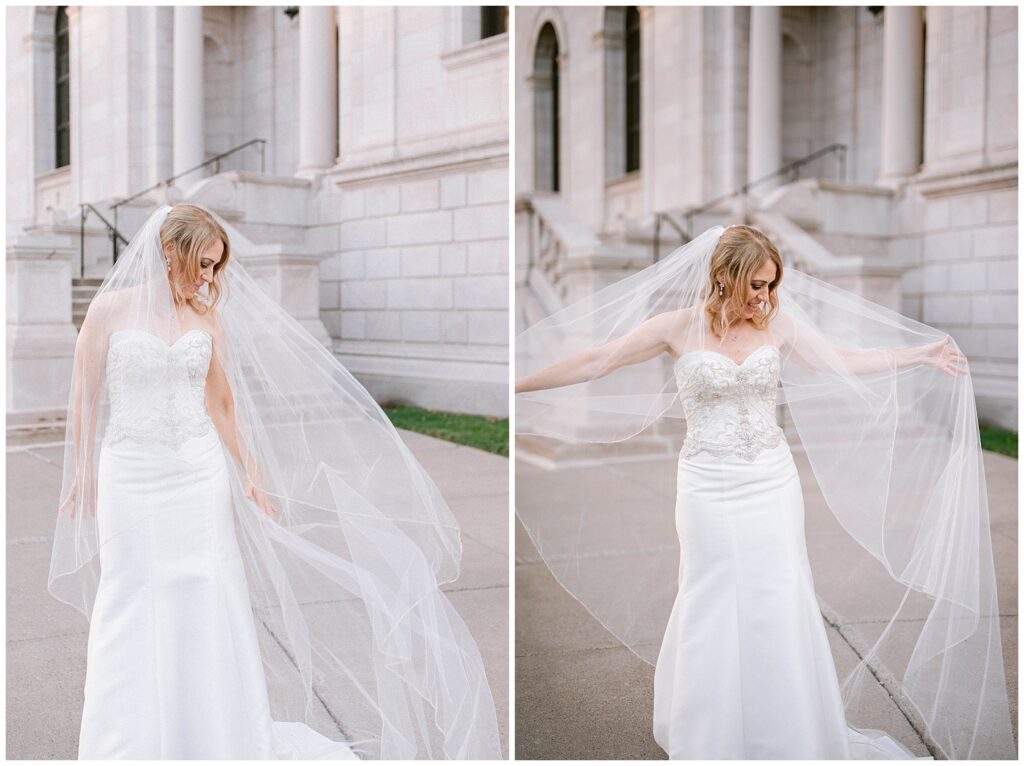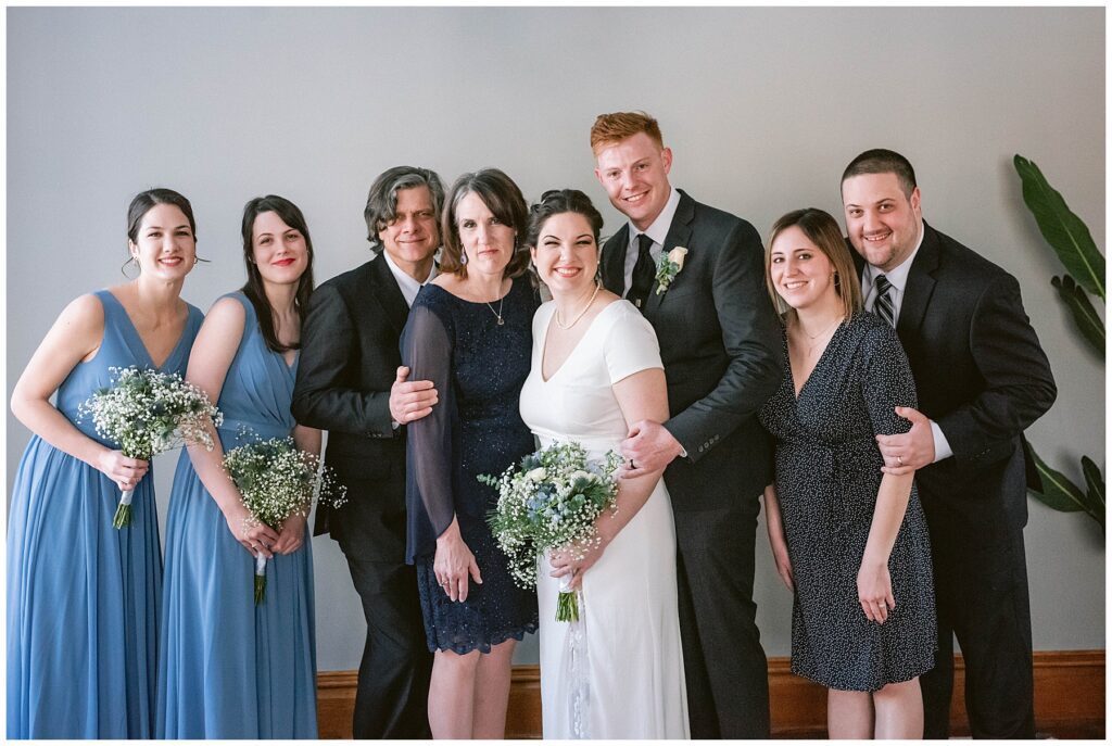 Back inside the Landmark Center, the couple and their wedding party explored the historic beauty of the building making sure to take photos in staircases and old courtrooms. From there, the family met the couple for family photos in the beautiful white entry way of the building.
