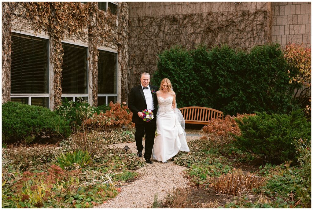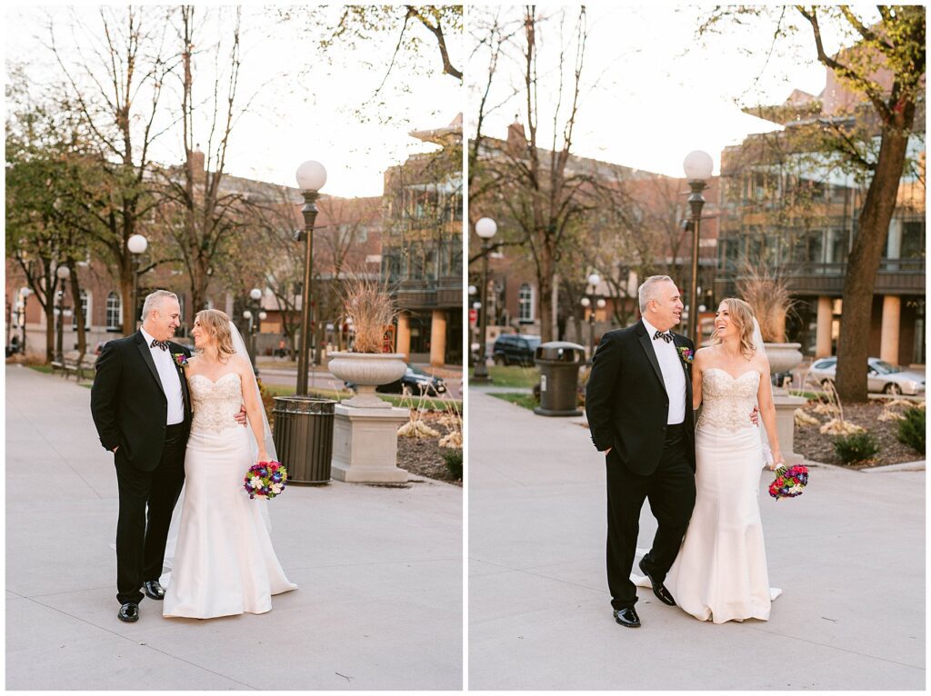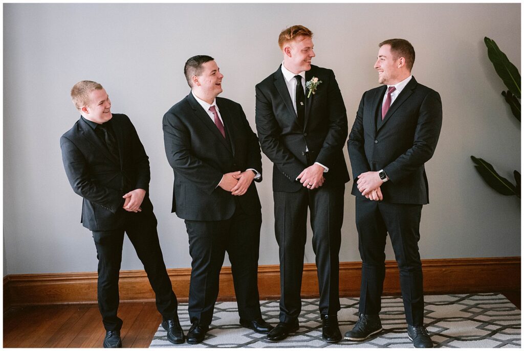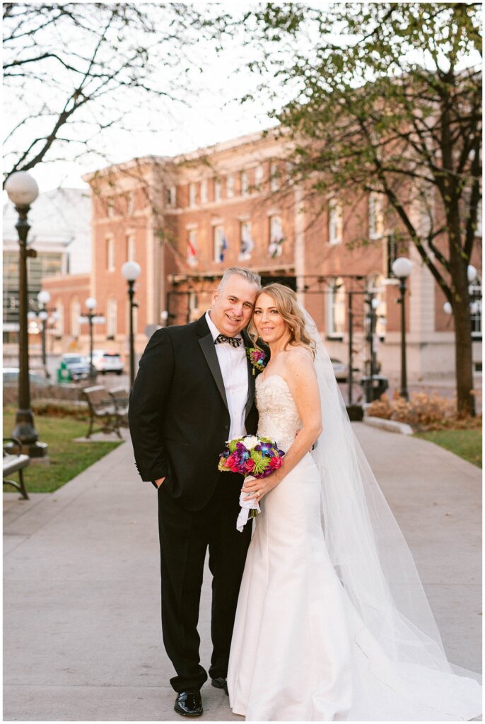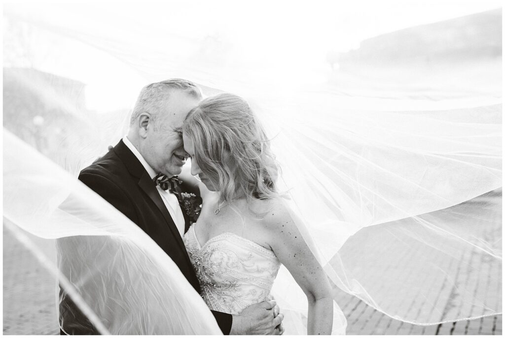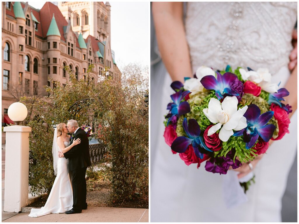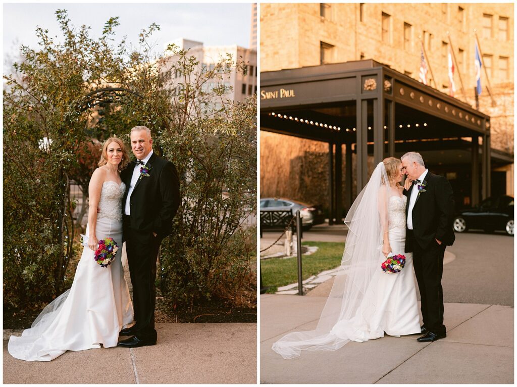 The grand staircase of the St. Paul Hotel served as the backdrop for Sophia and Christian’s unforgettable first look before heading outside. Accompanied by their wedding party, they ventured out to Rice Park for photos against the backdrop of the Landmark Center and the James J Hill Library. Decked in maroon dresses adorned with bouquets of baby’s breath, the bridesmaids radiated elegance, while the groomsmen, in classic black suits and bow ties from The Black Tux, exuded timeless charm. With the assistance of Laura Lonergan, Sophia’s white rose bridal bouquet became a masterpiece, adding a touch of ethereal charm to her ensemble.