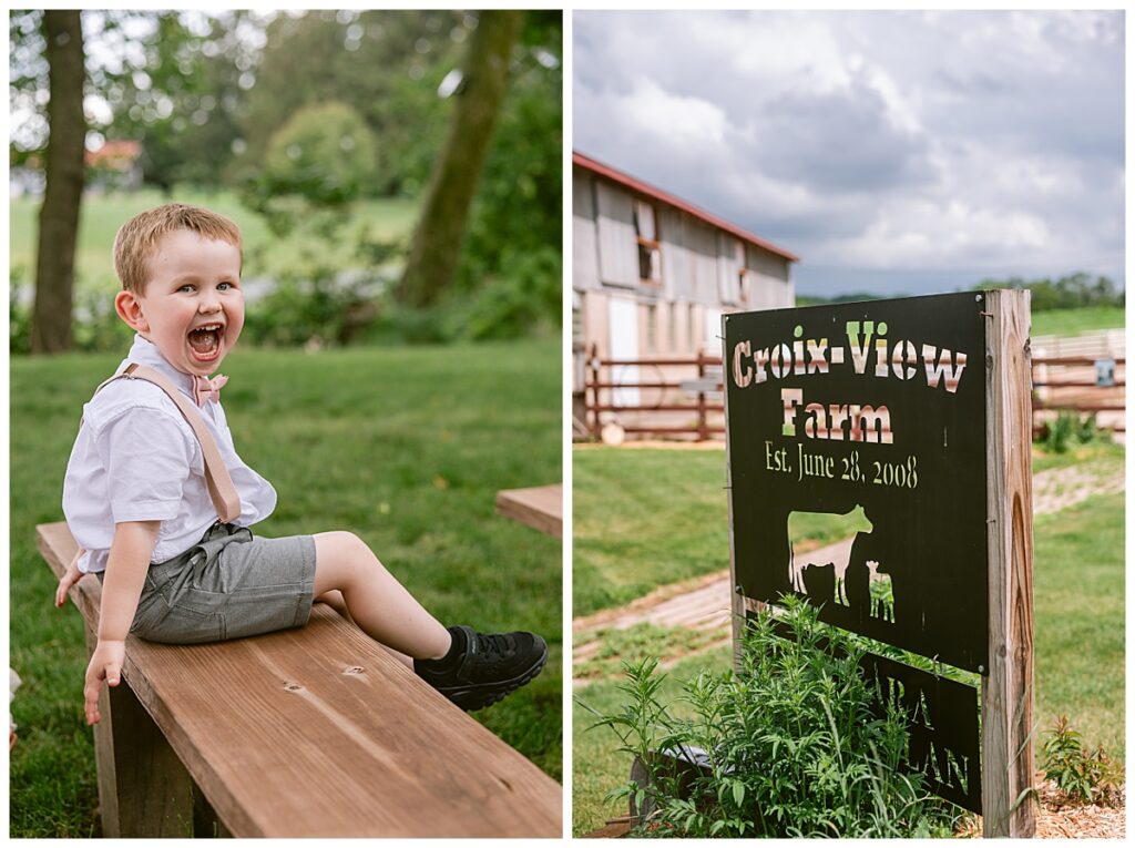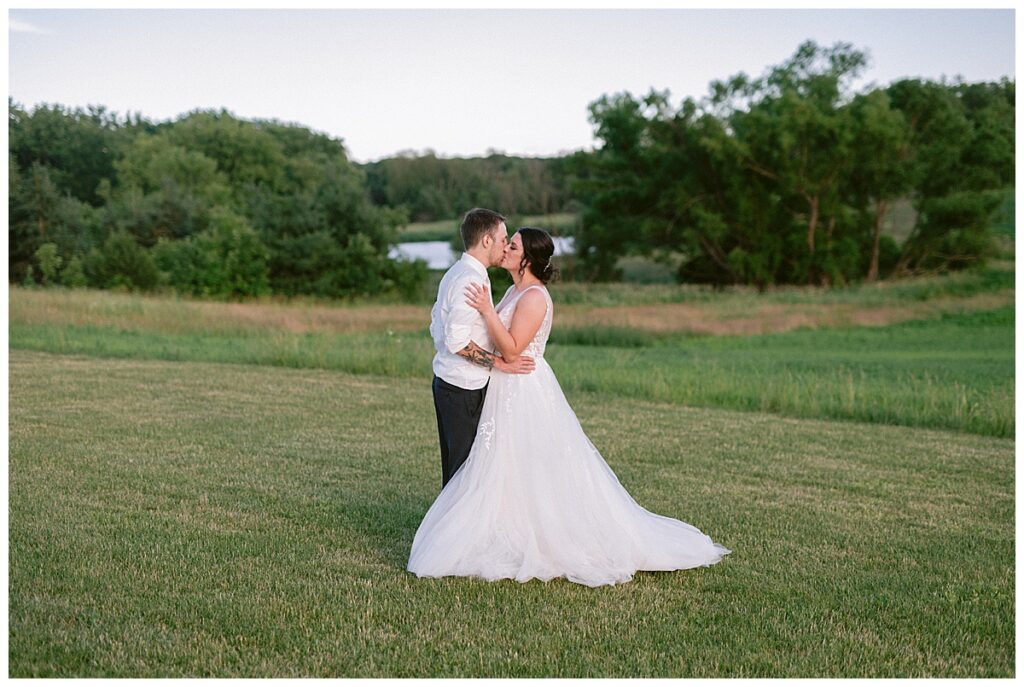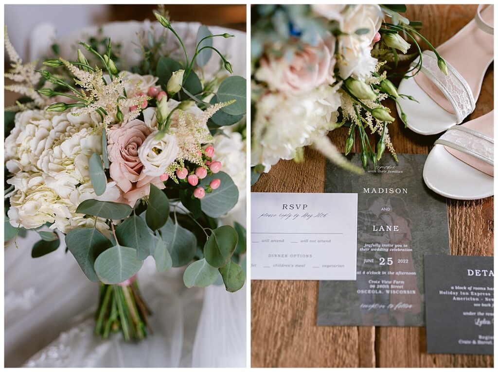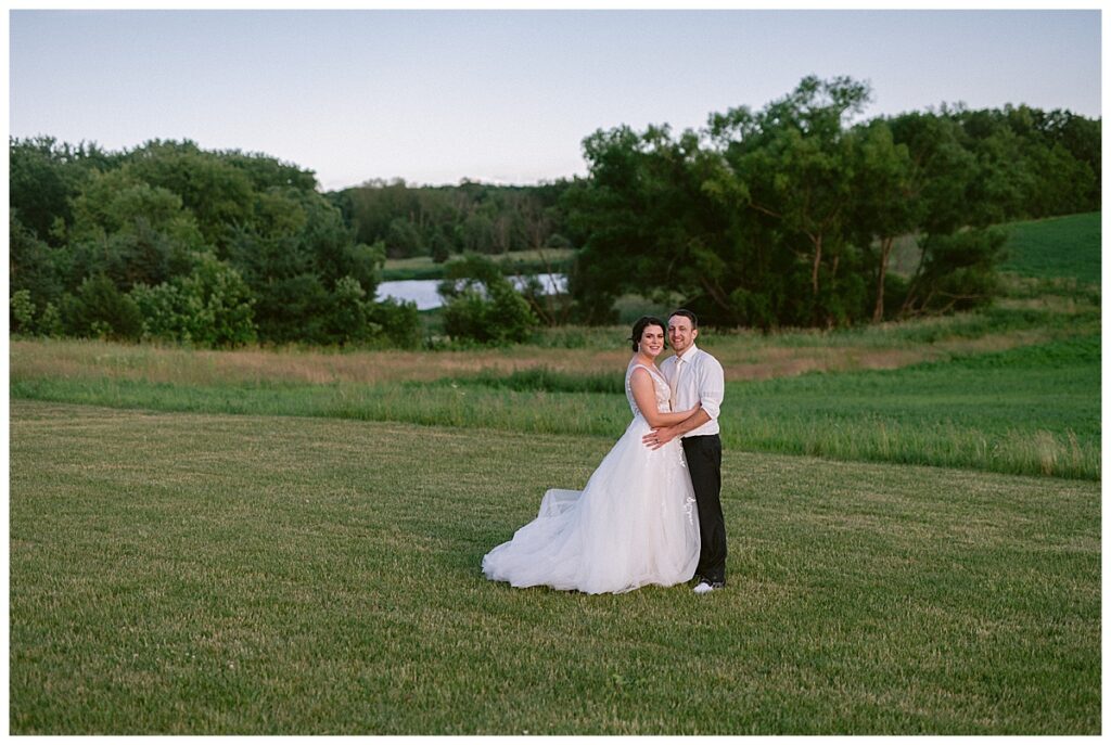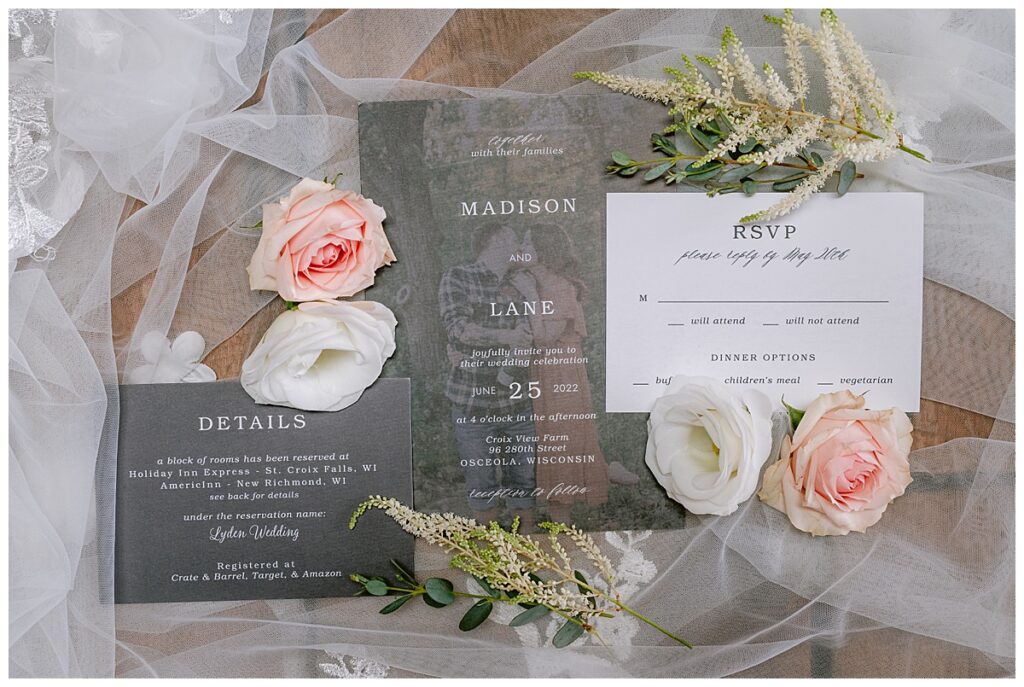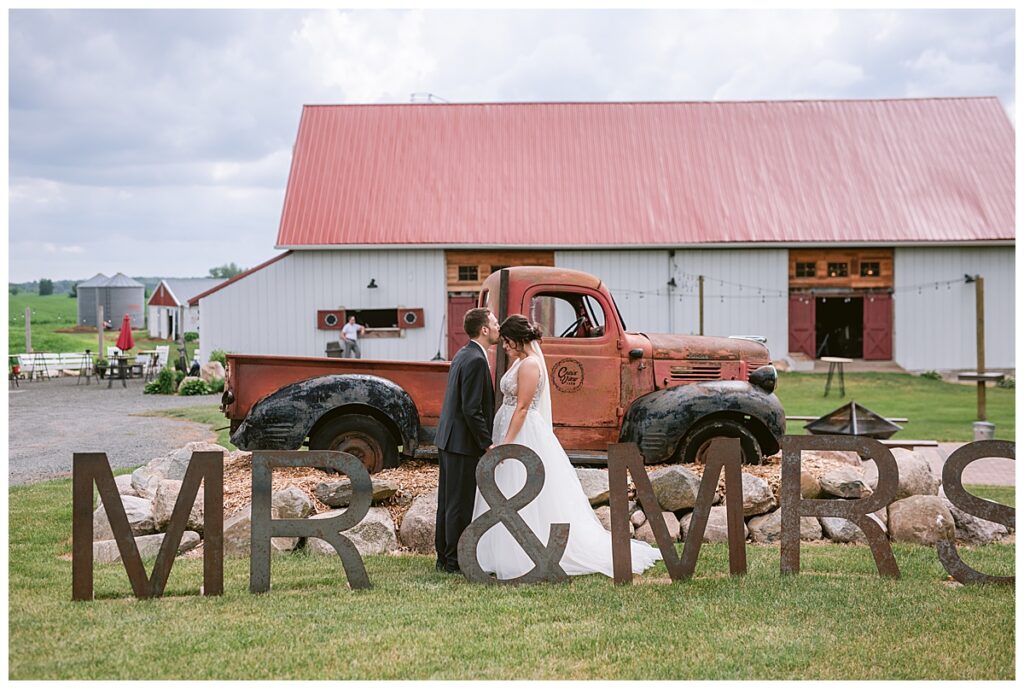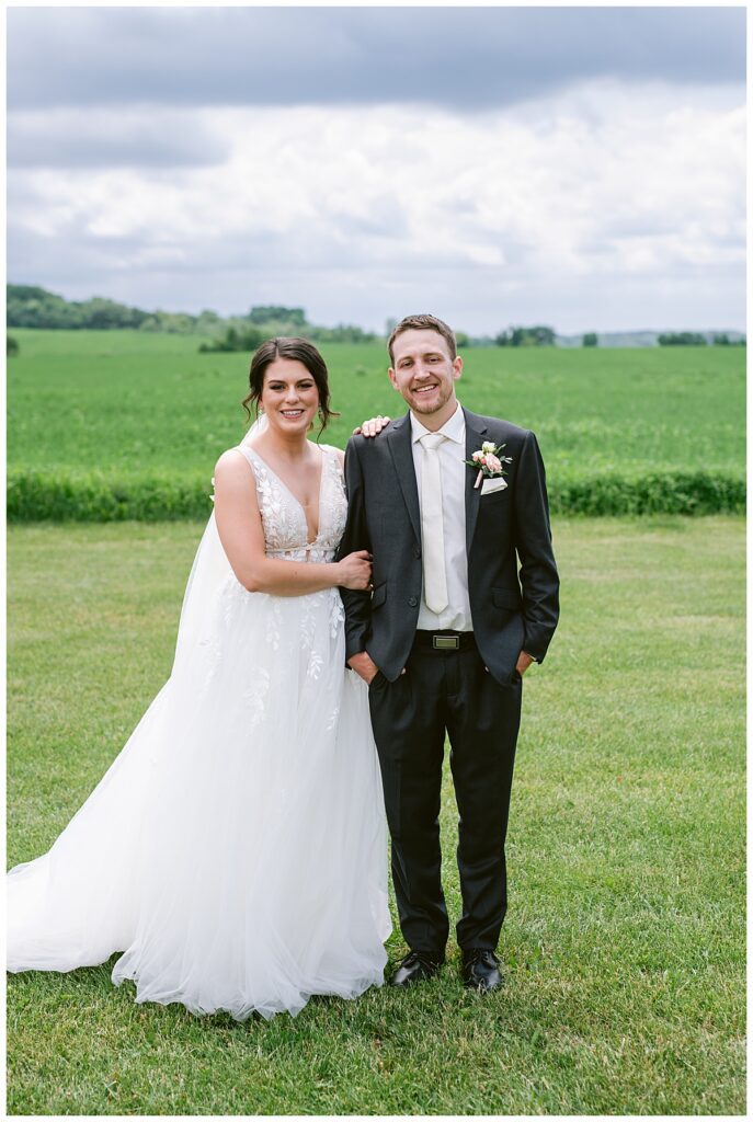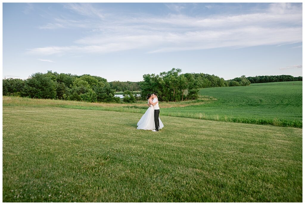 Friends and family traveled from all over the United States and even the United Kingdom to celebrate with Madison and Lane. The two were wed at the beautiful Croix View Farm in Osceola, Wisconsin. One of their close family friends officiated the ceremony as they exchanged rings from Shane Co and celebrated with a tasty meal from We Cater To You, a catering company Madison worked at in college! We Cater To You also provided the stunning cake and Studio Veil brought the guests to the dance floor. The couple spent time creating signs and decorations that could be used later on and chose to have their guests sign corn hole boards as their personal guest book and guests used the fun photo book from Studio Veil to remember the day. KAS films captured the day beautifully and the day ended with a stunning sparkler exit on the farm.