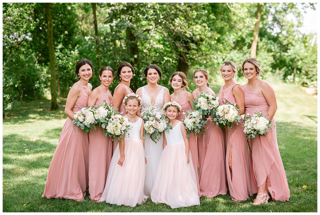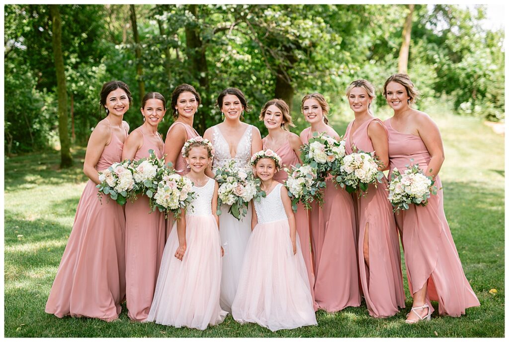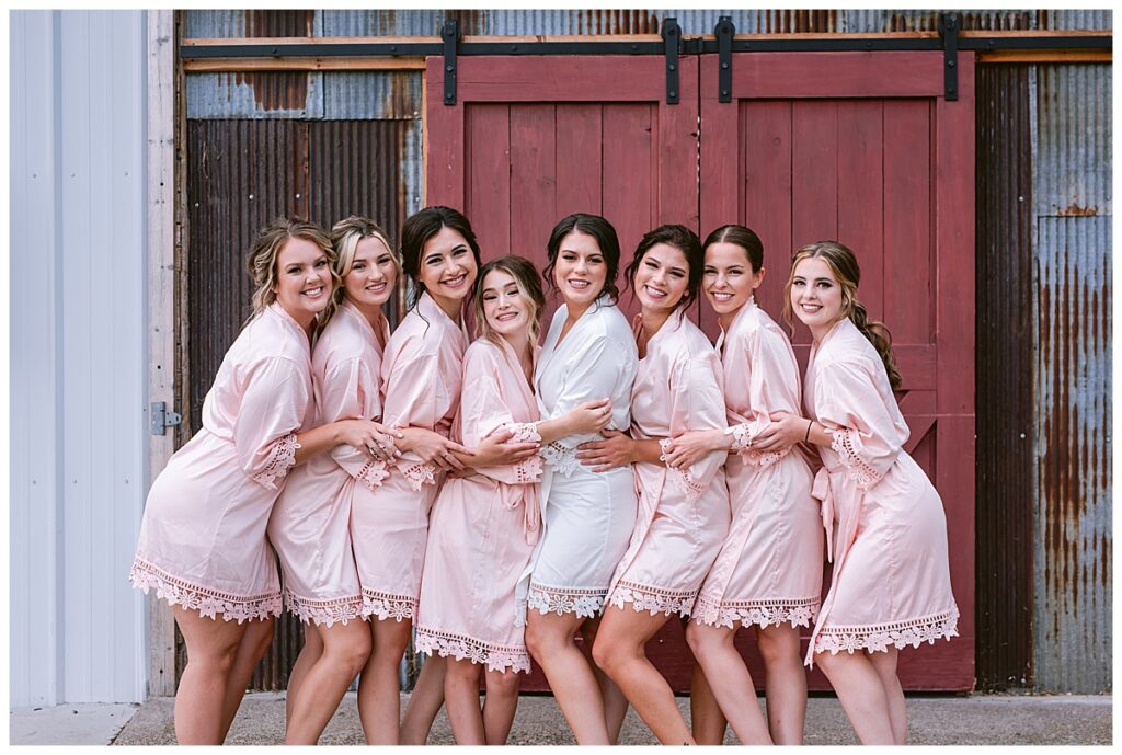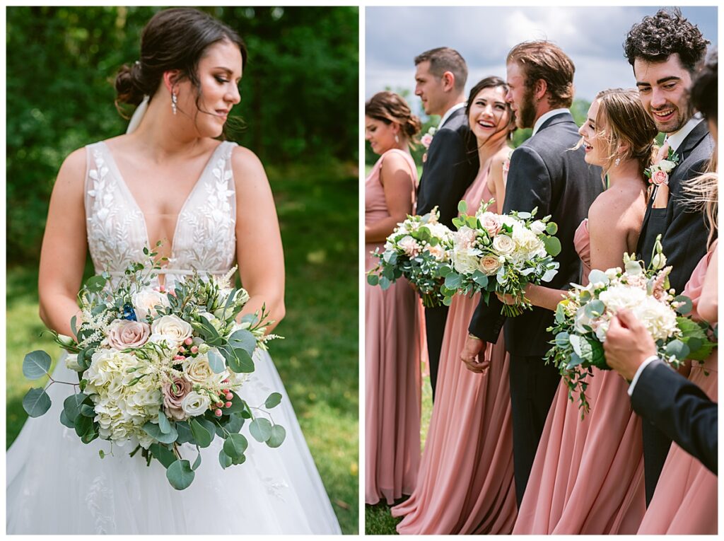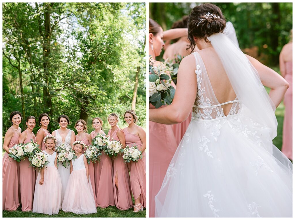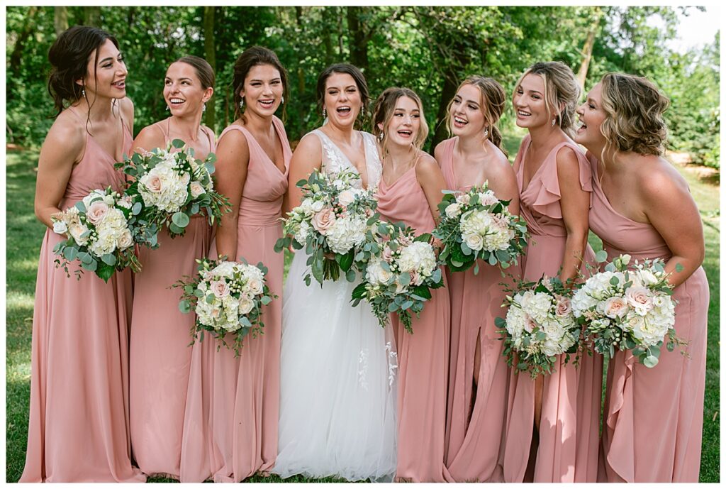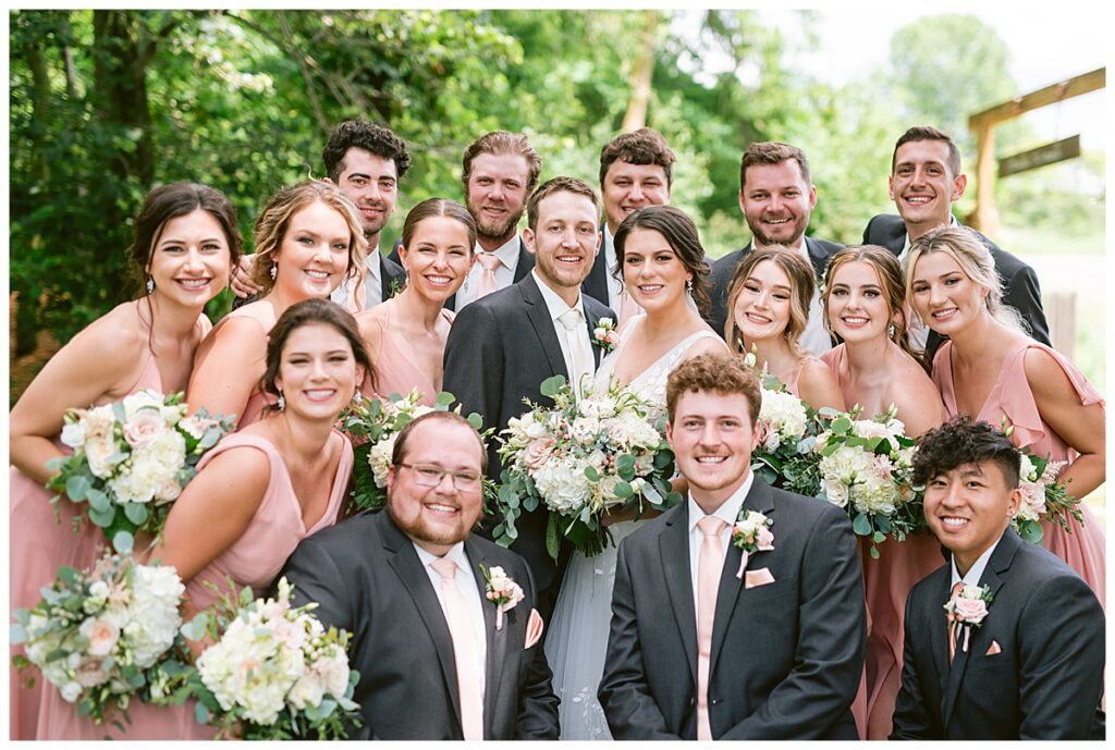 Their beautiful summer day began with hair and makeup done by the talented team of SM Hair and Makeup and kicked off the morning with mimosas and toasts in their match robes. They day continued as Madison slipped into her Justin Alexander dress from Our Shop Bridal. The bridesmaids wore beautiful desert coral dresses from David’s Bridal and were paired with colorful summer blooms put together by the incredible Jennifer Lageson. Their simple invitations from Magnet Street were the perfect foretaste of how the day would be. to Lane and his groomsmen sported grey suits from the Knights Chamber.